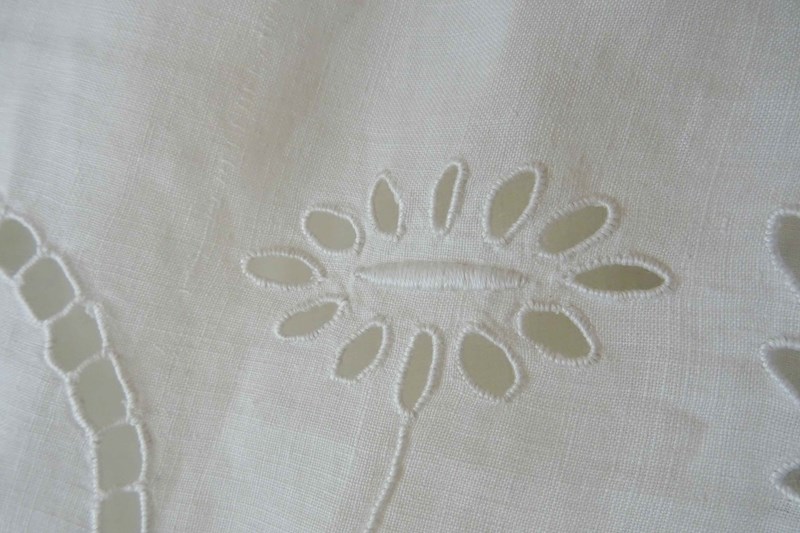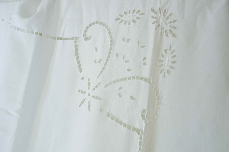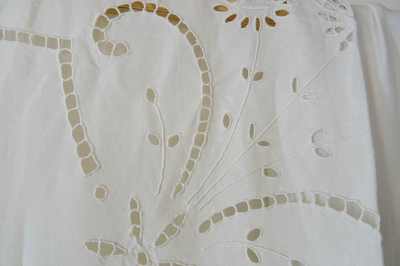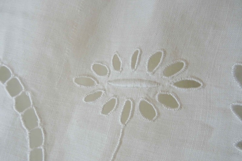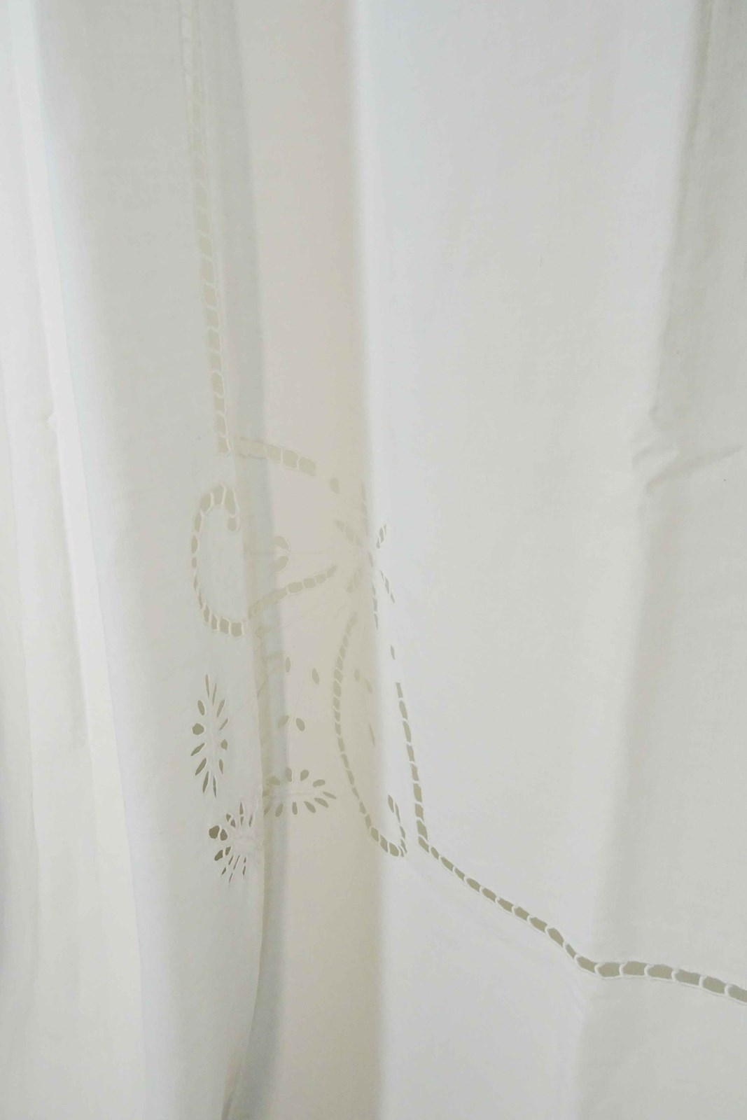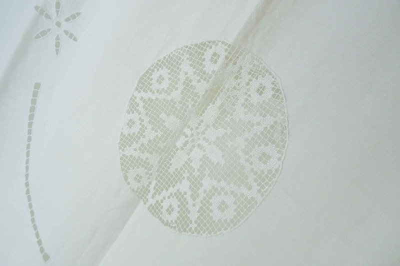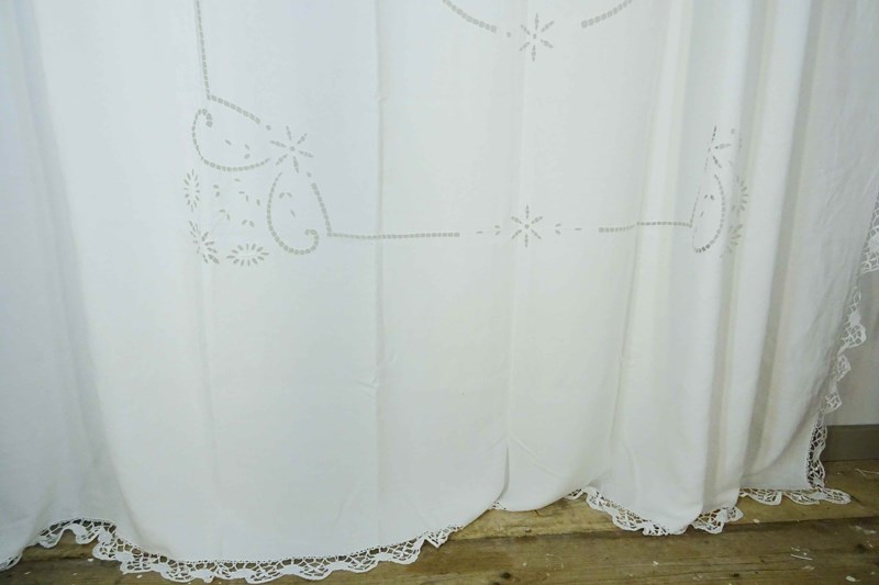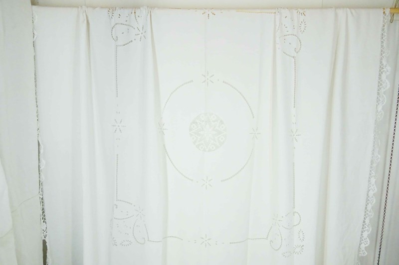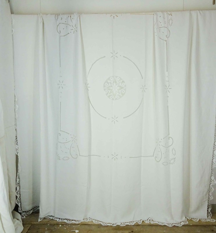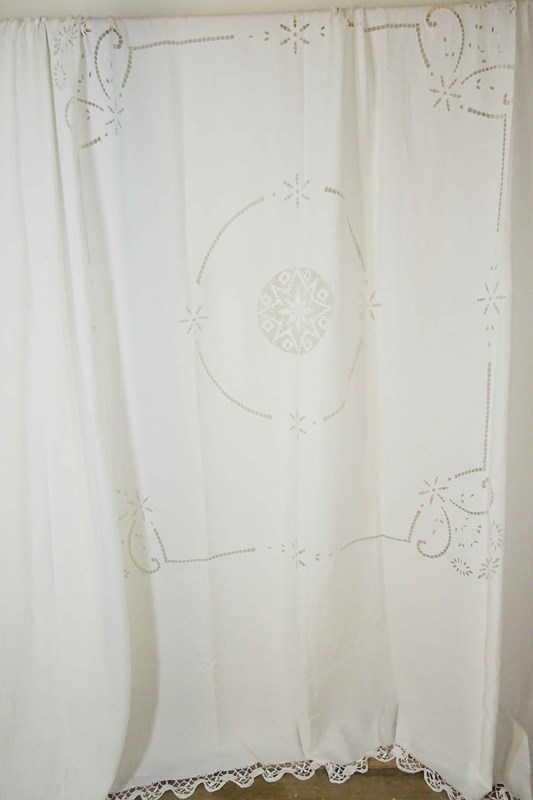 Just lovely!  A hand stitched vintage French linen bedspread or tablecloth that will also make a beautiful voile curtain.