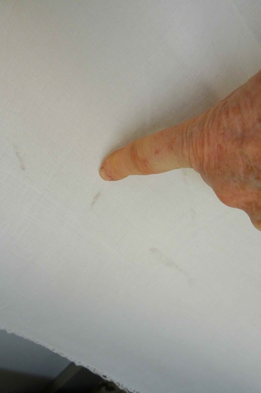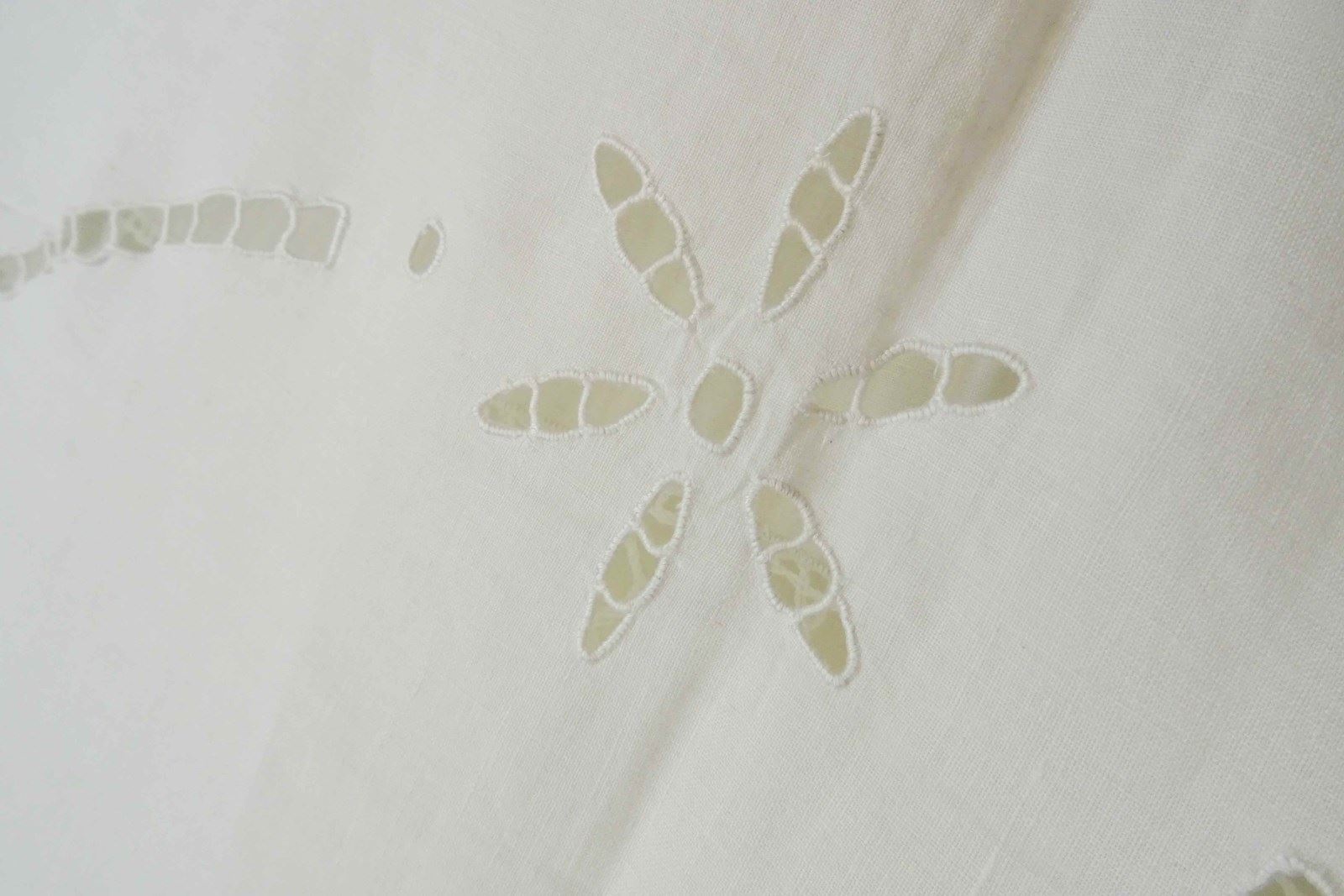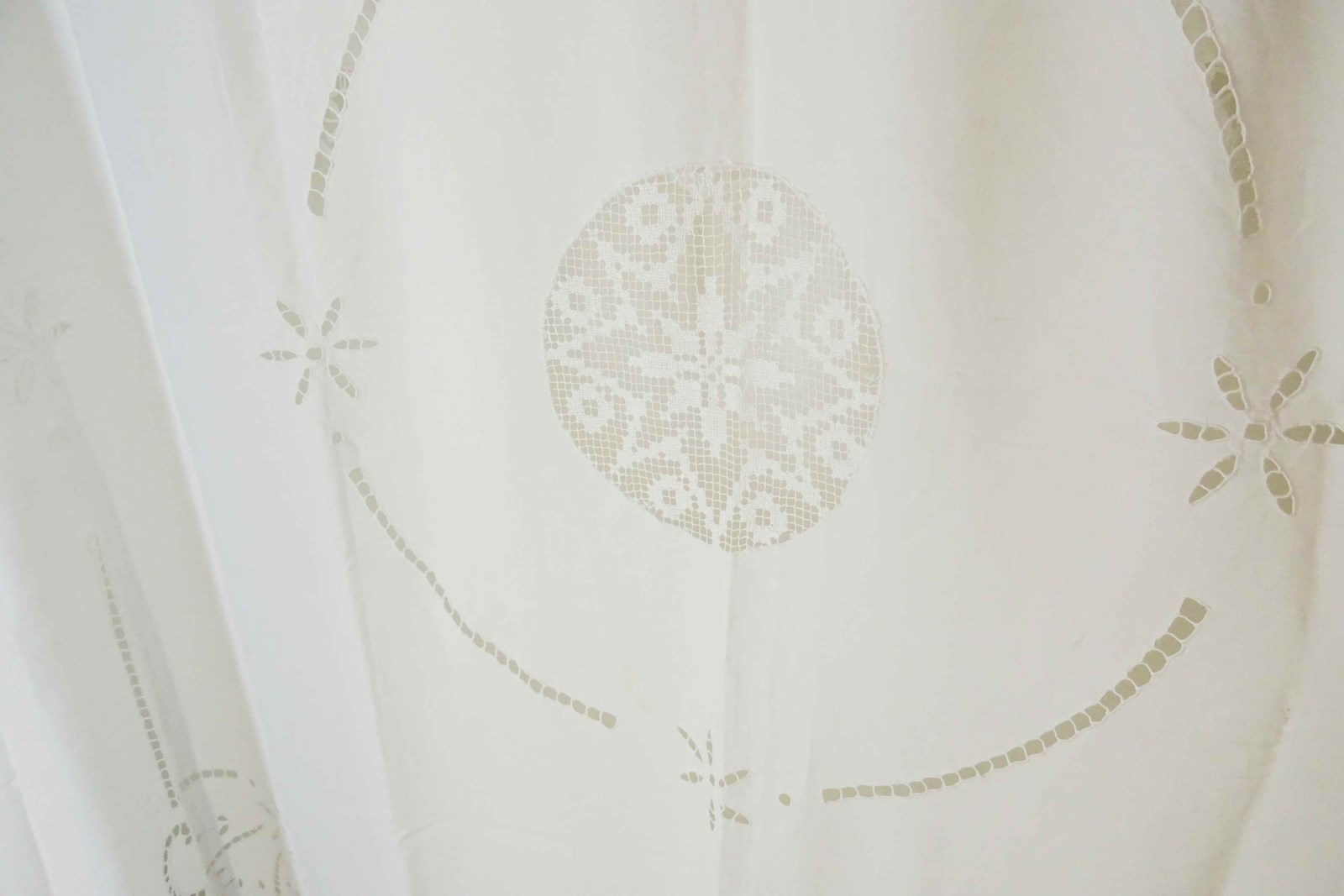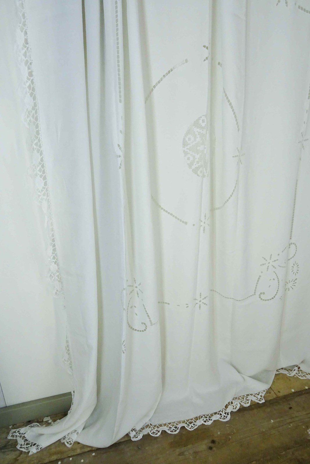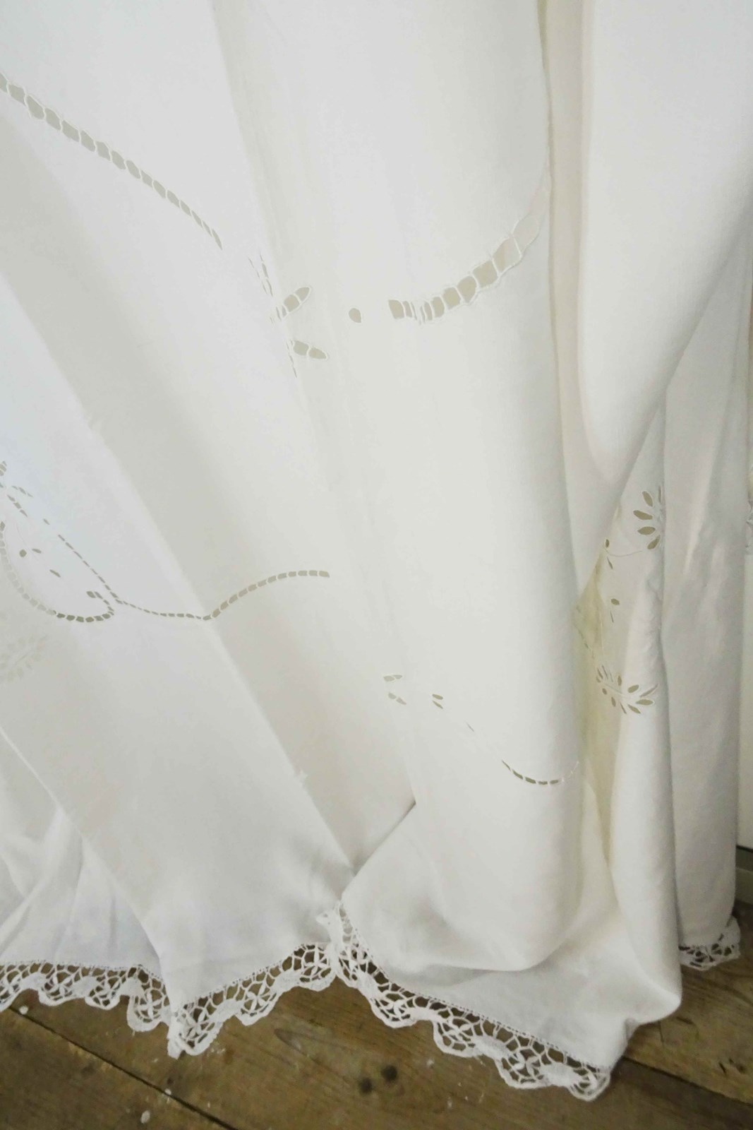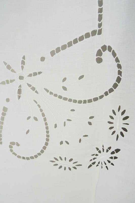 Just lovely!  A hand stitched vintage French linen bedspread or tablecloth that will also make a beautiful voile curtain.