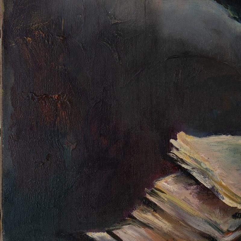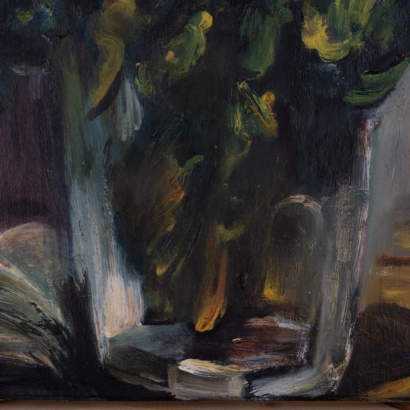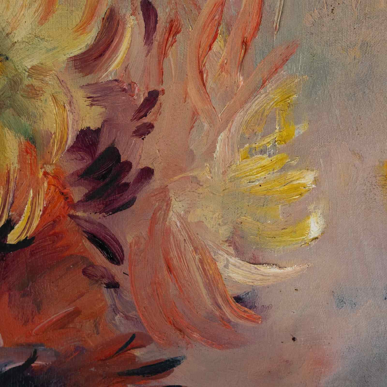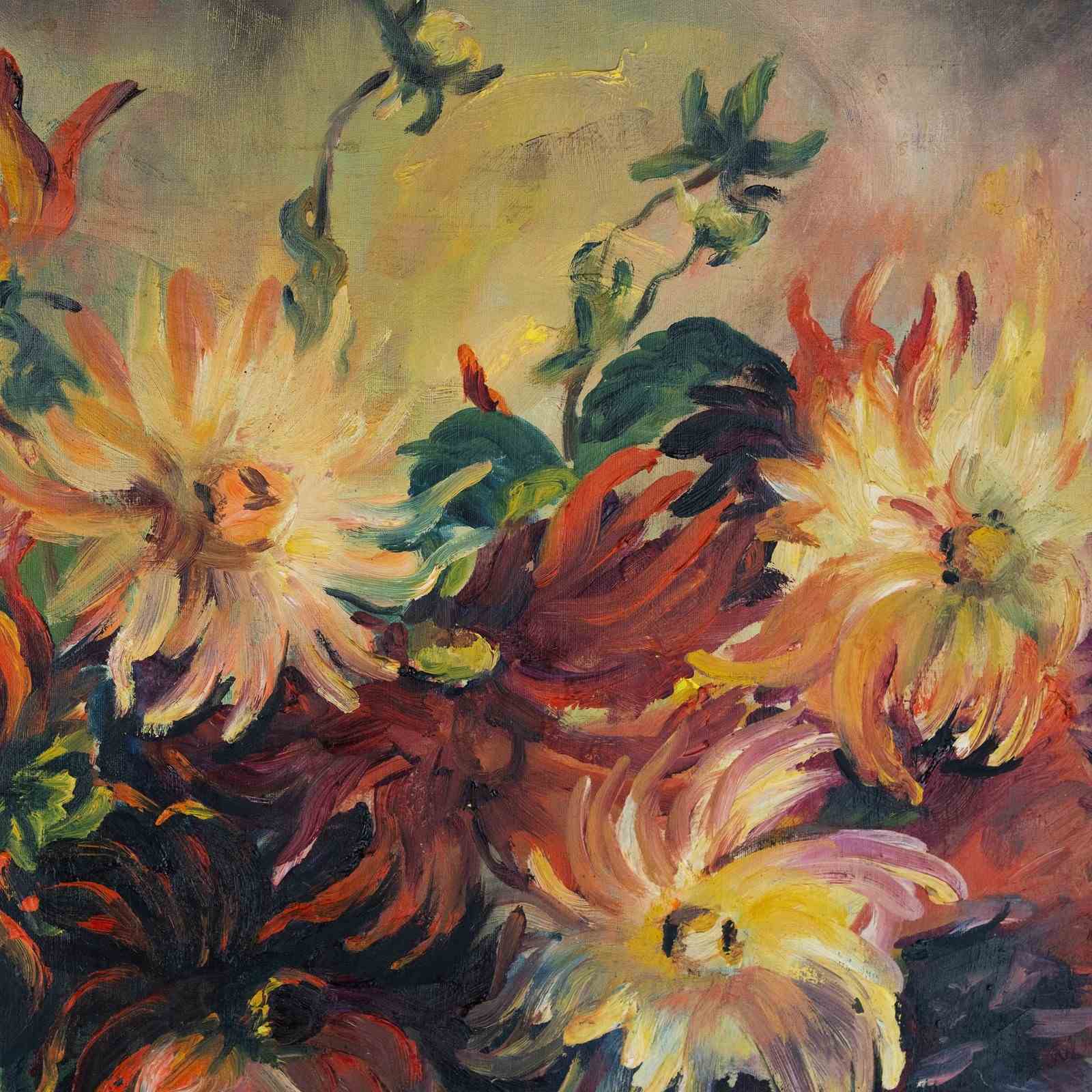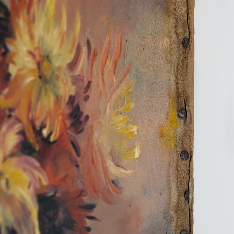 Fab large French oil painting of dark and luscious dahlias filling the canvas. A substantial, stylish piece.