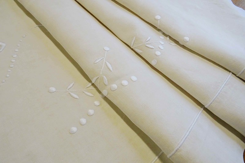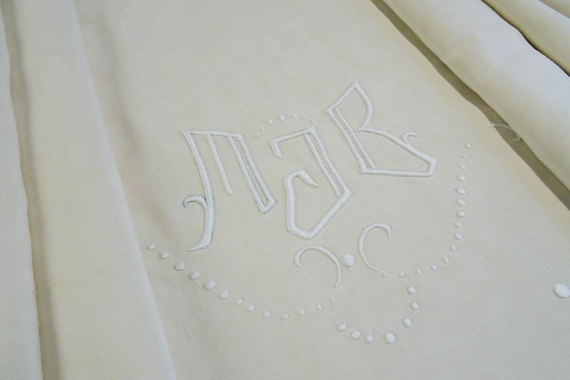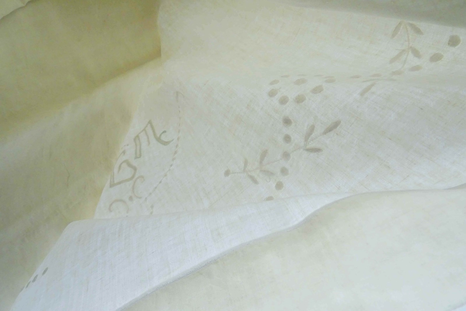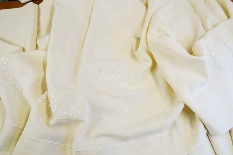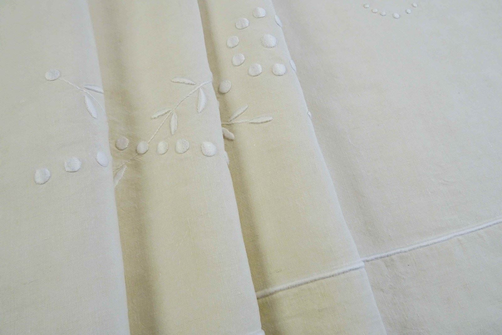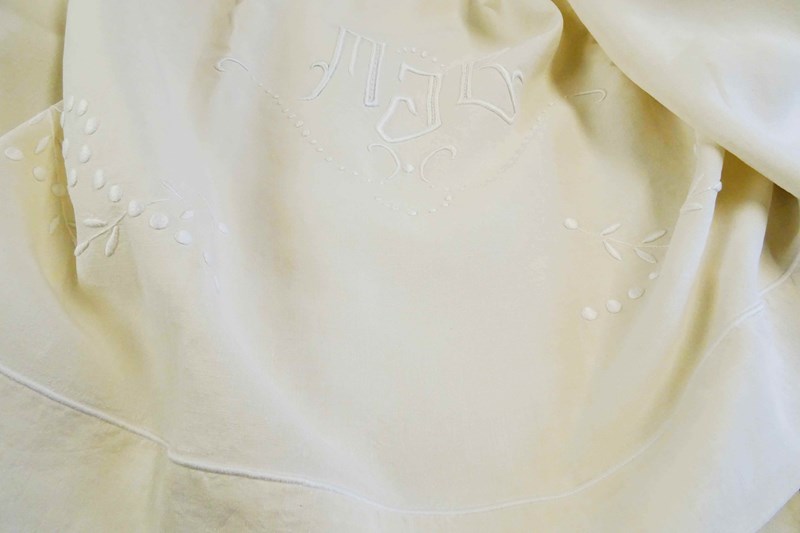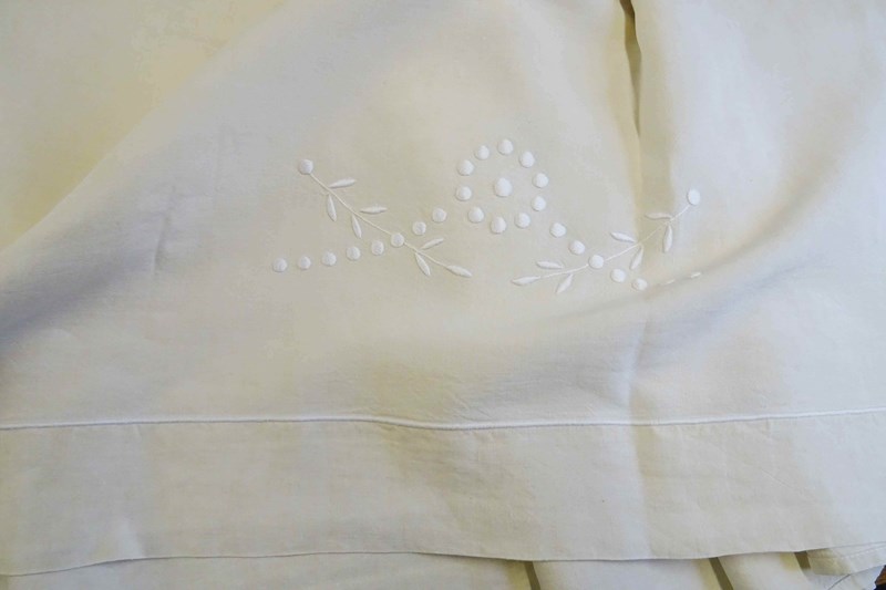 A beautiful large vintage French pure linen sheet - a delightful find with such pretty decoration. A satin stitch hem sits below a hand stitched triple monogram embellished with dots and leaves.