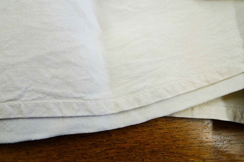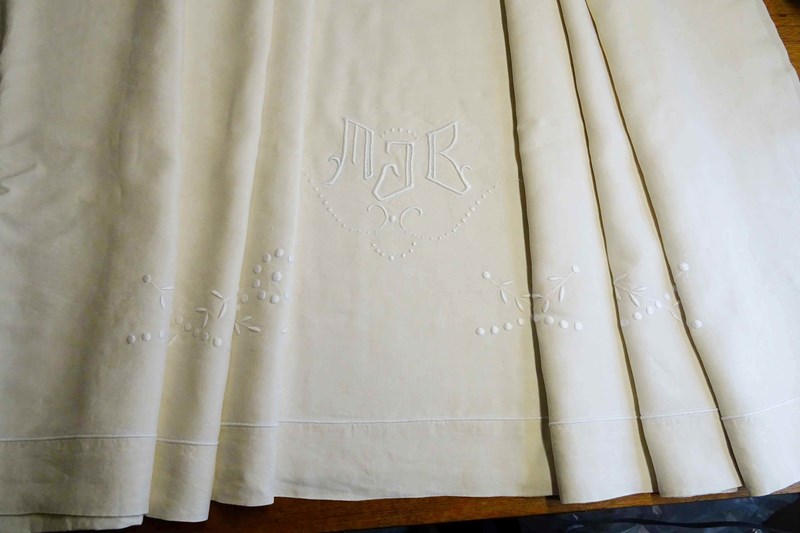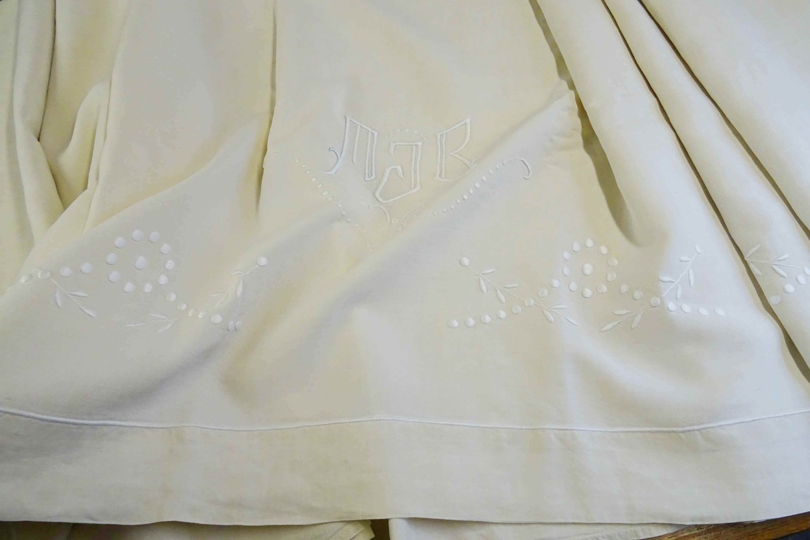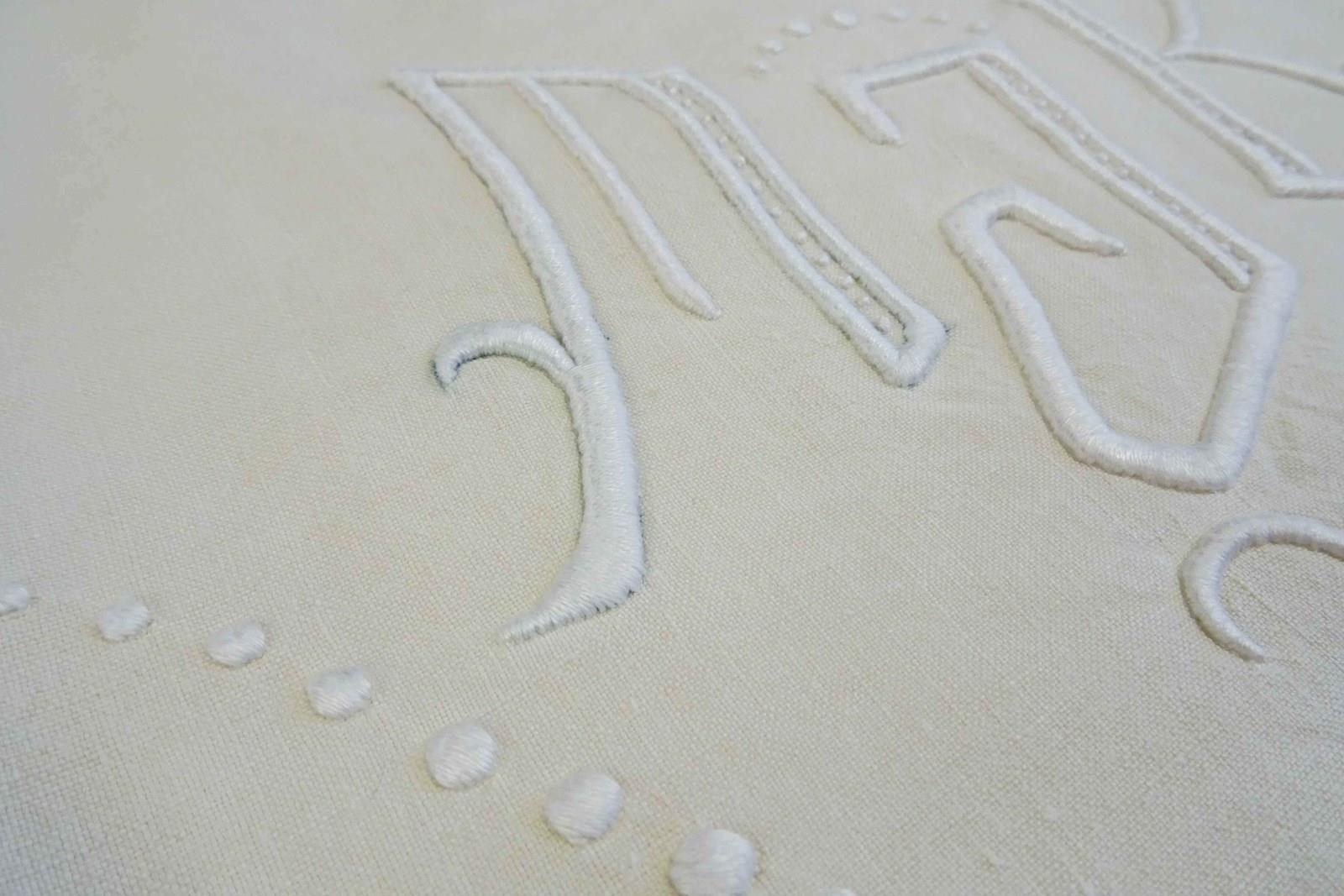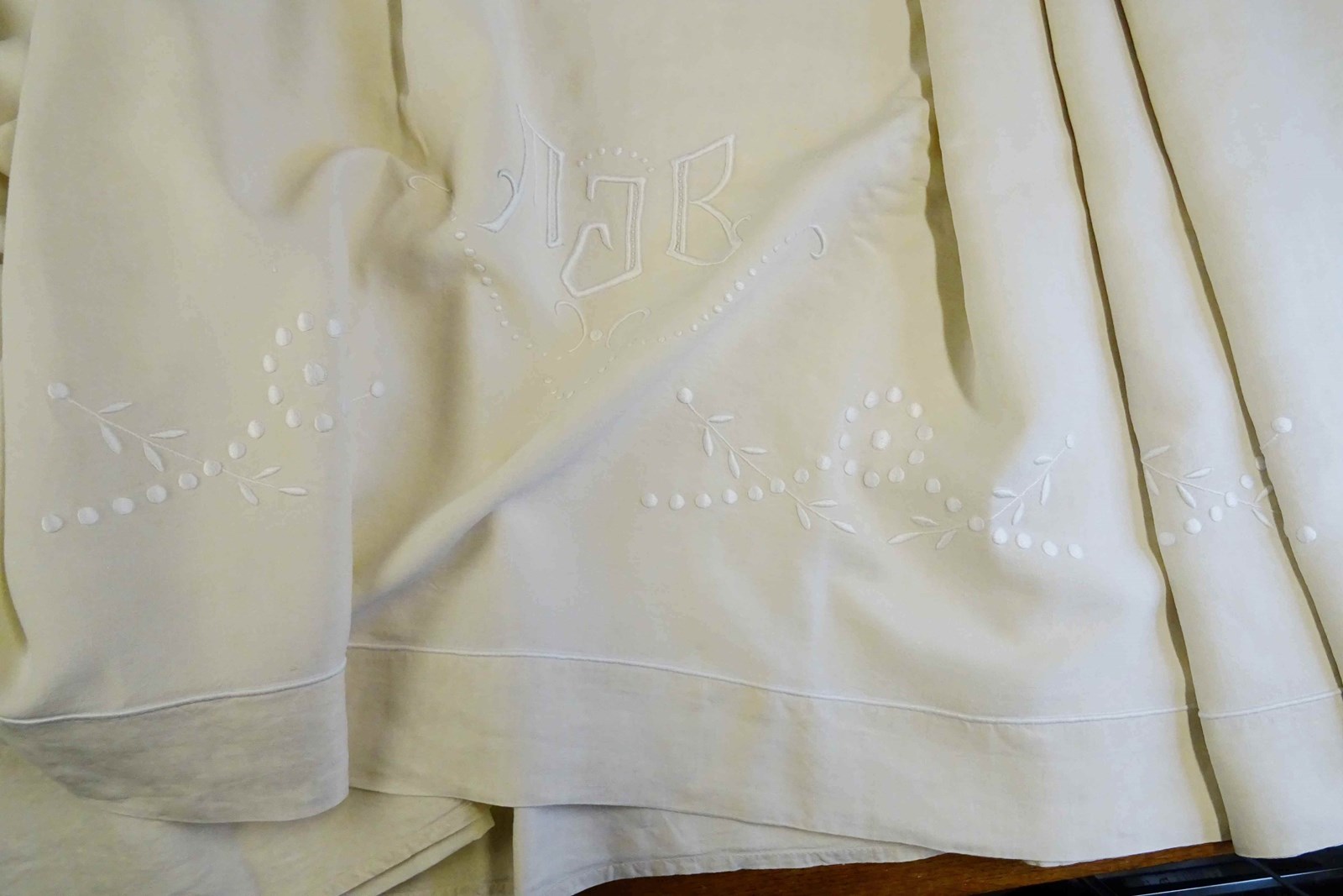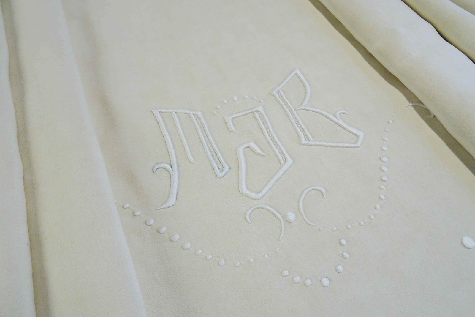 A beautiful large vintage French pure linen sheet - a delightful find with such pretty decoration. A satin stitch hem sits below a hand stitched triple monogram embellished with dots and leaves.