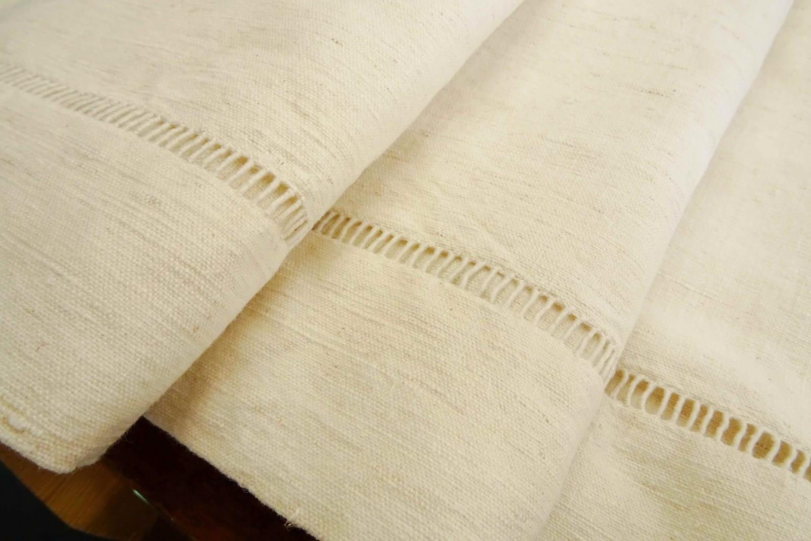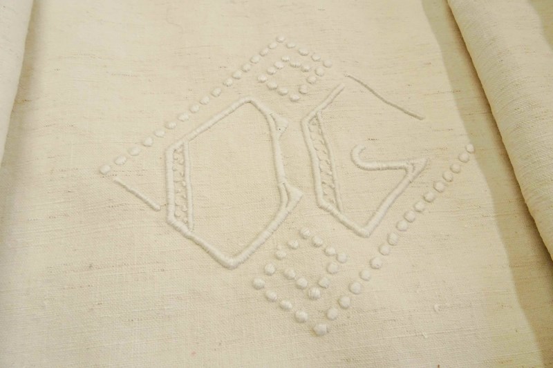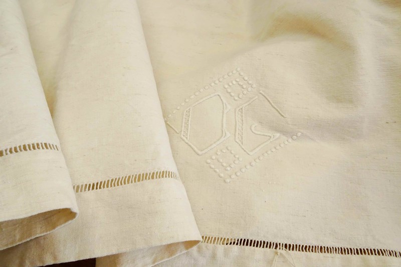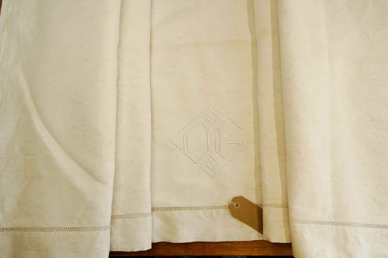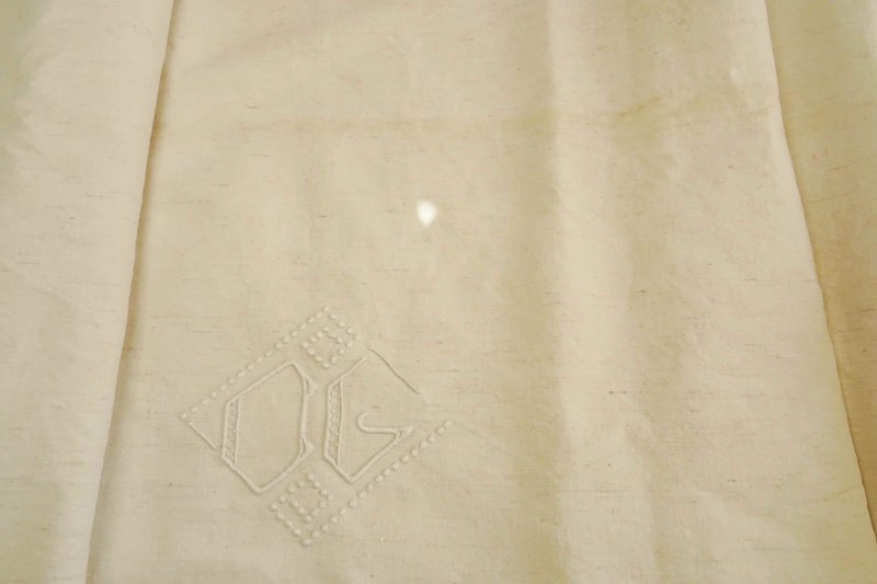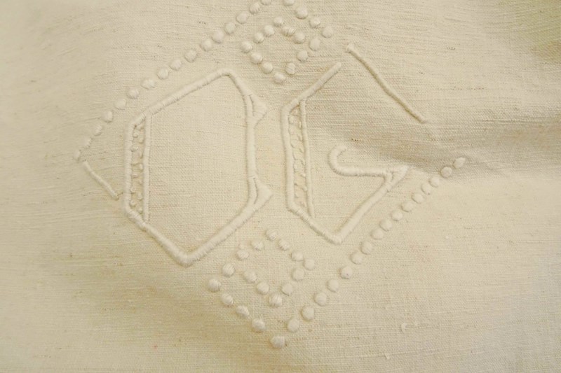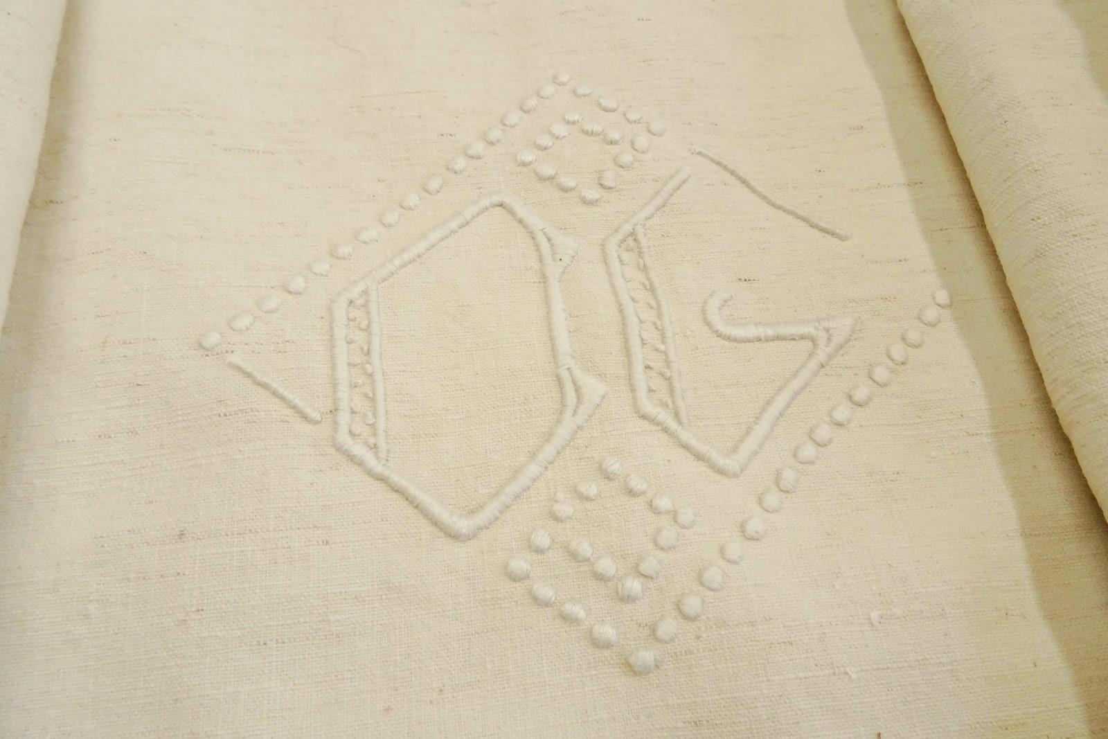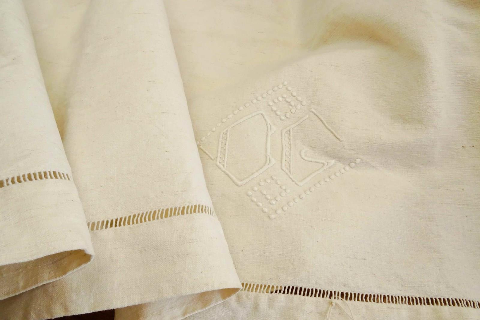 This is lovely hand stitched chunky but soft linen metis. A pale oatmeal/off white colour (not yellowy) with a hand stitched monogram of the letters DG set above a hand wrapped ladder hem. Dating to around the 1930s.
