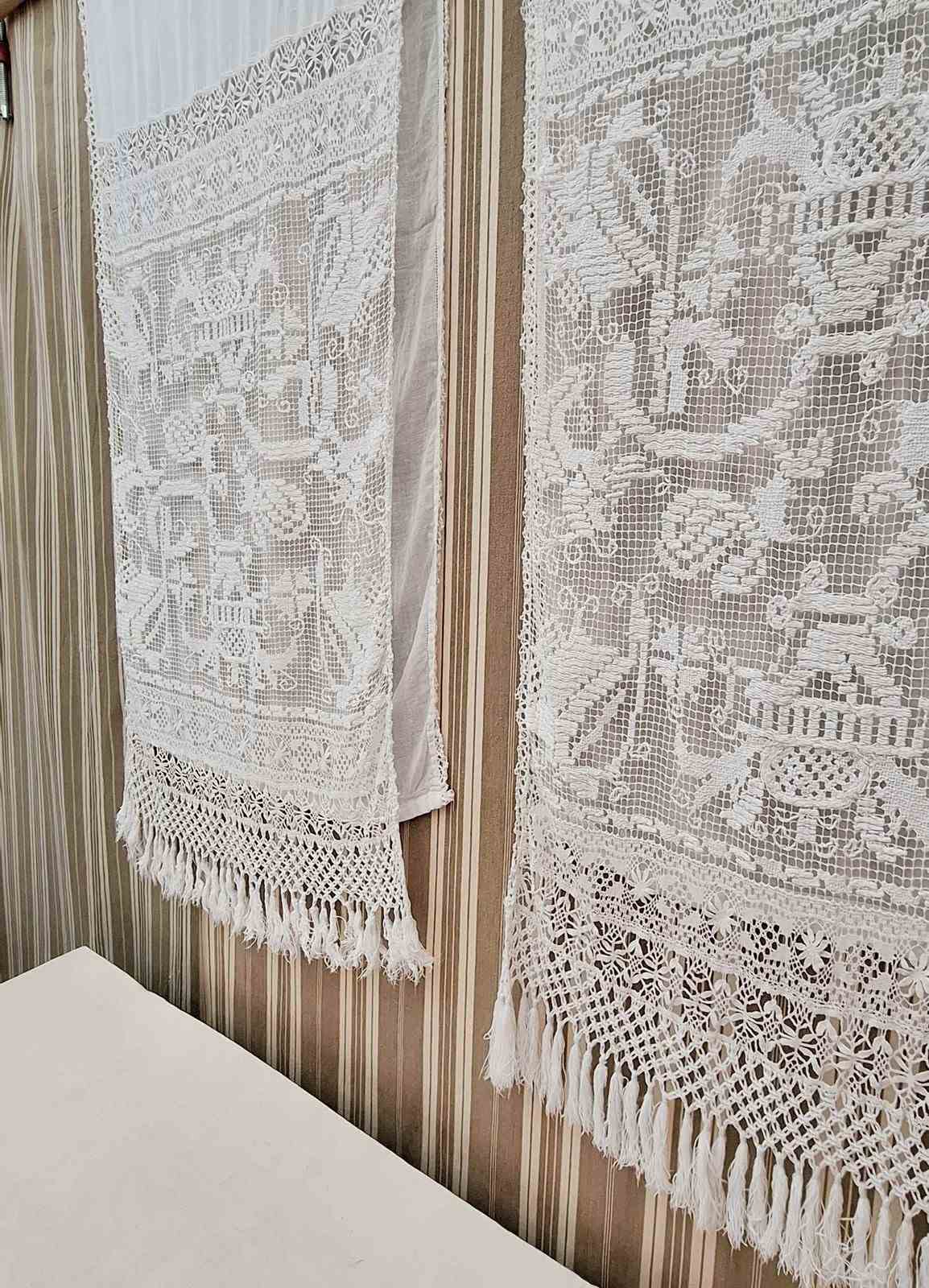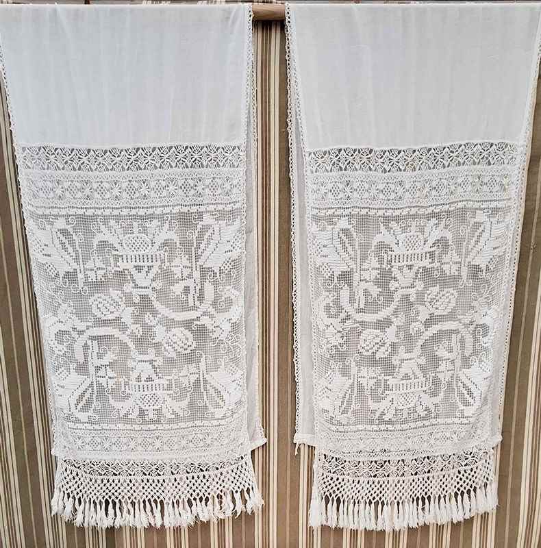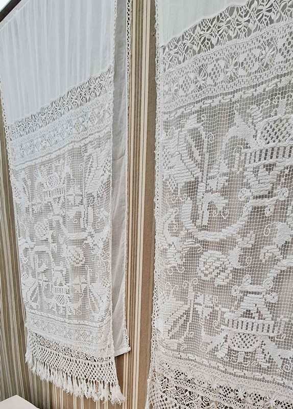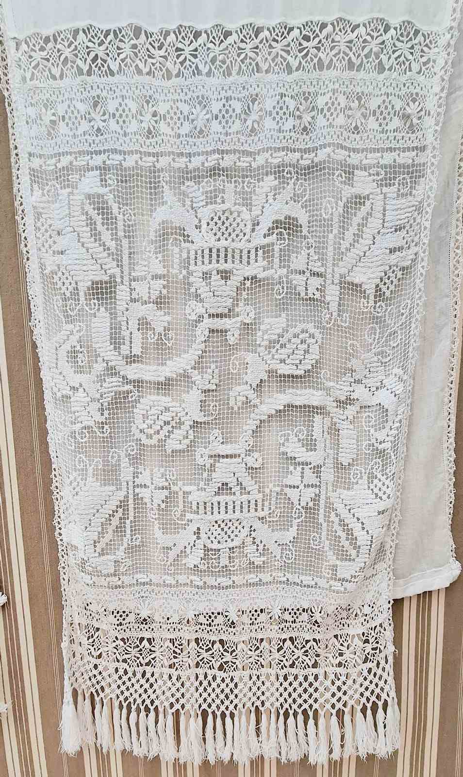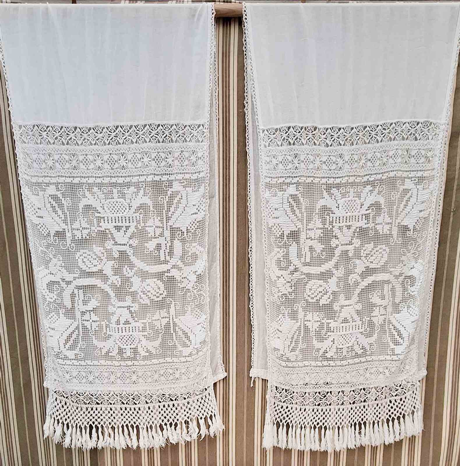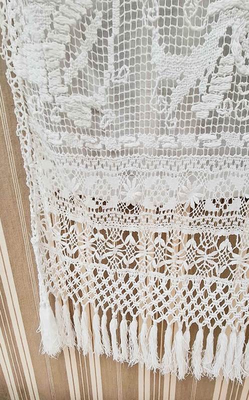 How fab are these going to look, billowing at a window? A pair of vintage French open work and muslin curtains with lovely long tassel fringing at the base and narrow hand made lace all around.