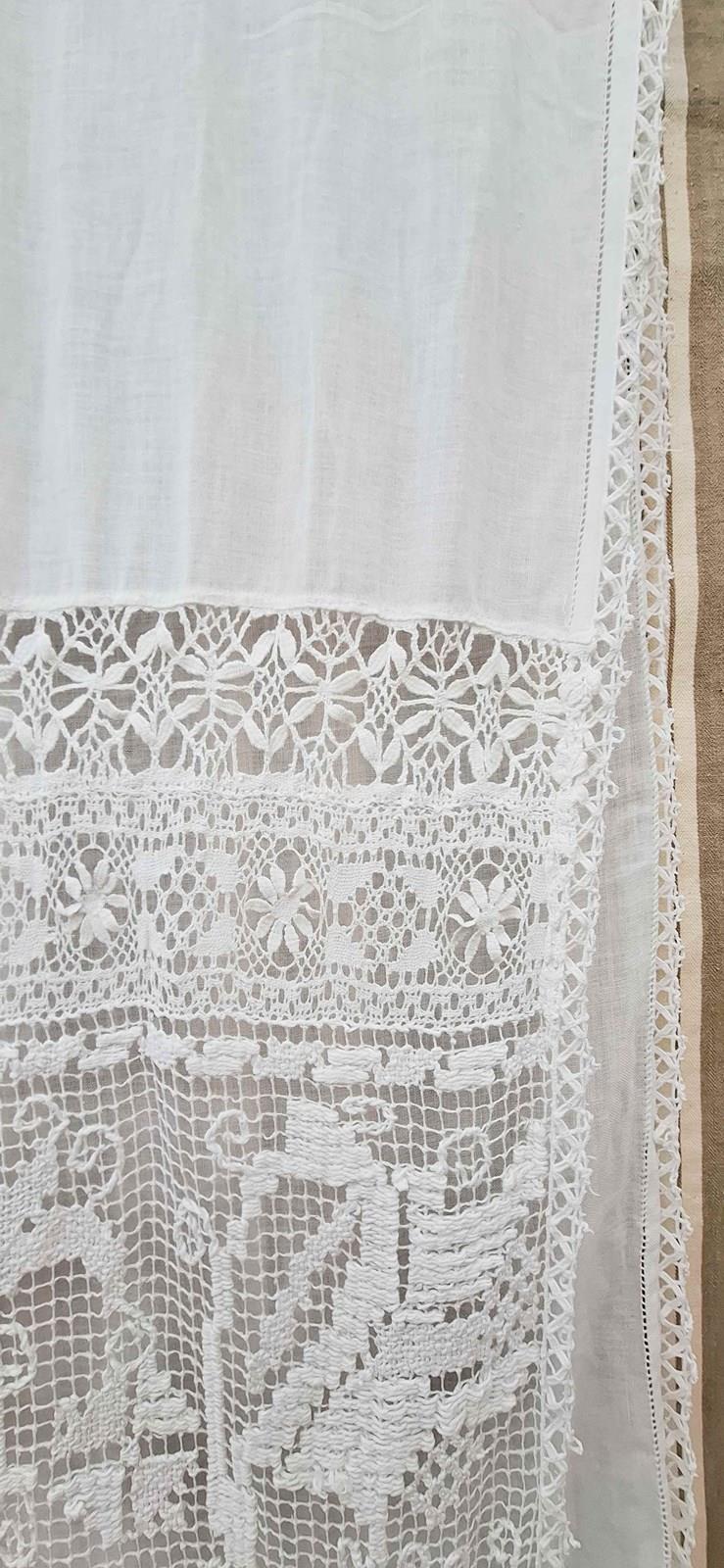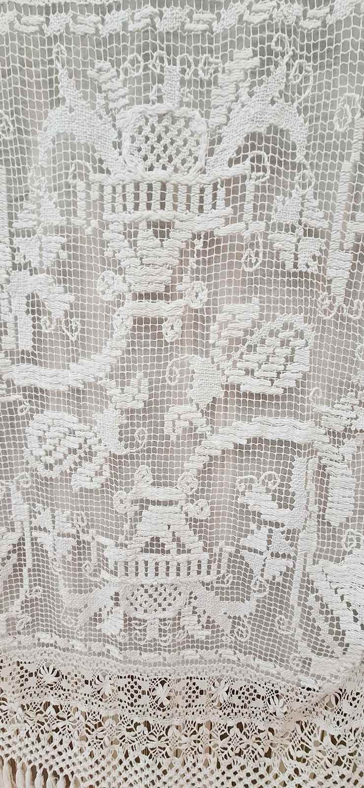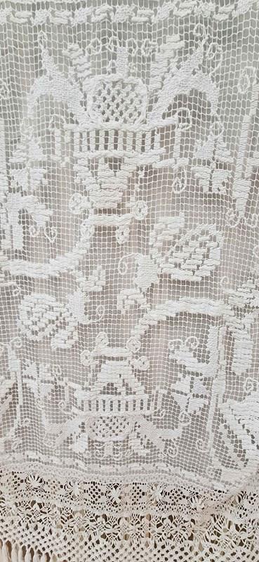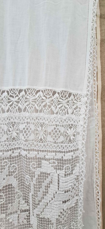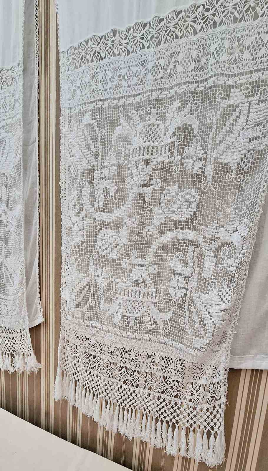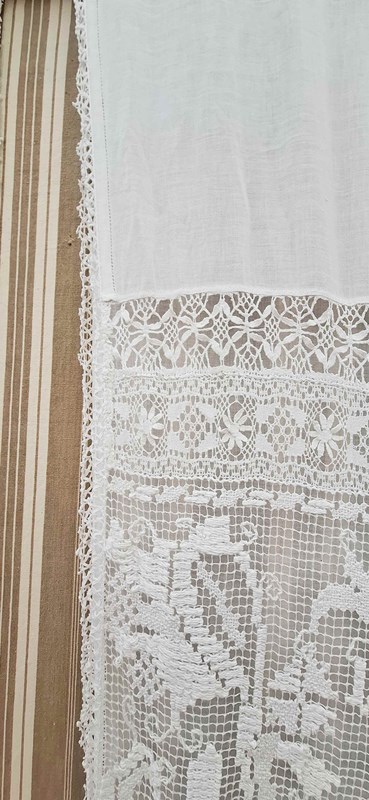 How fab are these going to look, billowing at a window? A pair of vintage French open work and muslin curtains with lovely long tassel fringing at the base and narrow hand made lace all around.