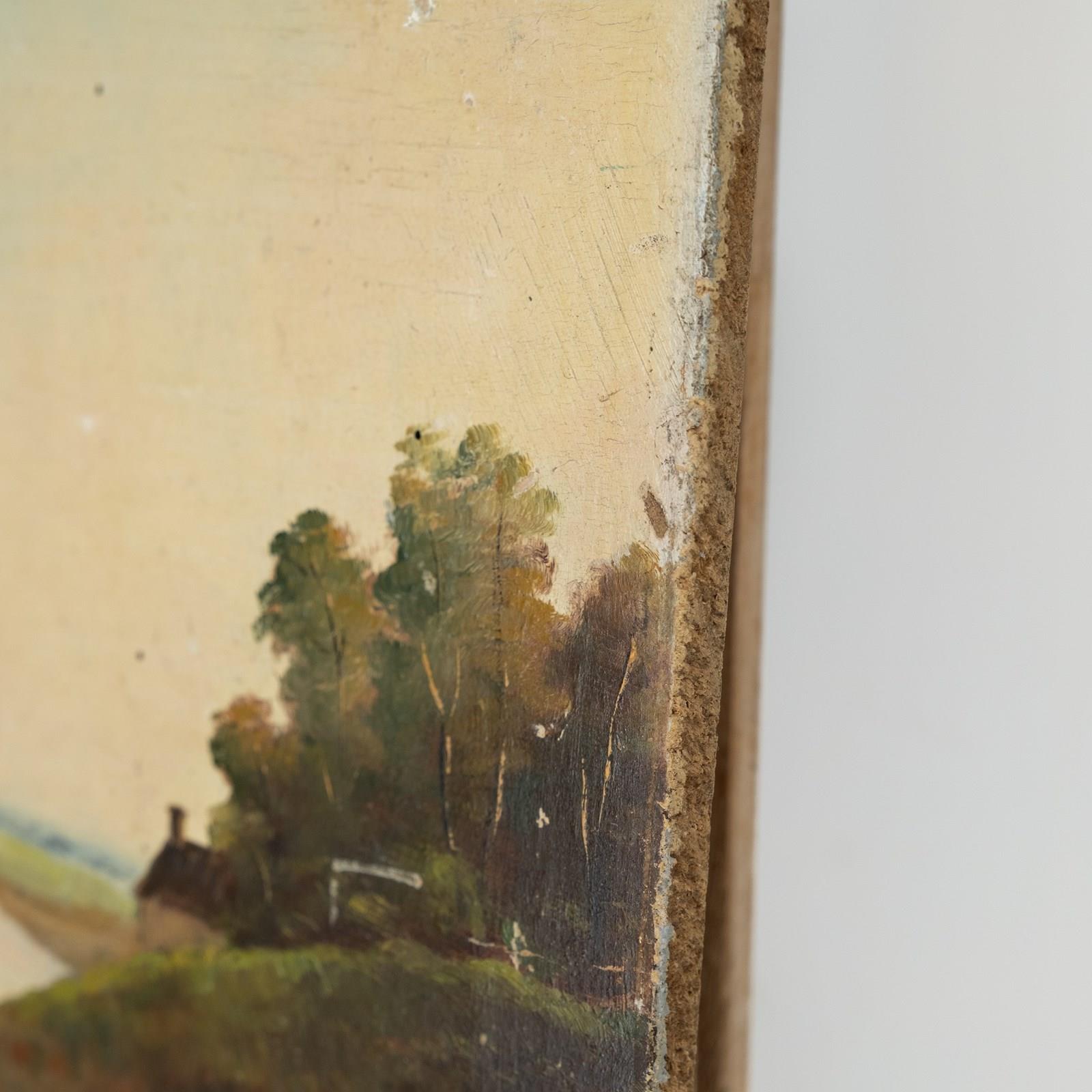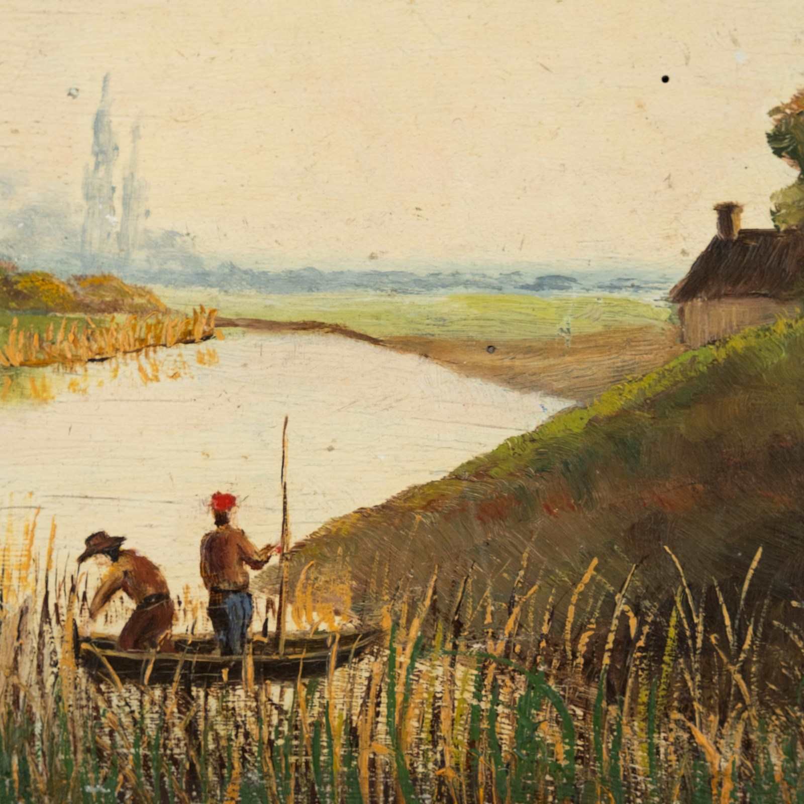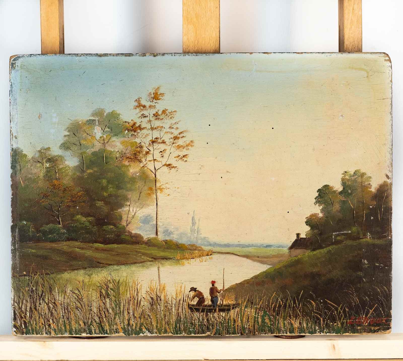 A delightful antique French oil painted onto a thick oak panel. Two fishermen slowly punting through the marshes on a calm and tranquil day - it's such a restful scene!