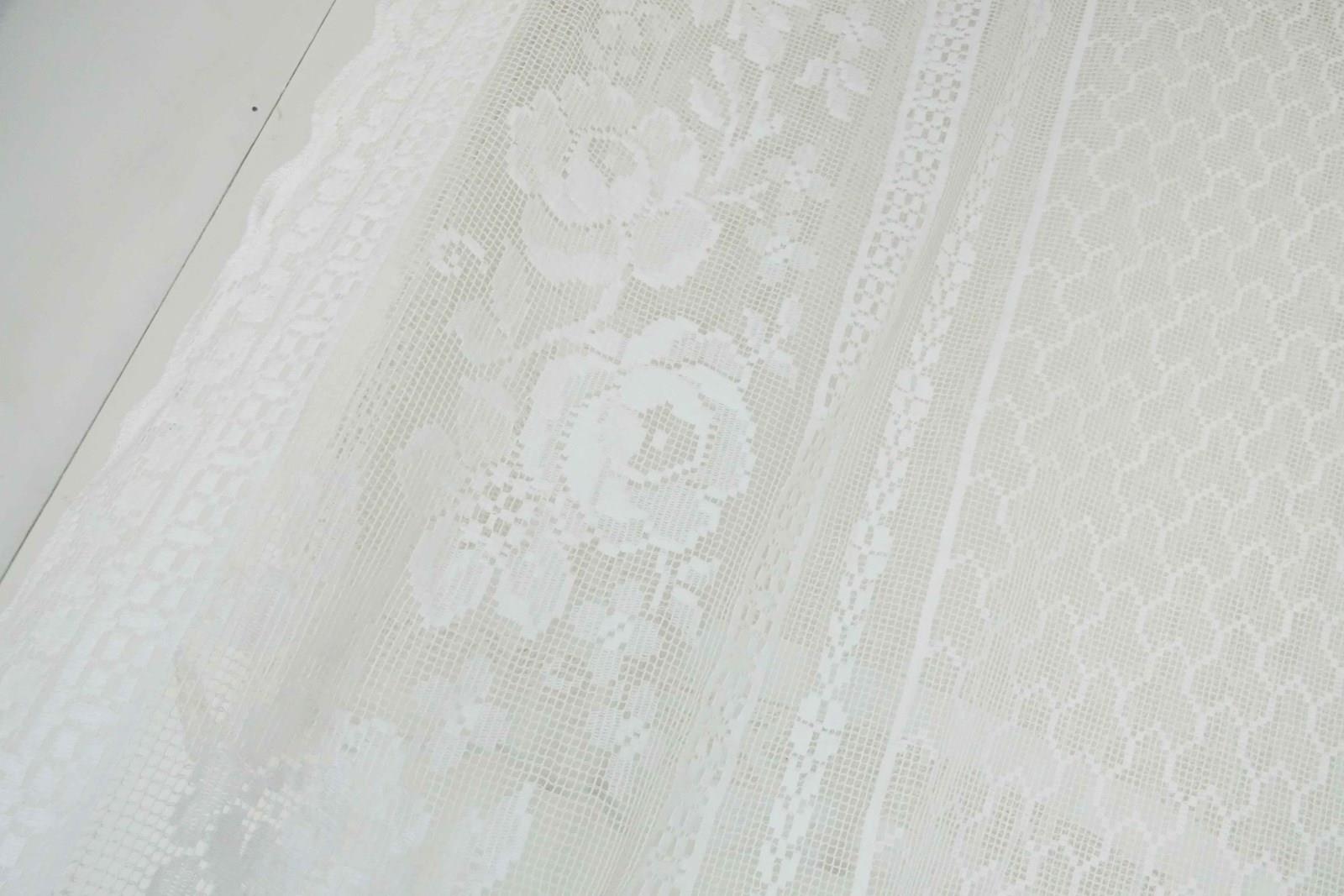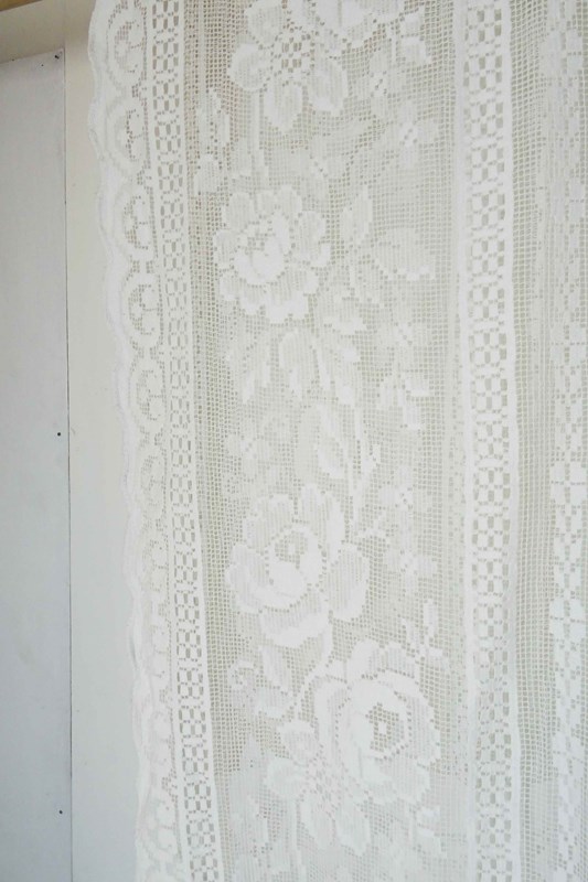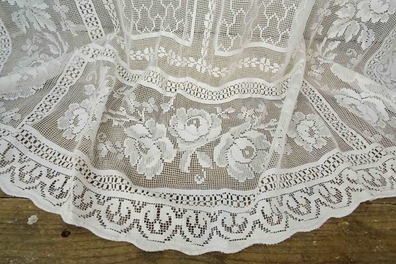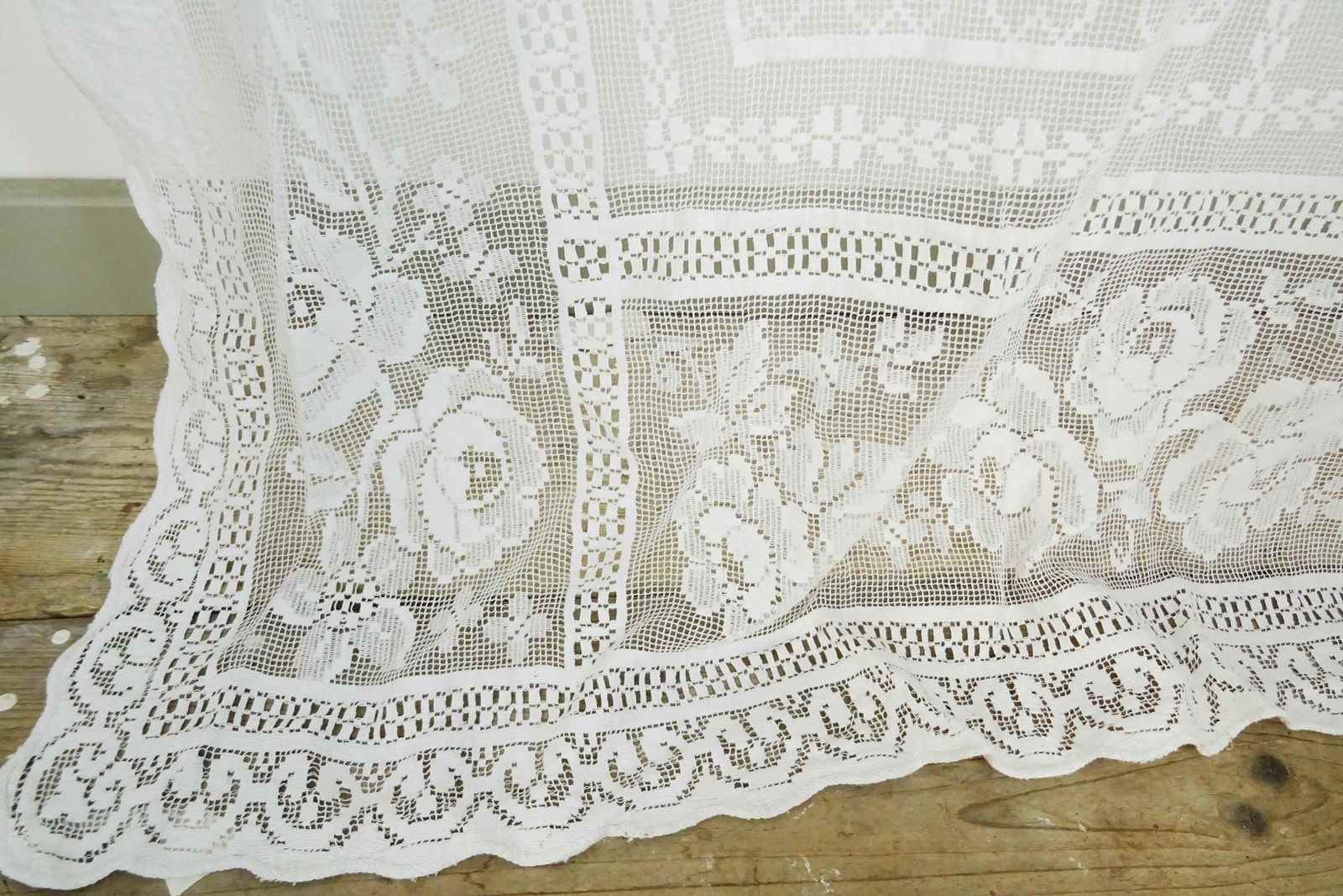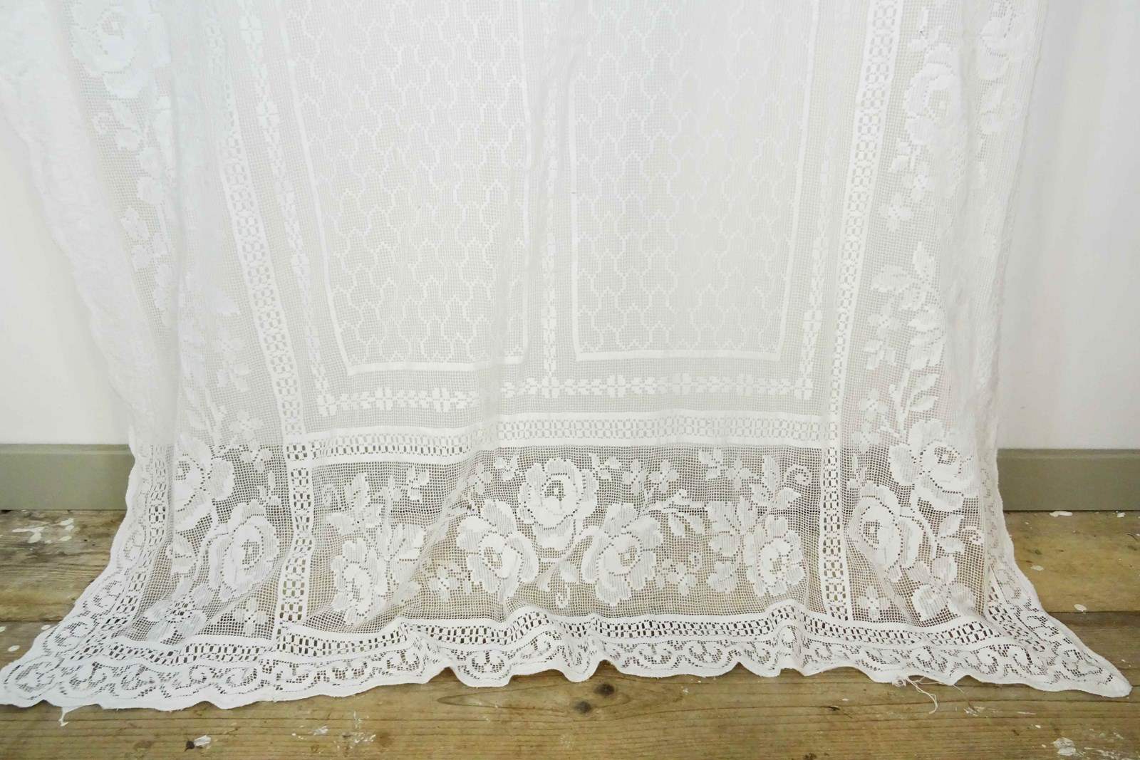 Pretty vintage French lacey curtain panel with pattern of roses and a scalloped edging.