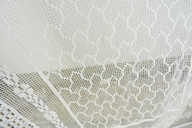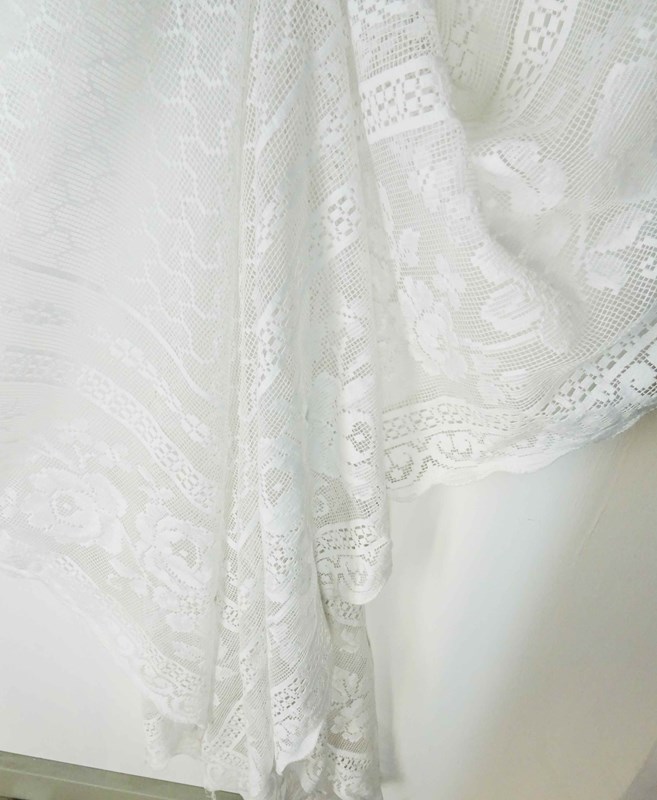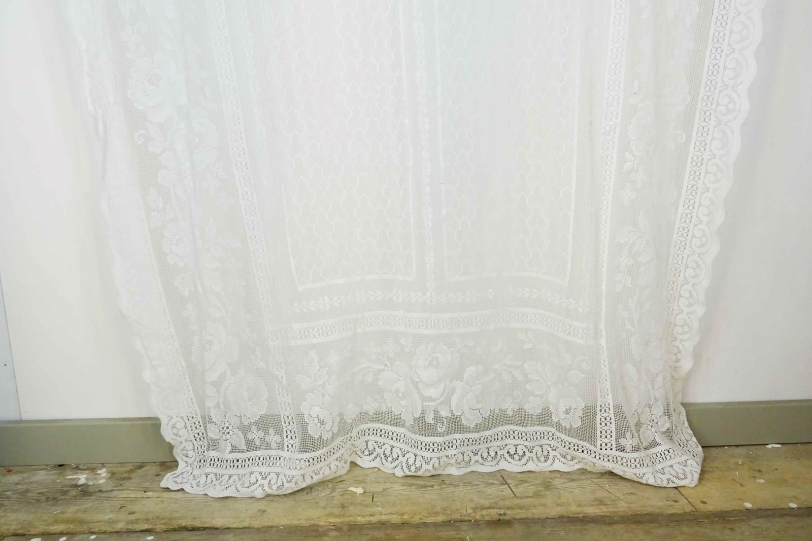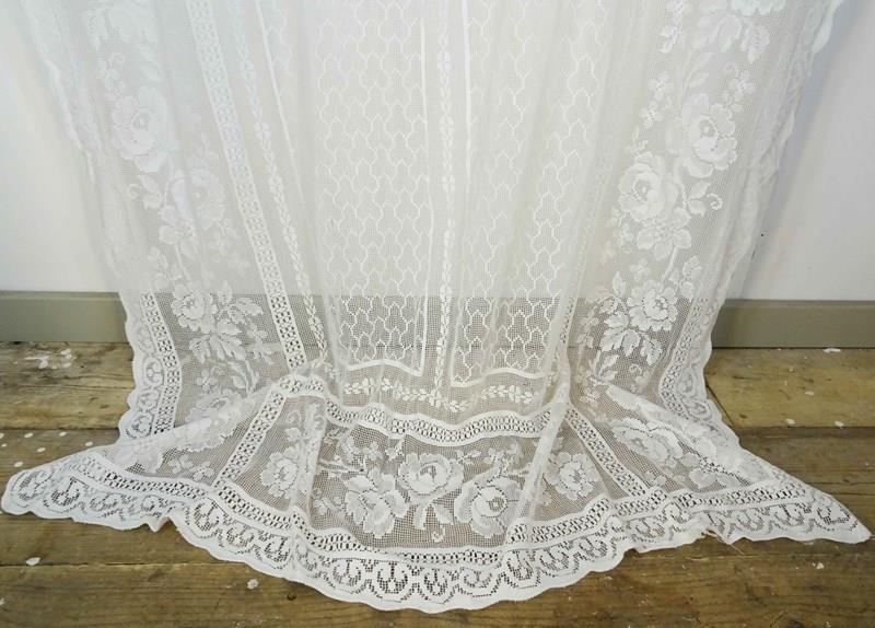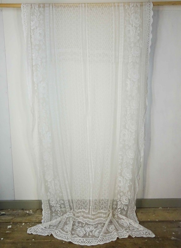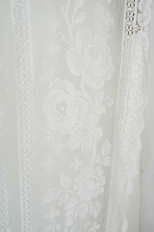 Pretty vintage French lacey curtain panel with pattern of roses and a scalloped edging.