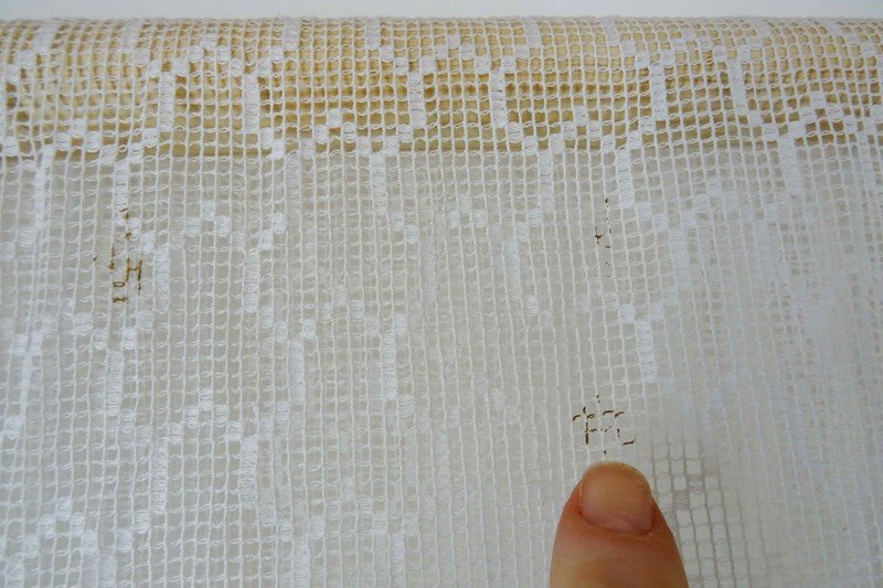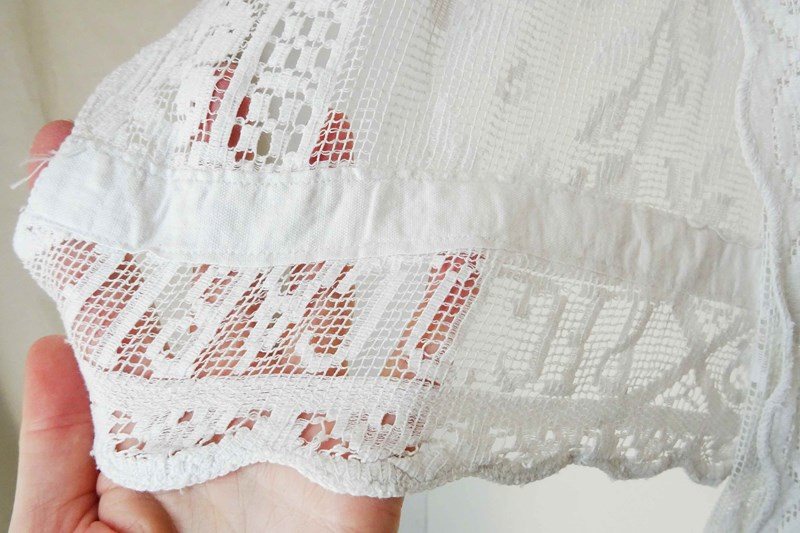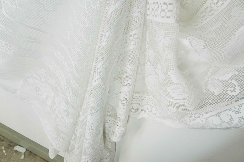 Very minor damage, I think just the snag at the hem and the little tear as shown. I have not laundered this but it has few marks, certainly nothing bad to report, and could be hung as is. Colour is a soft vintage white. A synthetic lace dating to the 1970s.