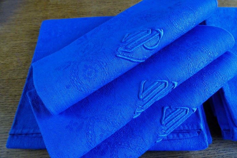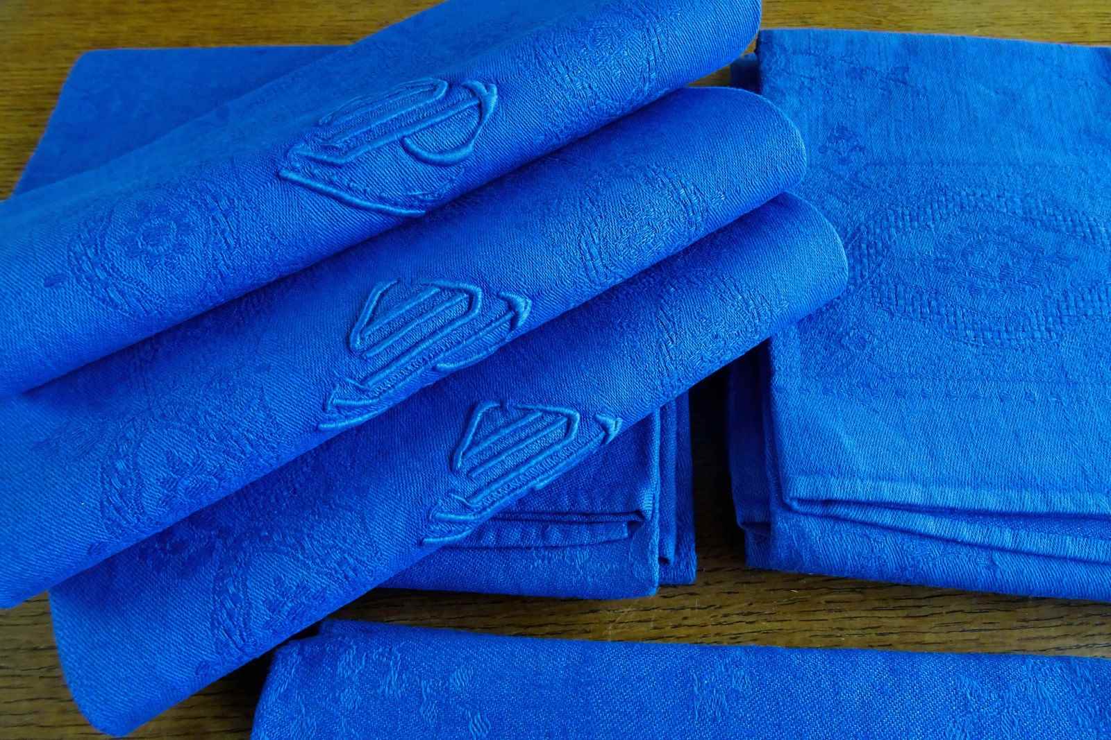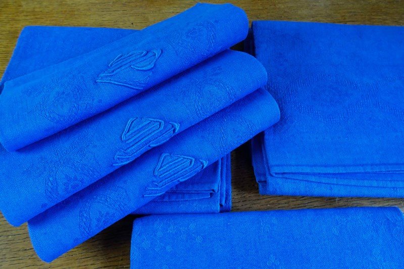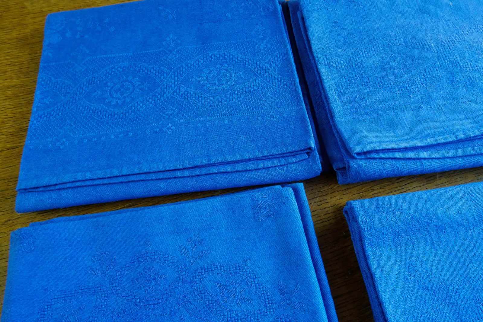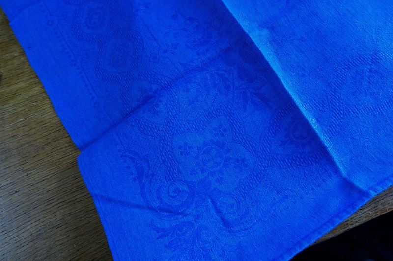A set of 10 vintage French linen damask napkins. Good quality linen with an attractive pattern to the damask. I have hand dyed this set in a warm mid blue (colour looks a bit too bright/over saturated on my screen, they're a softer colour than I've managed to capture!). But I do love to dye damask, it really brings the wonderful patterns of the weave alive.