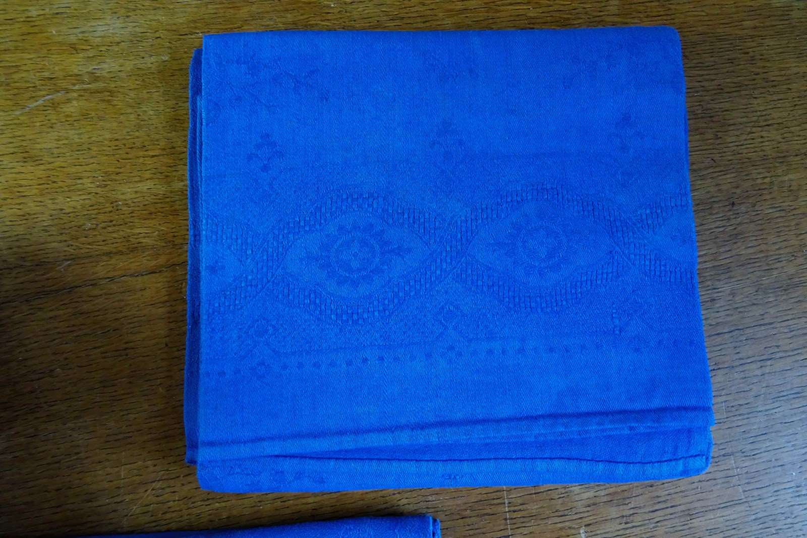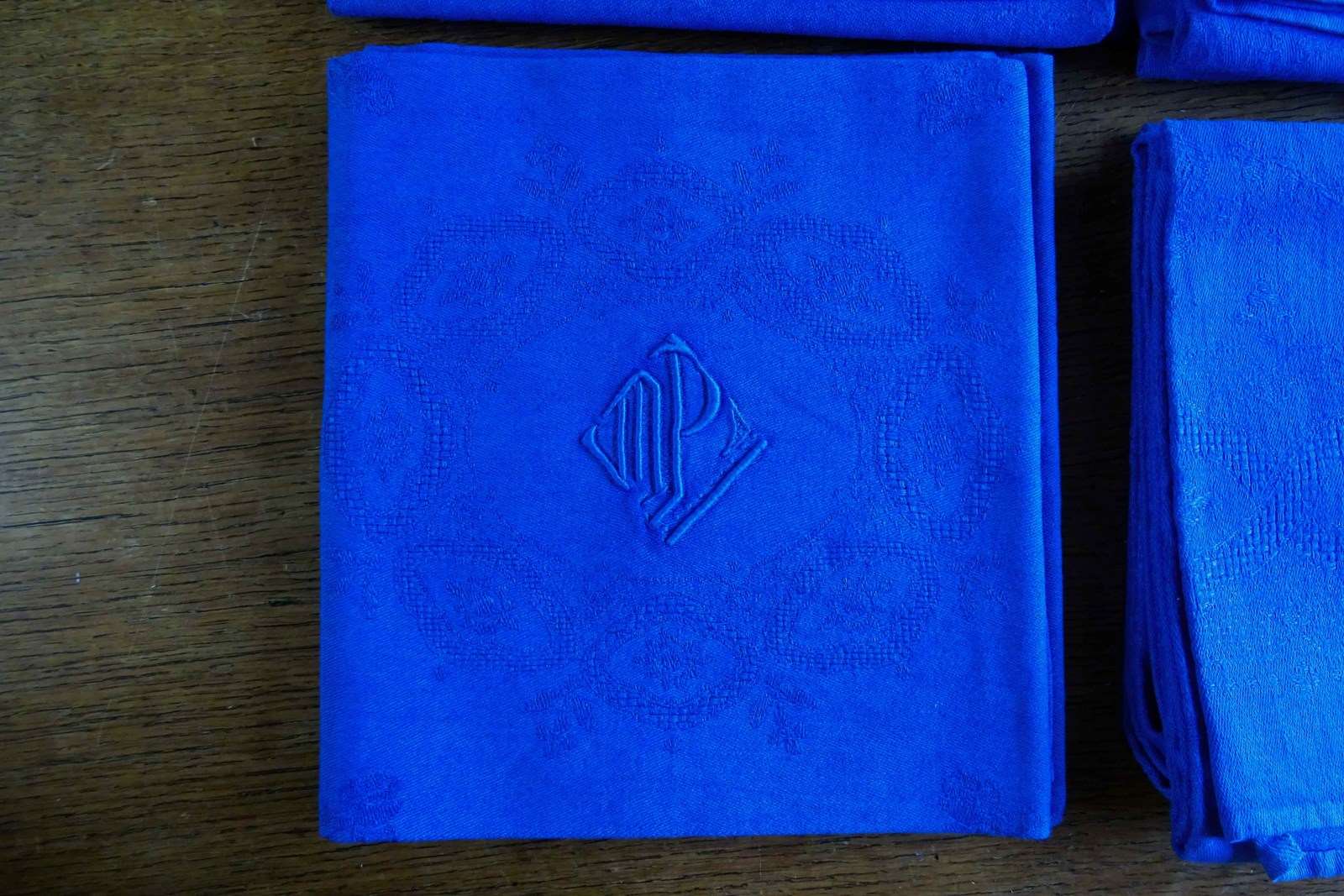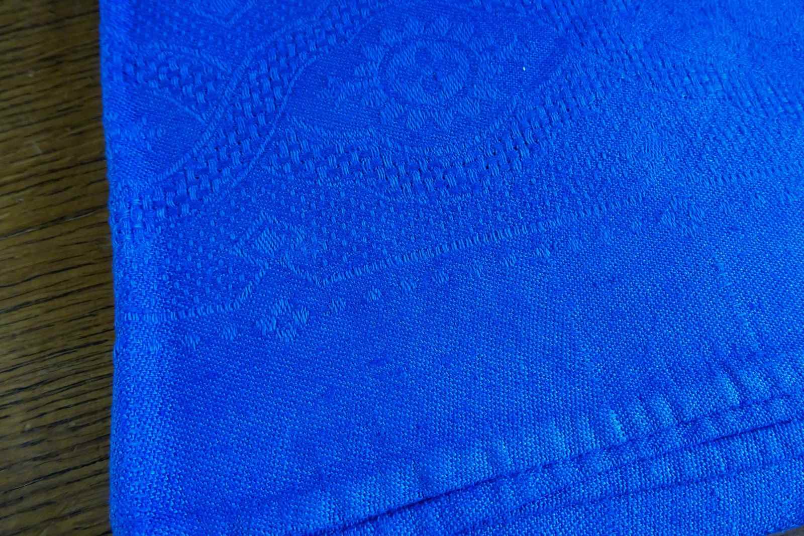 A set of 10 vintage French linen damask napkins. Good quality linen with an attractive pattern to the damask. I have hand dyed this set in a warm mid blue (colour looks a bit too bright/over saturated on my screen, they're a softer colour than I've managed to capture!). But I do love to dye damask, it really brings the wonderful patterns of the weave alive.