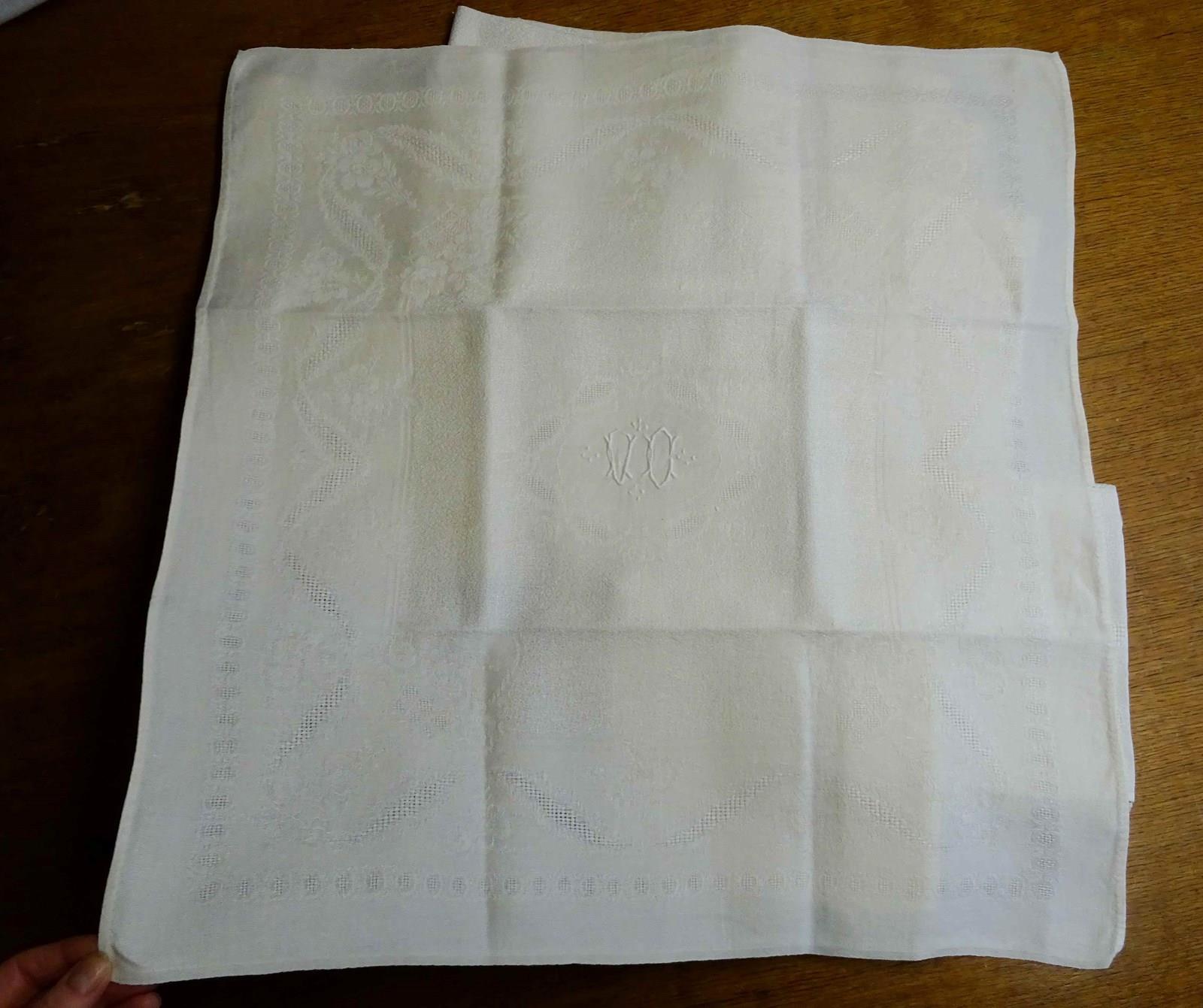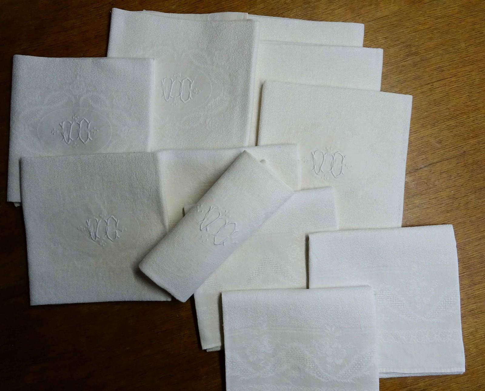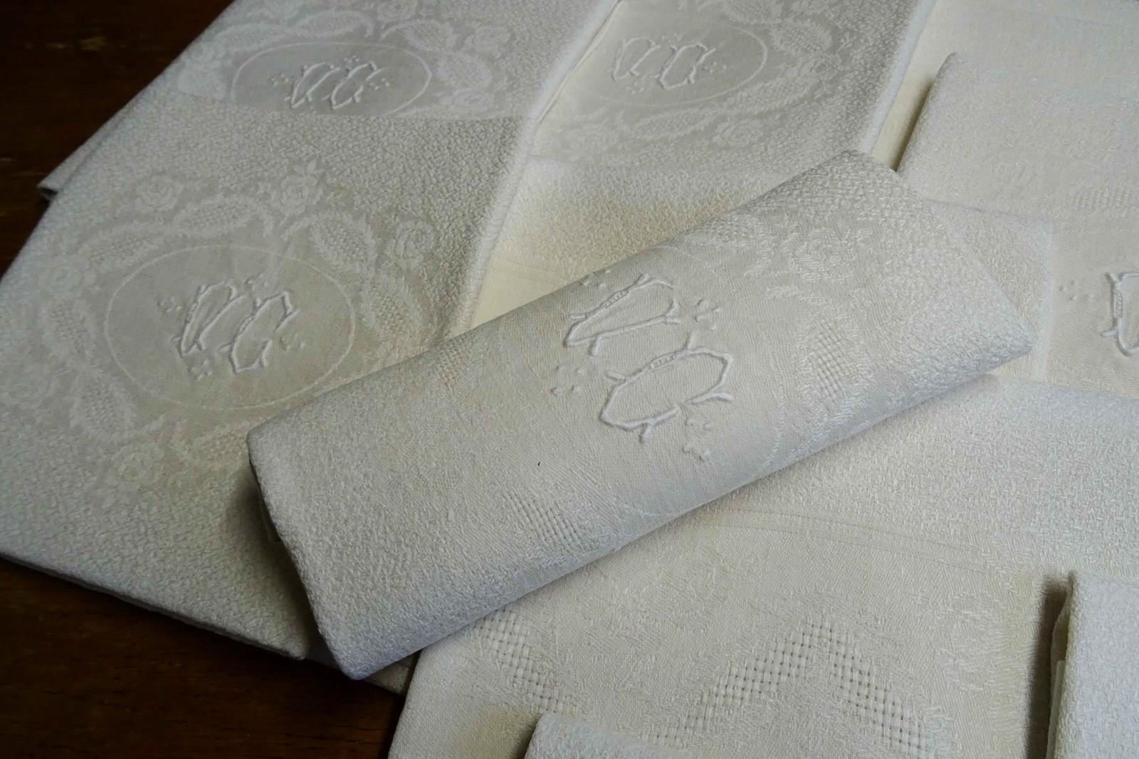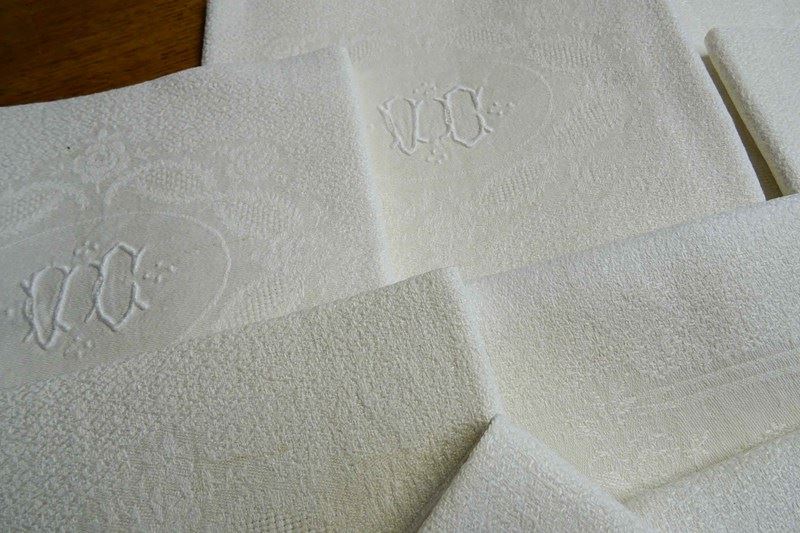 This is a beautiful set of vintage French linen damask napkins which have most likely never been used. Lovely weighty pure linen damask with such an attractive pattern surrounding central monograms of the letters VC (VG?)