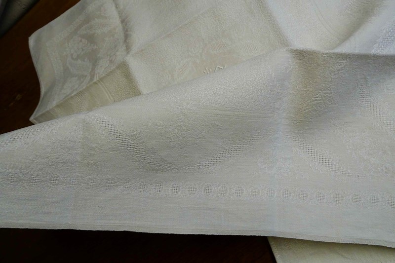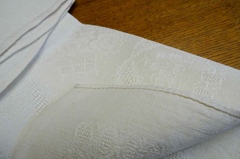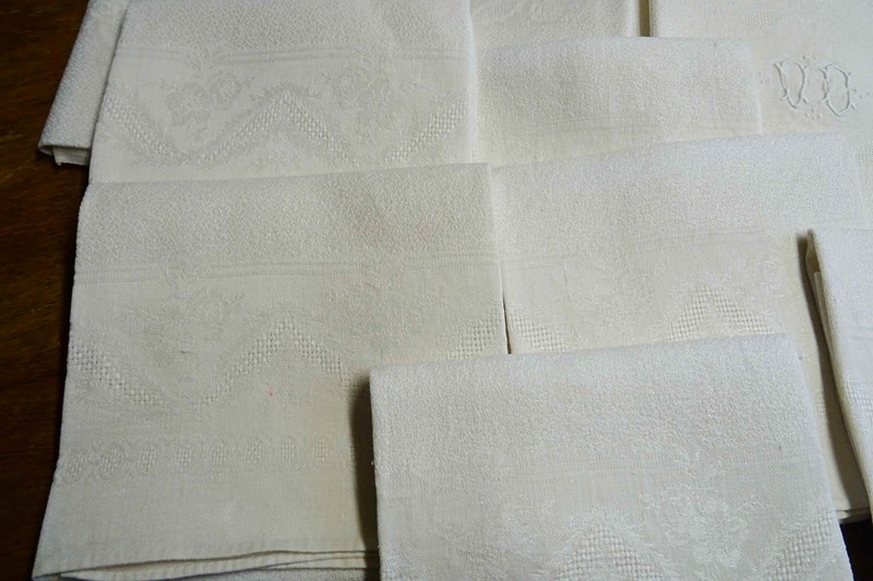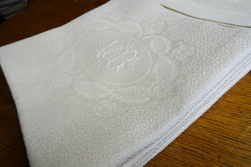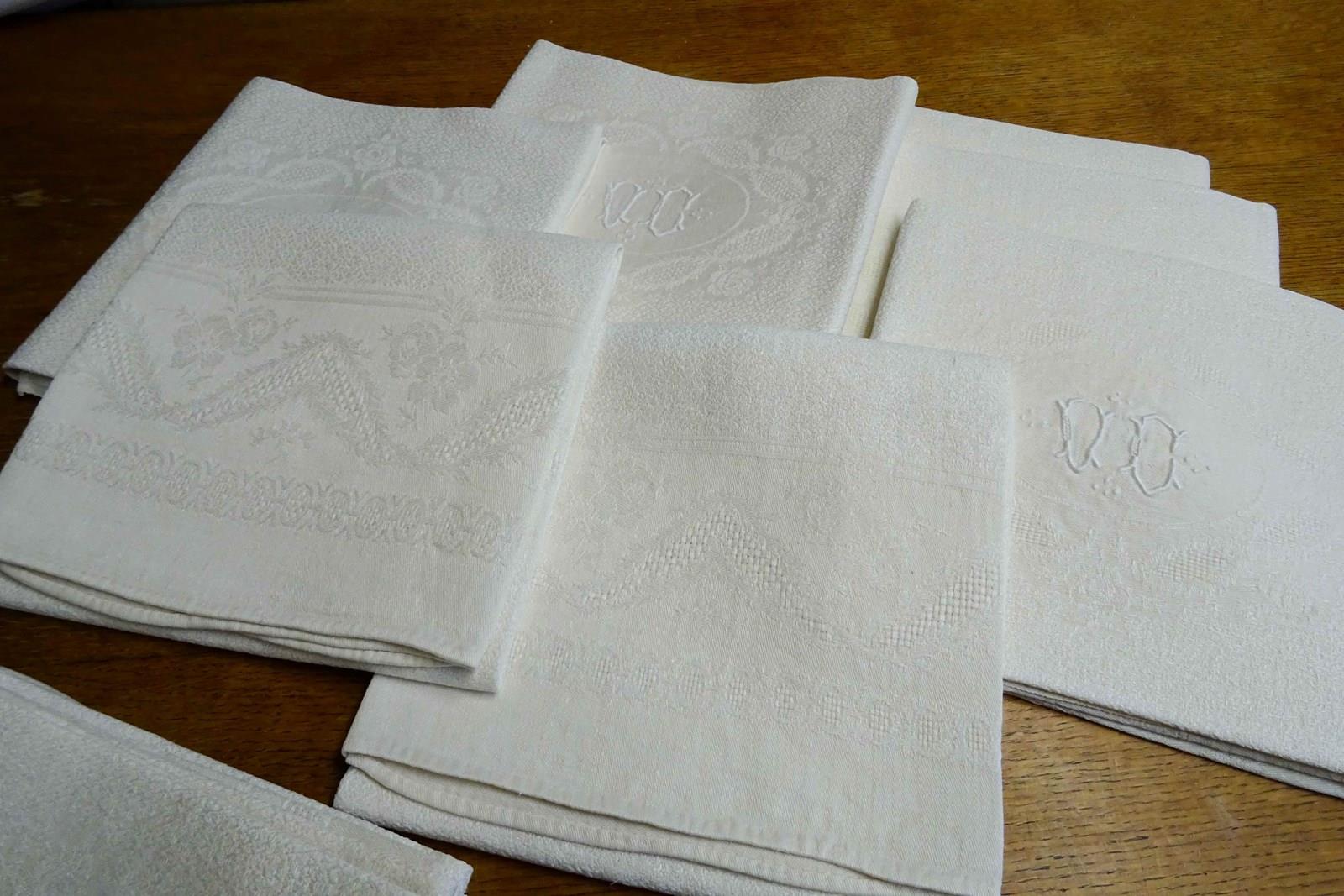 This is a beautiful set of vintage French linen damask napkins which have most likely never been used. Lovely weighty pure linen damask with such an attractive pattern surrounding central monograms of the letters VC (VG?)
