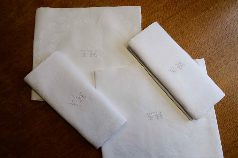 For me there's nothing quite like the glamour and luxurious feel of antique French linen damask. This is a set of four fine pure linen hand stitched monogrammed napkins featuring the letters TM set within the central cartouche. The damask pattern is lovely and I think I've managed to capture some of the details in the photos; it's not easy.