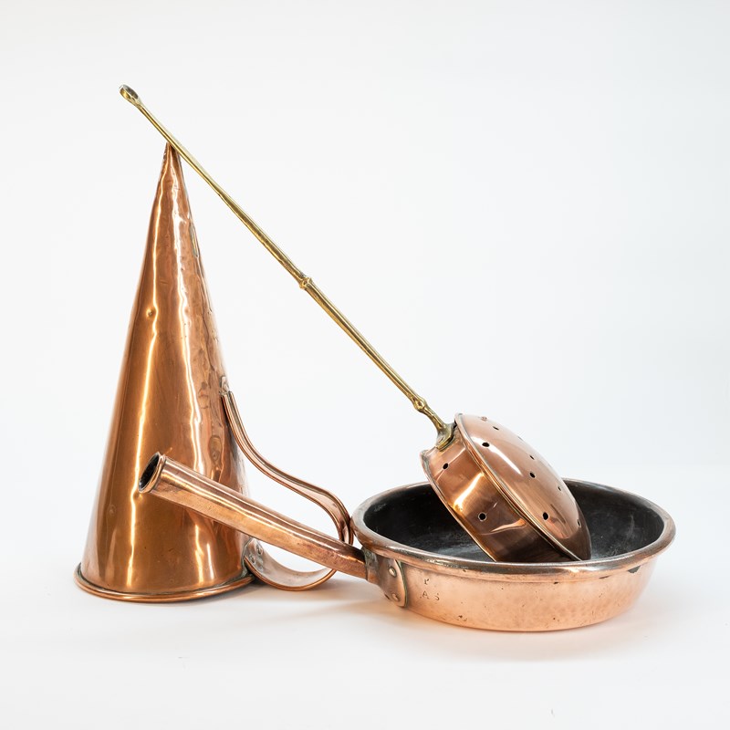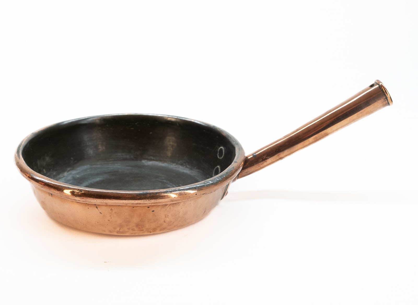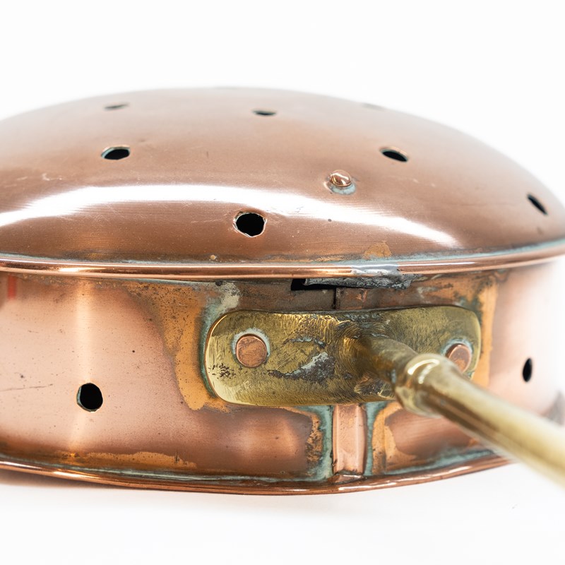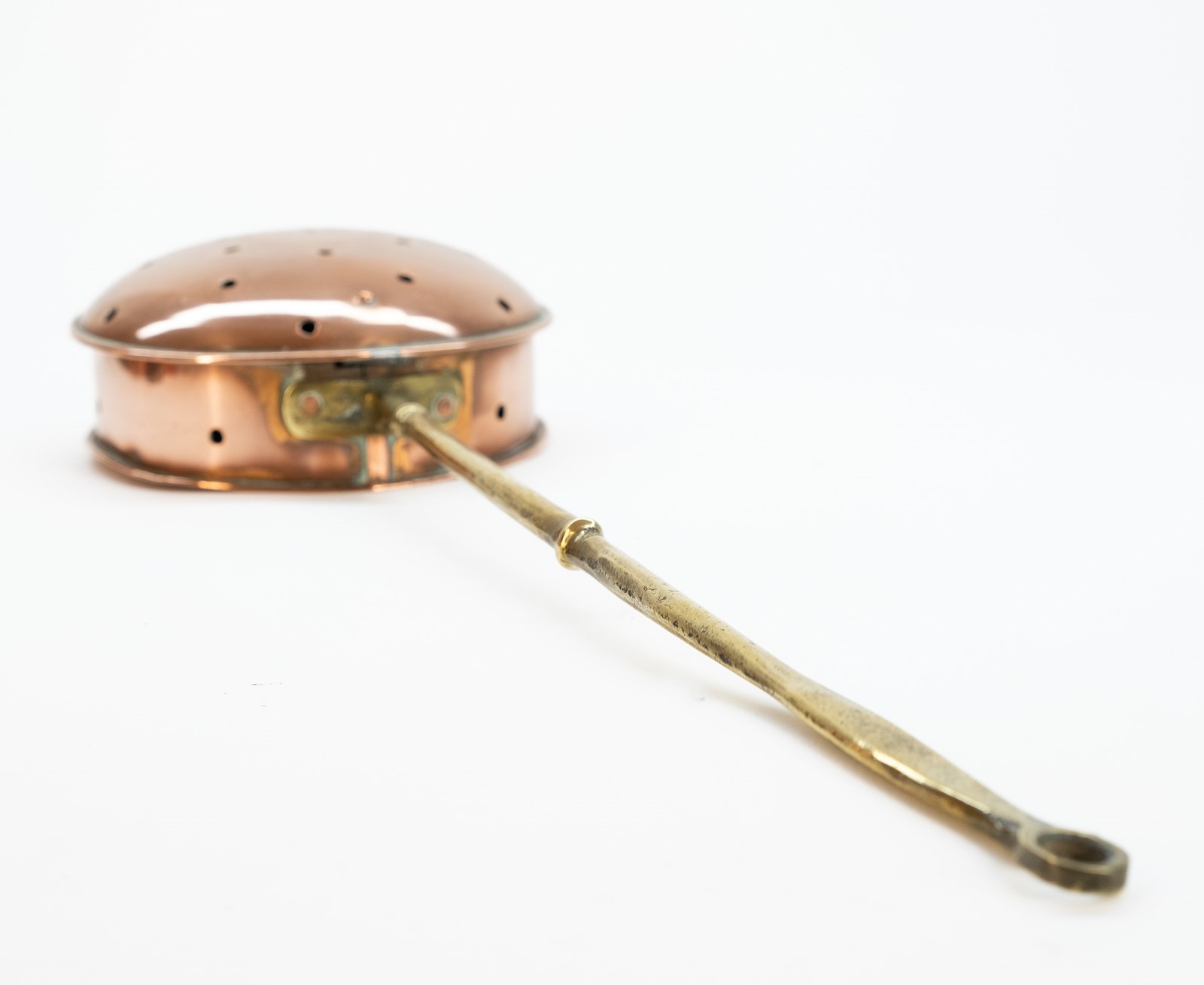 A 19th century ale muller and frying pan with 20th century copper and brass chestnut roaster.