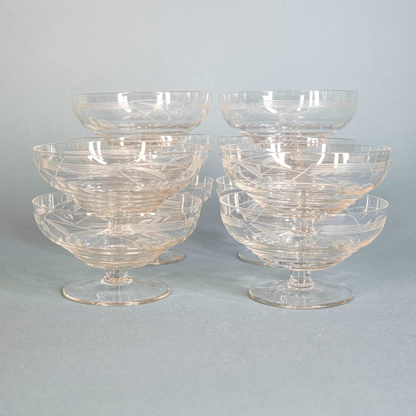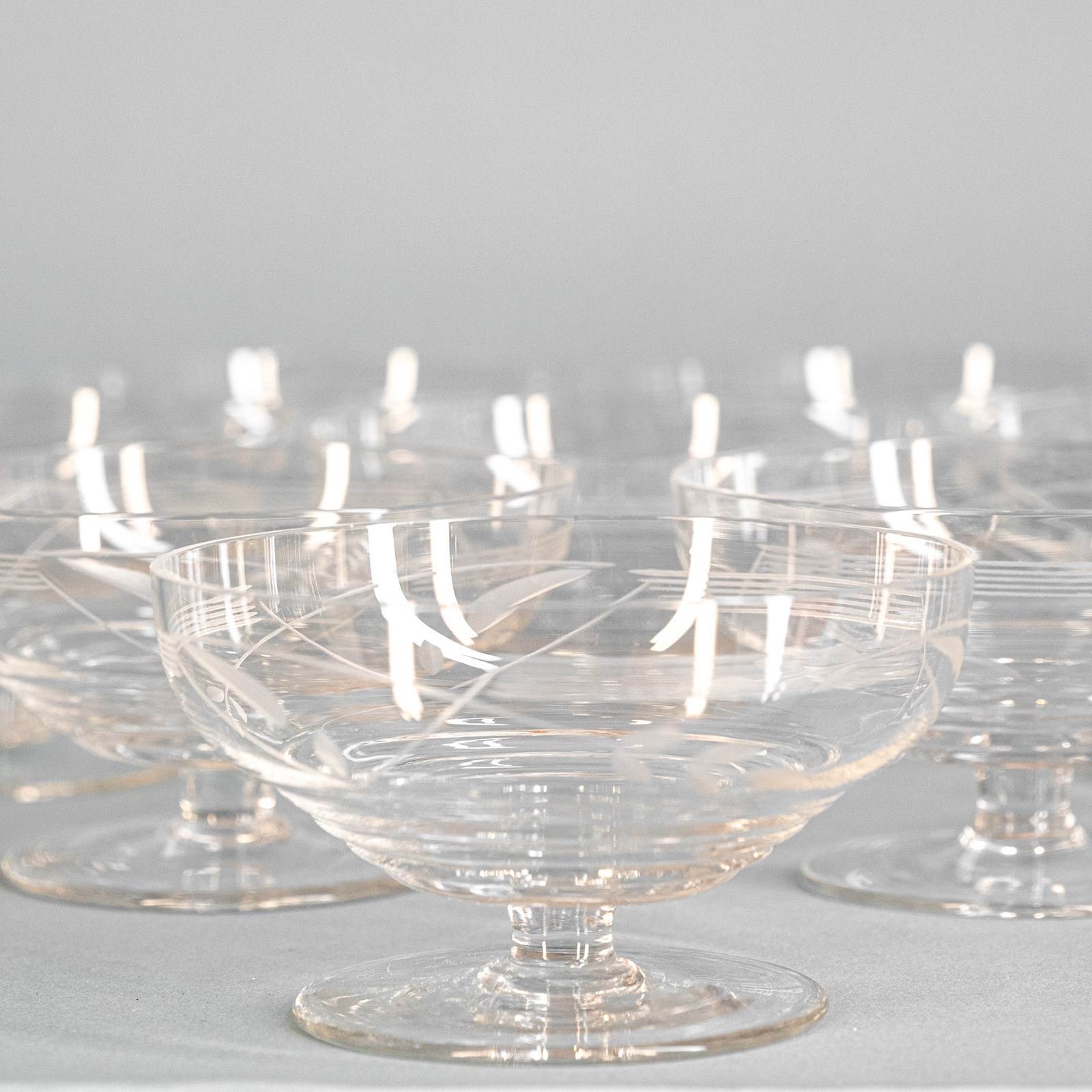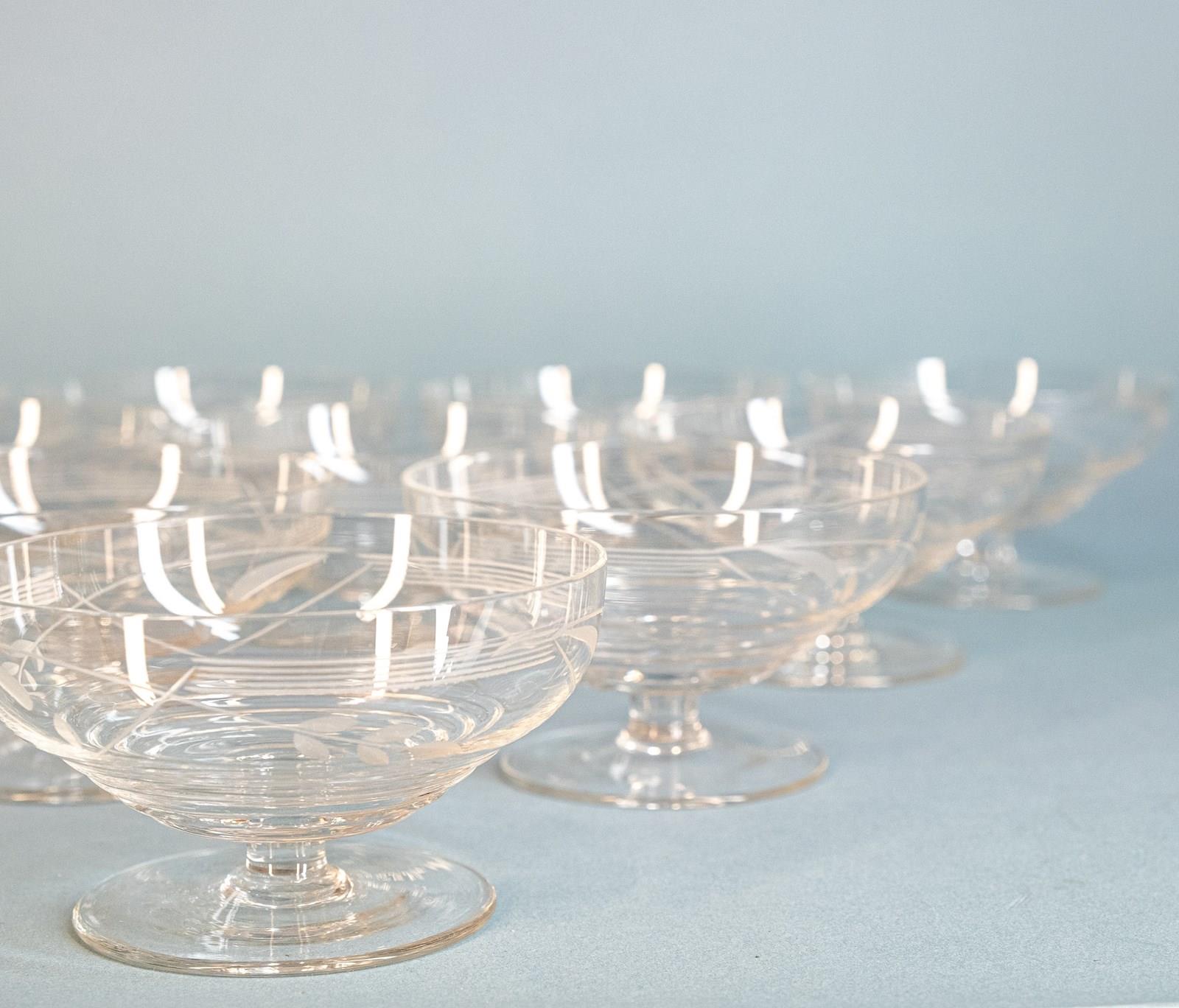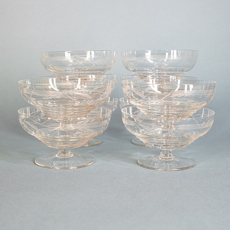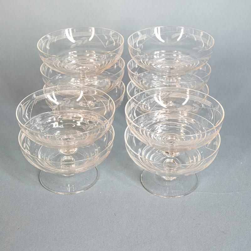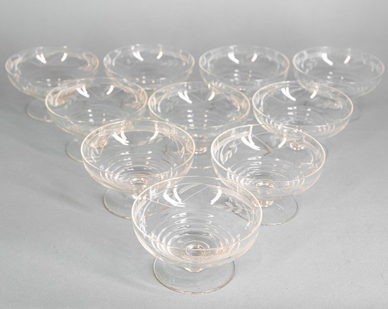 A set of 10 rather fab mid century French cut crystal champagne coupes. Which of course also make great dessert bowls.