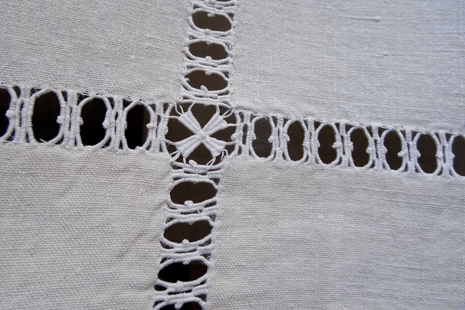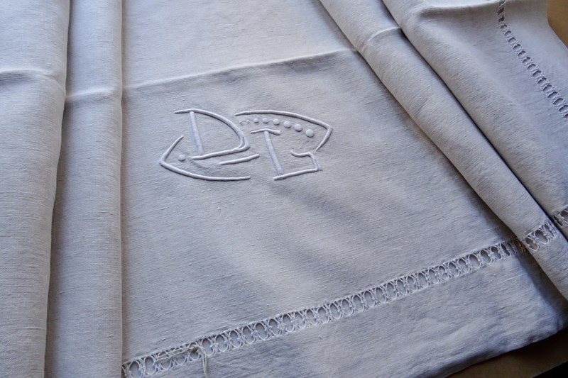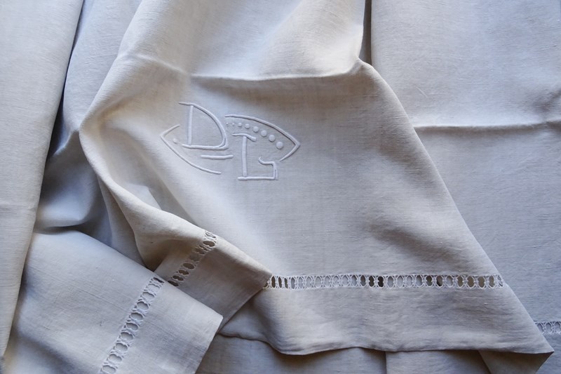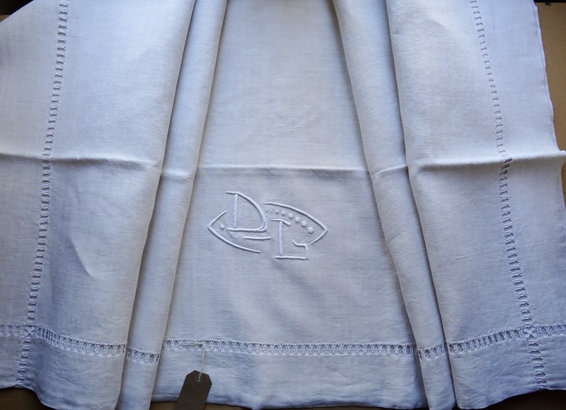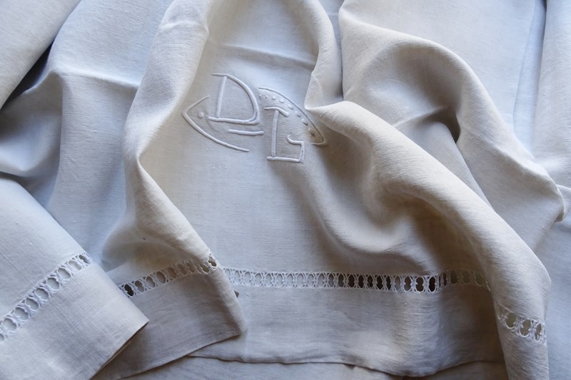 The decoration on this sheet is beautiful. The linen has a real country feel to it but the workmanship is chic. Central monogram of the letters DL.
