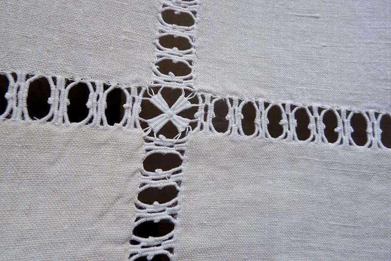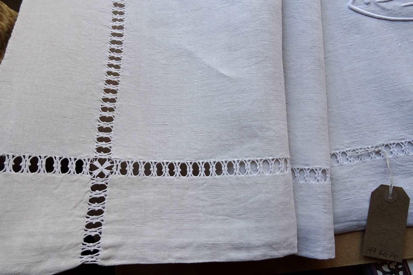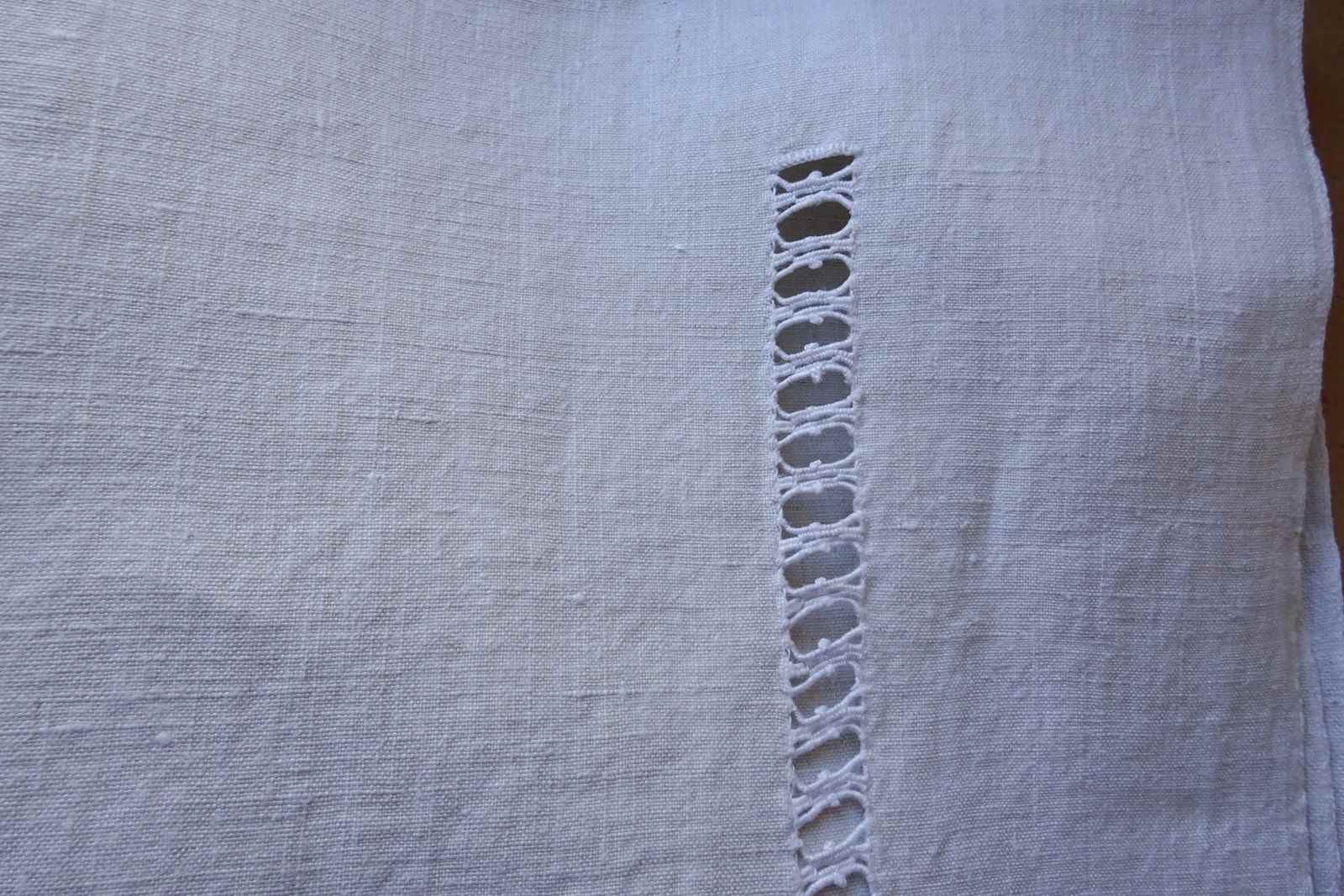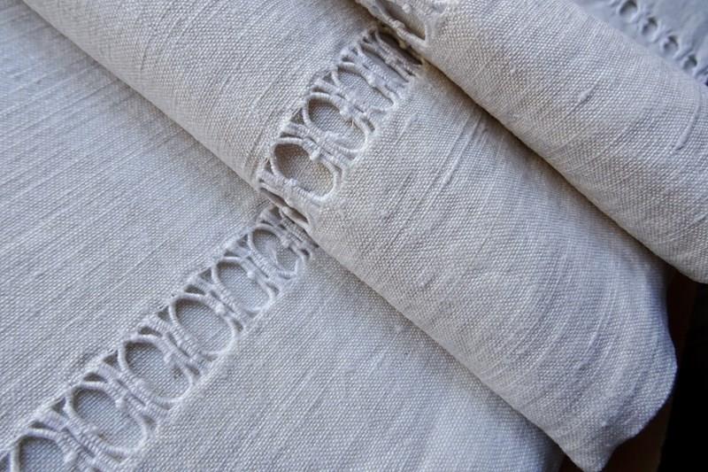 This is the third of three fabulous weighty linen sheets that came from the same household in central France. This is a beautiful piece with top quality decorative drawn thread work to the return hem; it's a very stylish sheet. The fabric has a lovely character to it with little slubs in the weave and it has good weight so it drapes beautifully for curtains or blinds. Or can of course be used as a sheet if you like a heavier weight.
