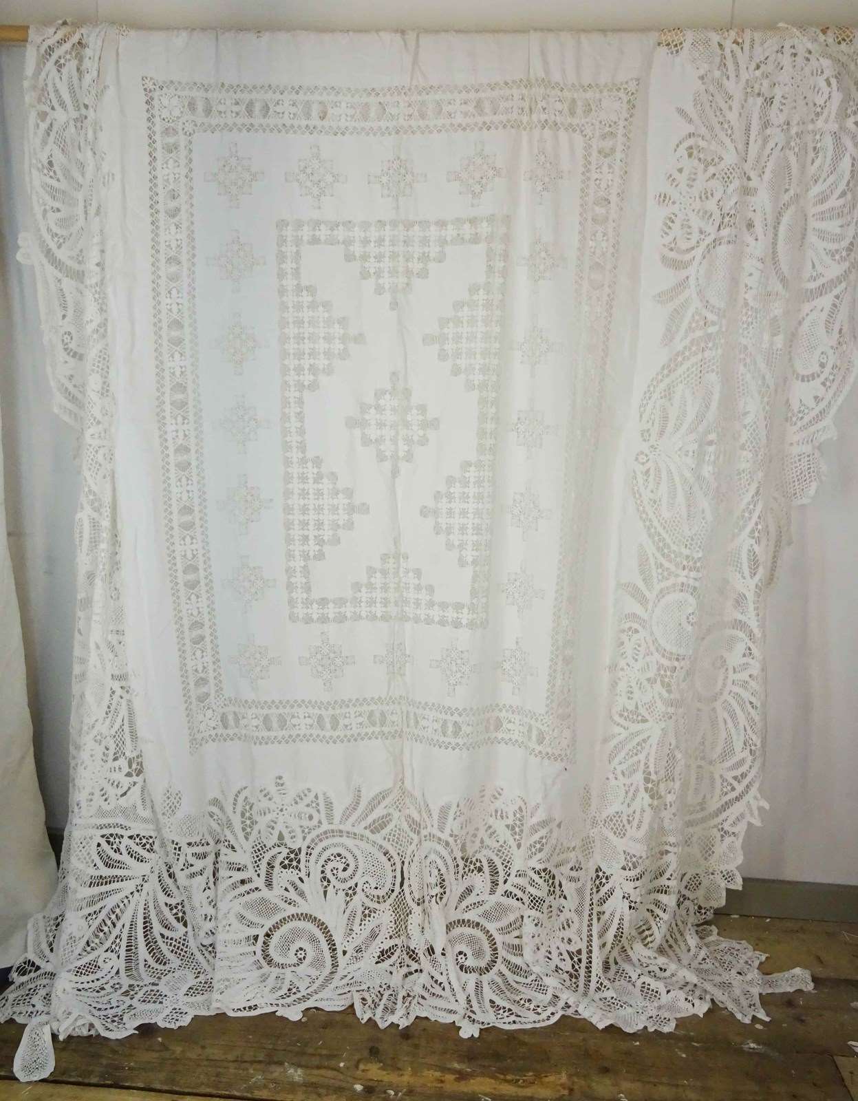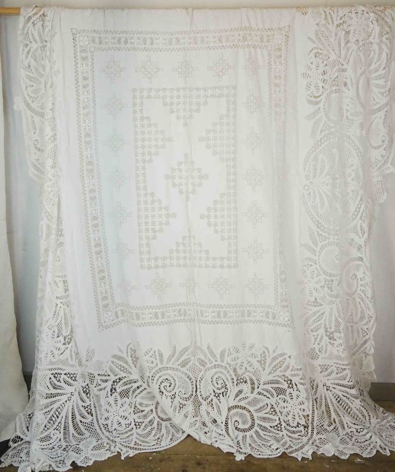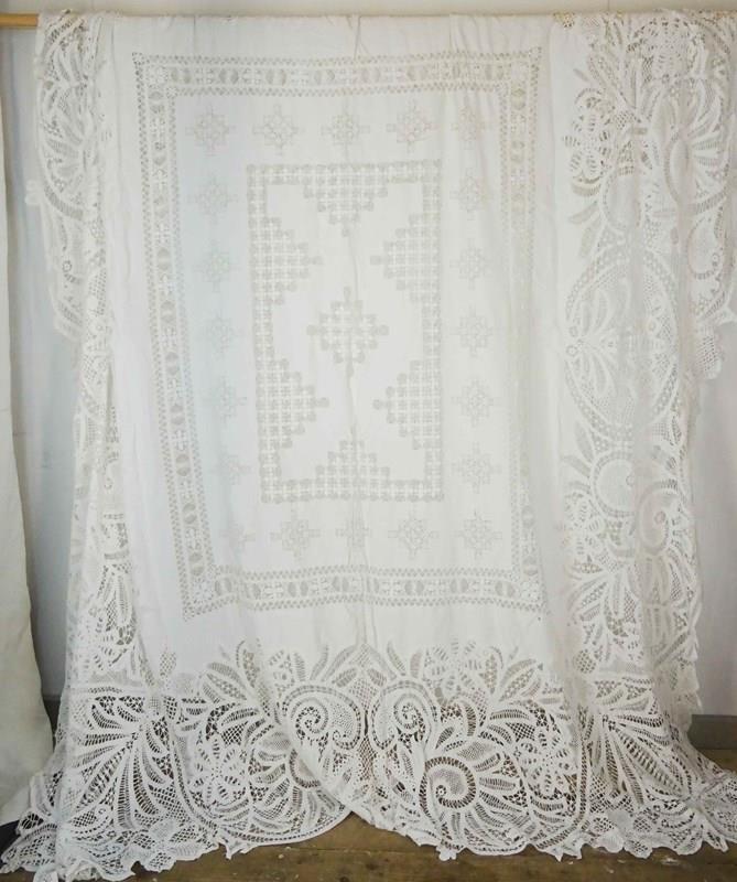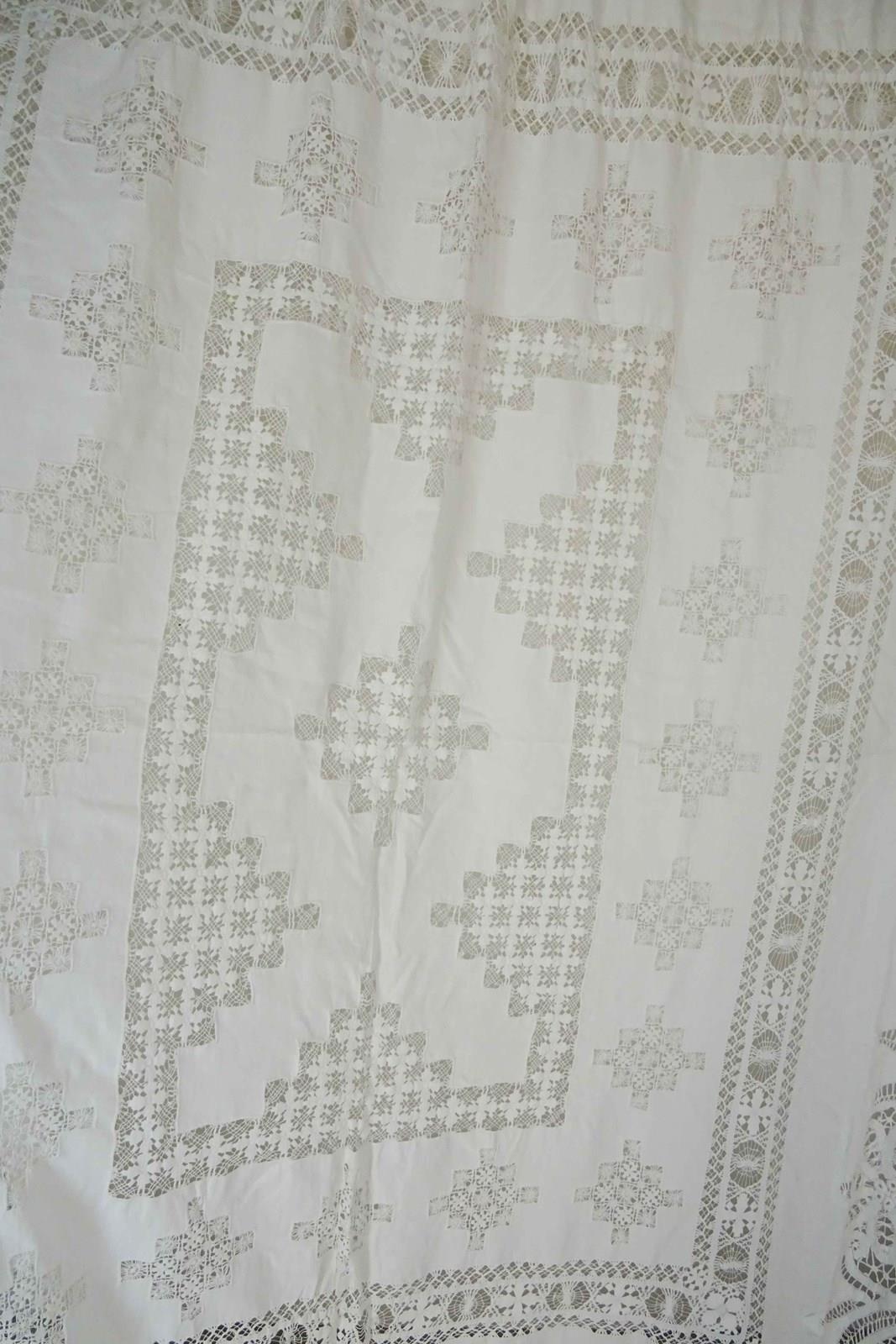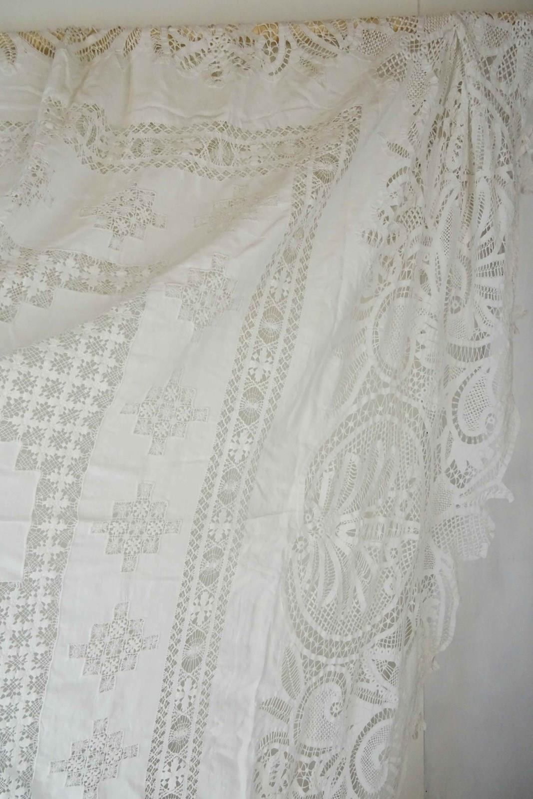 A huge, beautiful vintage French white linen bedspread with amazing lace edging and such intricate drawn thread decoration; this is a real heirloom piece.