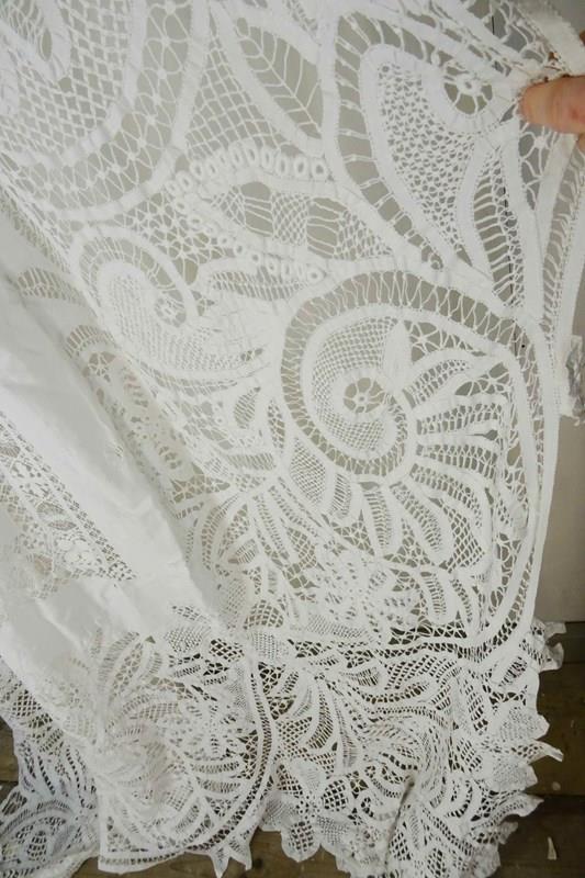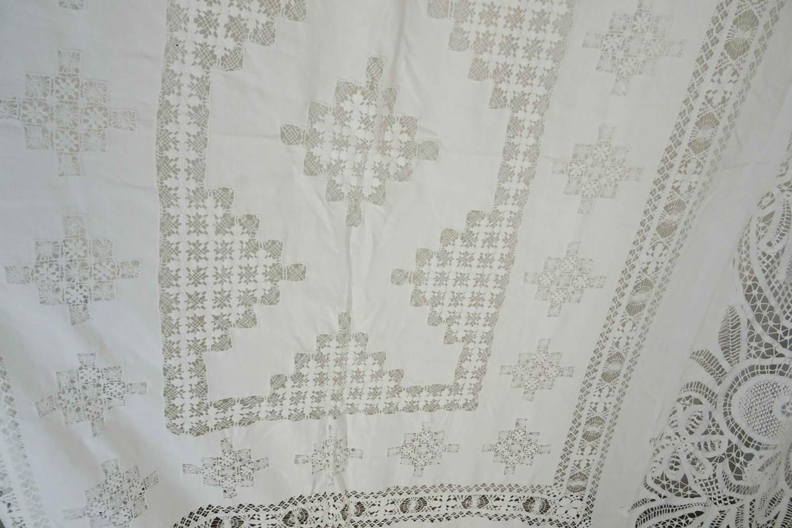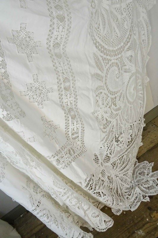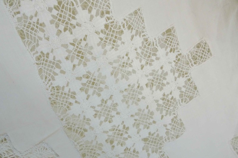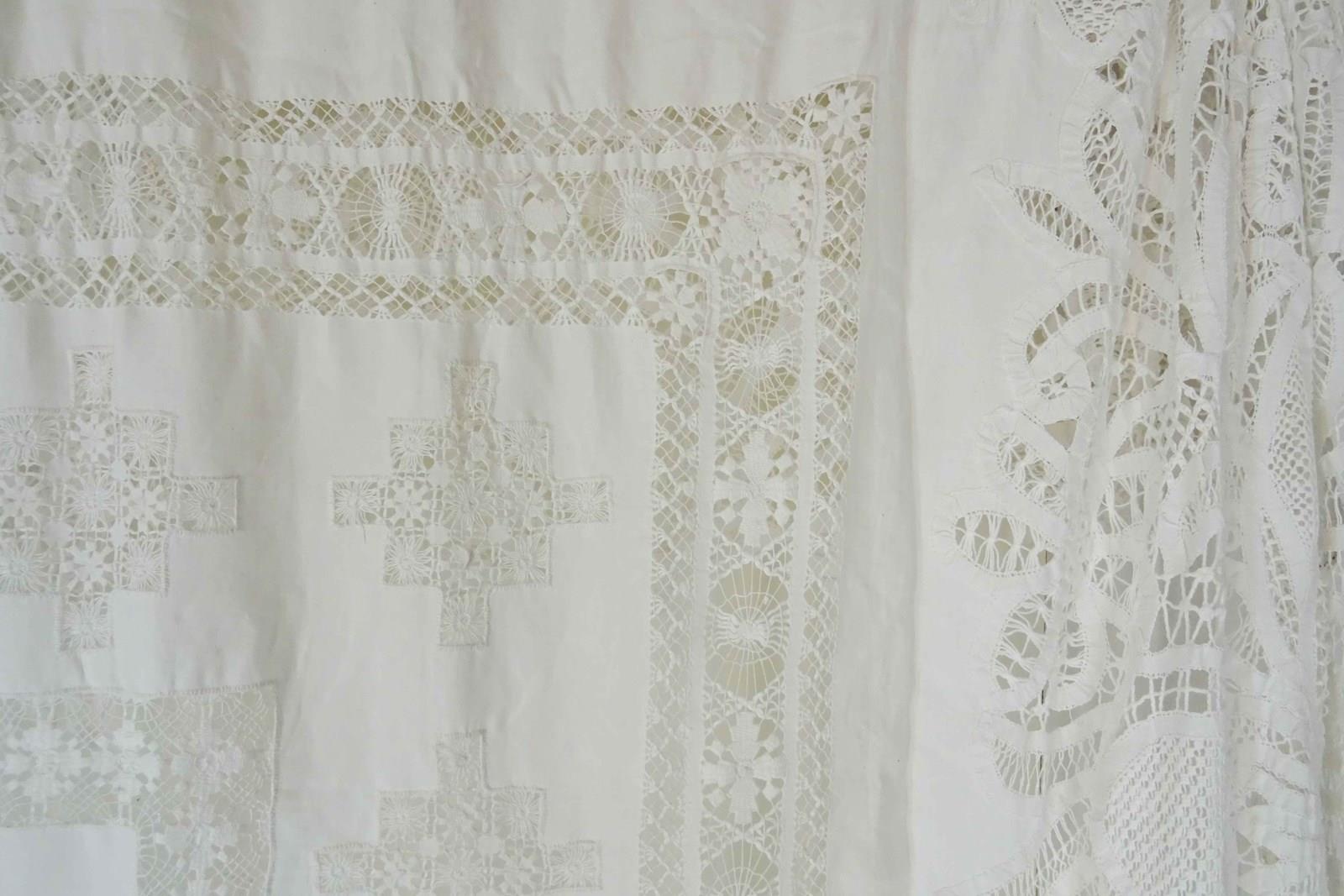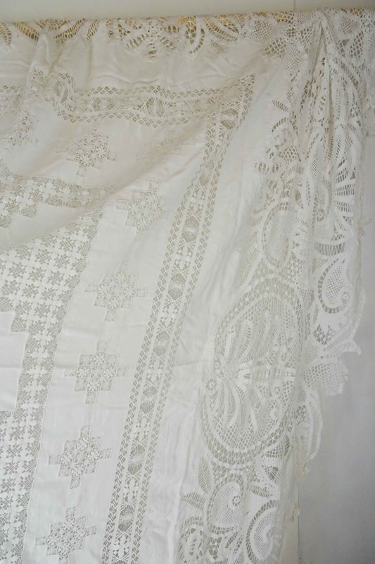 A huge, beautiful vintage French white linen bedspread with amazing lace edging and such intricate drawn thread decoration; this is a real heirloom piece.