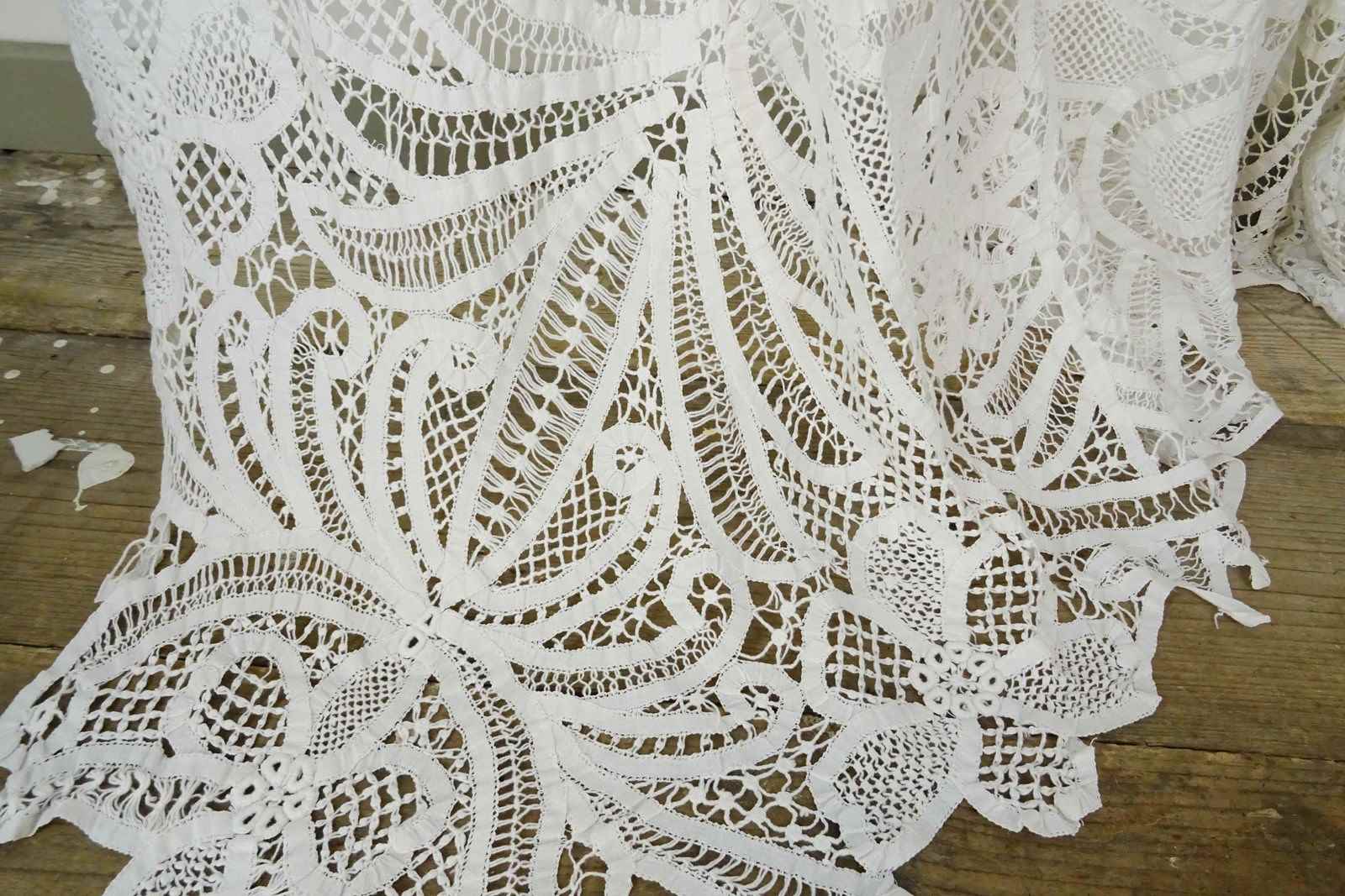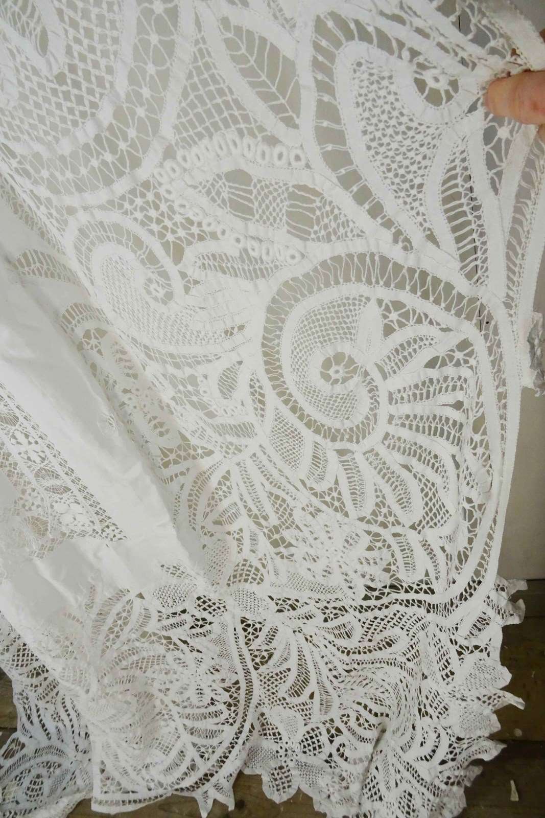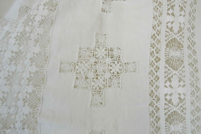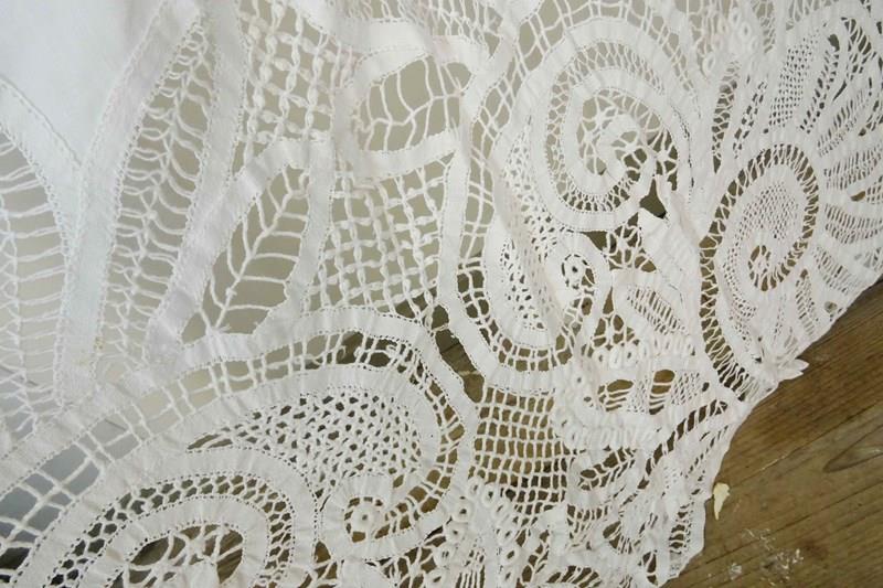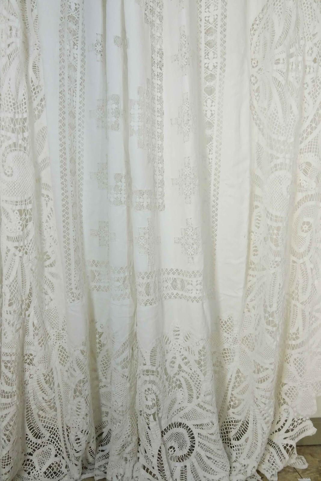 A huge, beautiful vintage French white linen bedspread with amazing lace edging and such intricate drawn thread decoration; this is a real heirloom piece.