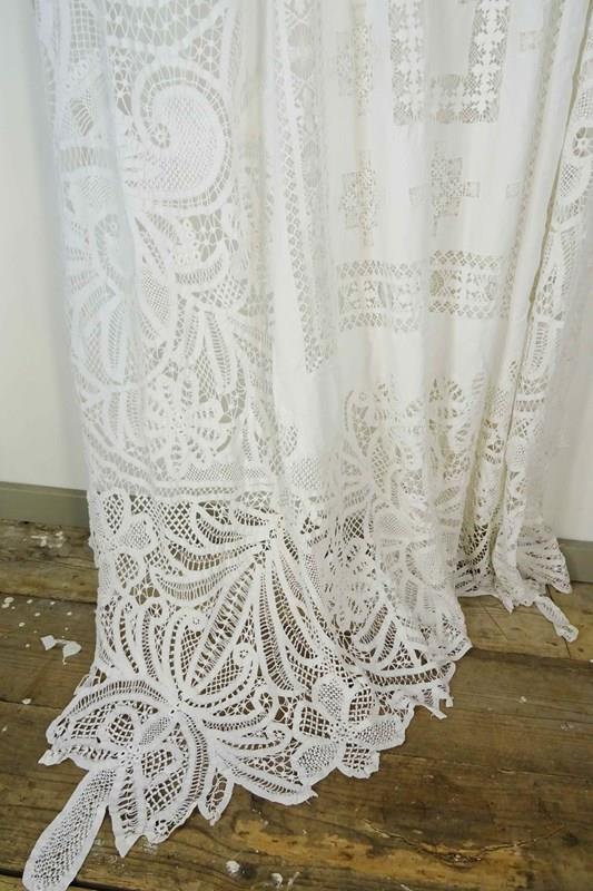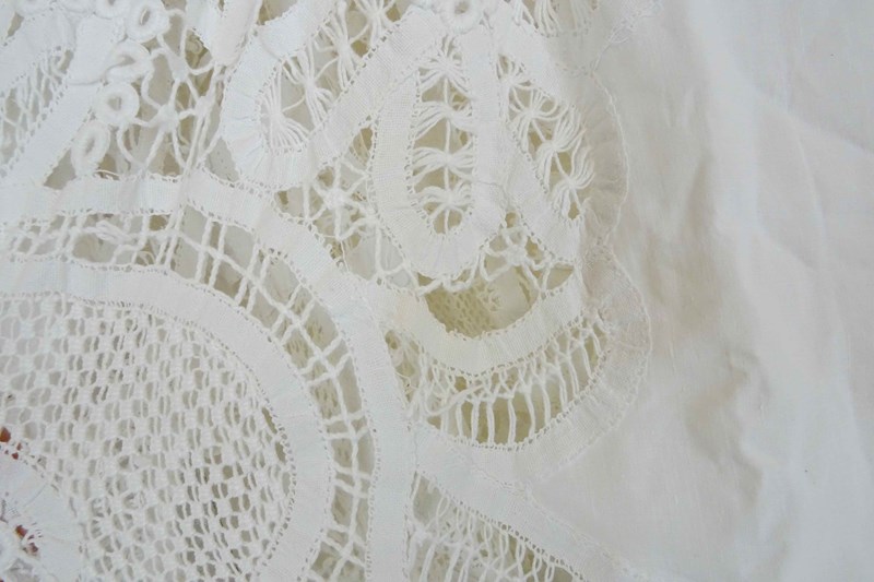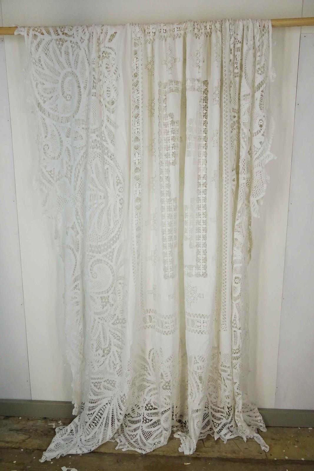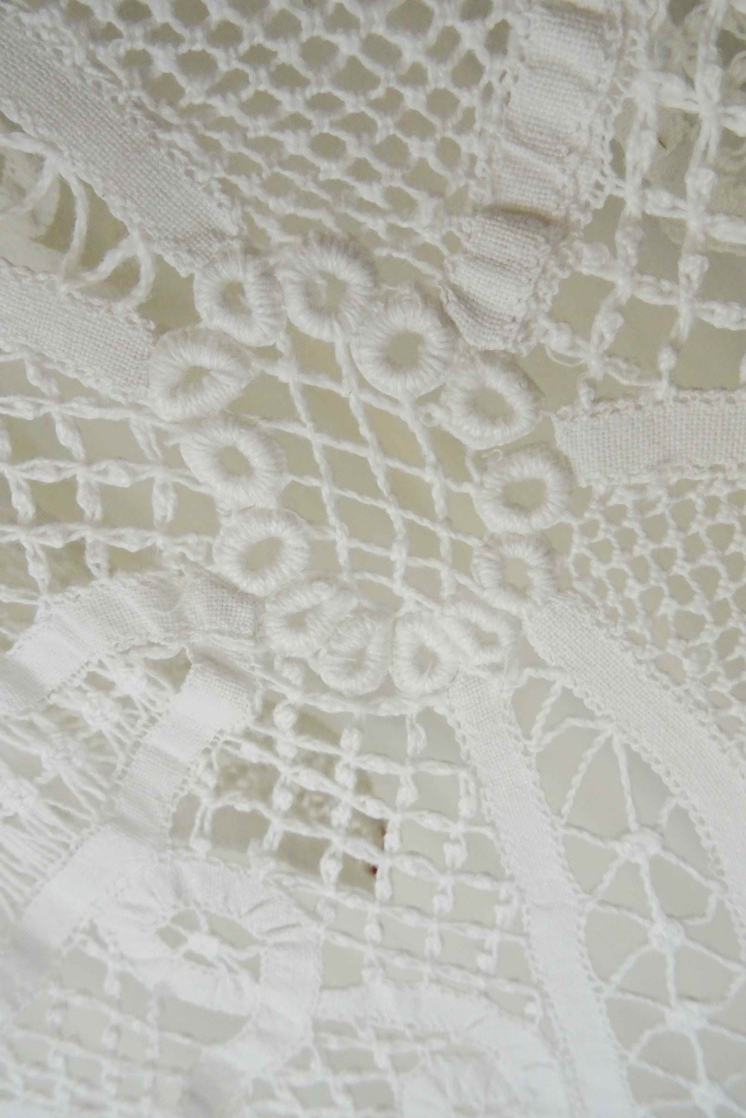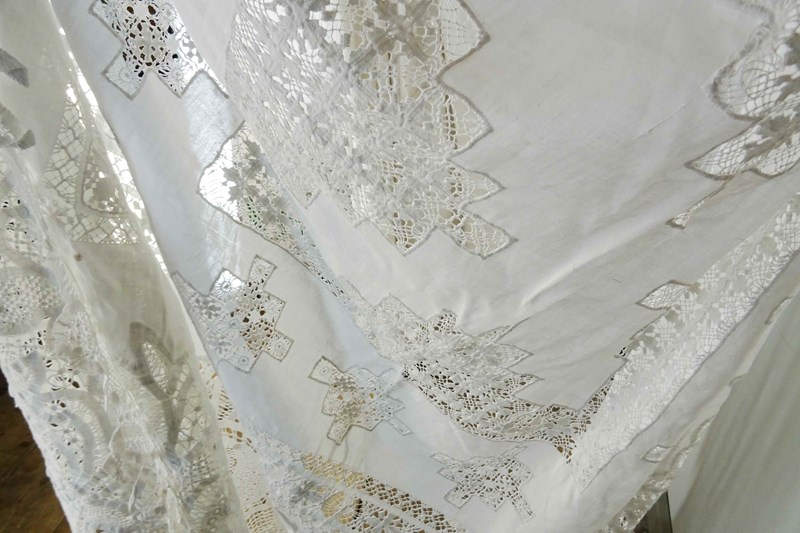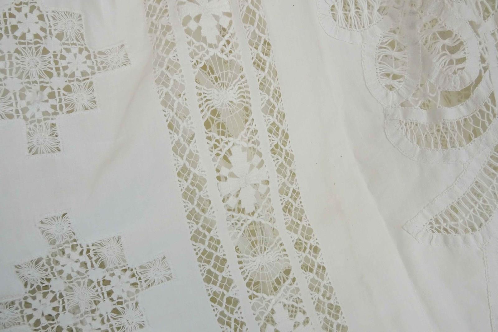 A huge, beautiful vintage French white linen bedspread with amazing lace edging and such intricate drawn thread decoration; this is a real heirloom piece.