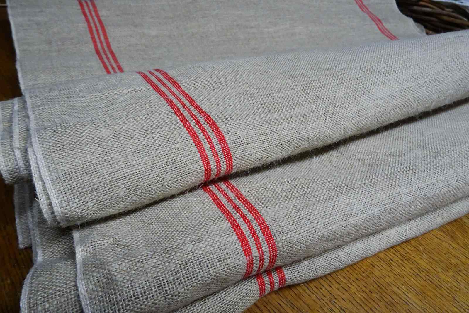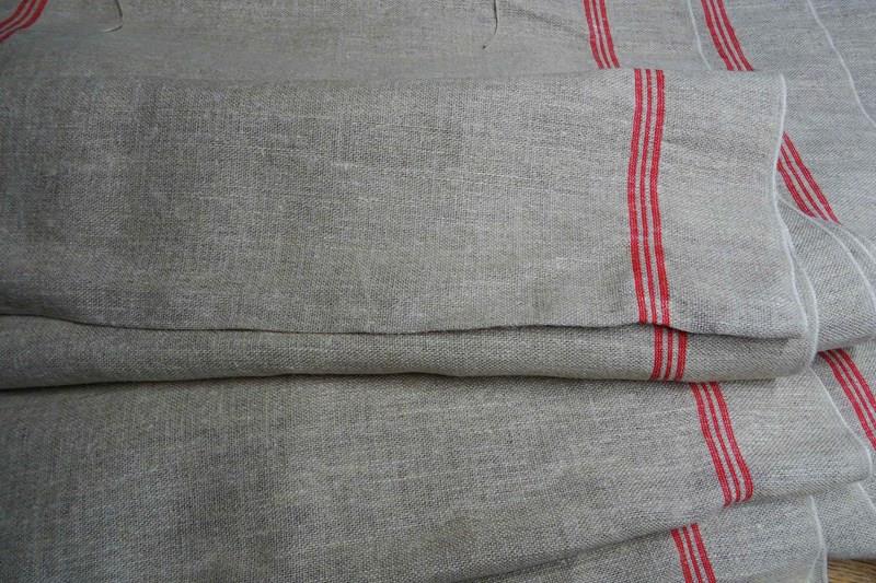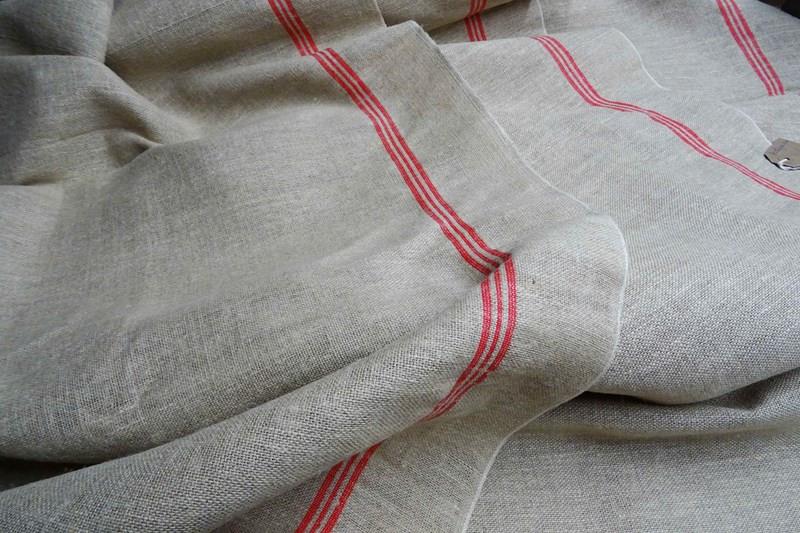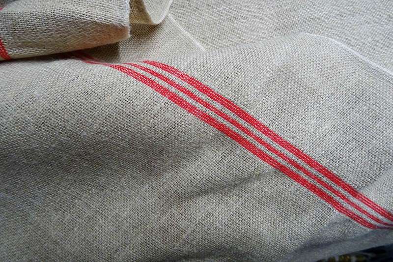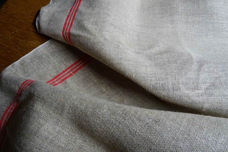 This is hemp (rather than linen) and it has such a lovely feel to it. A warm beigey-stone colour with traditional woven warp stripes in a bright red (some of my photos are a bit dark). This piece has never been laundered. It is clean and ready for use but with washing it will tighten up and lighten in colour a little too.