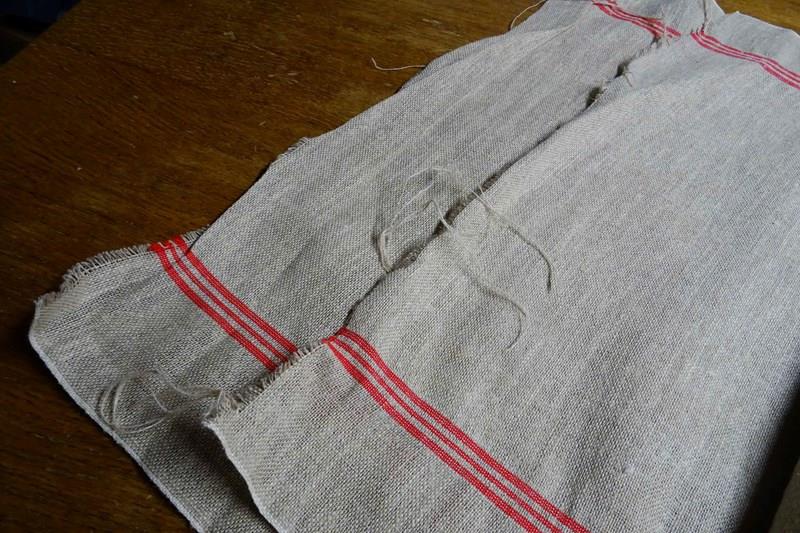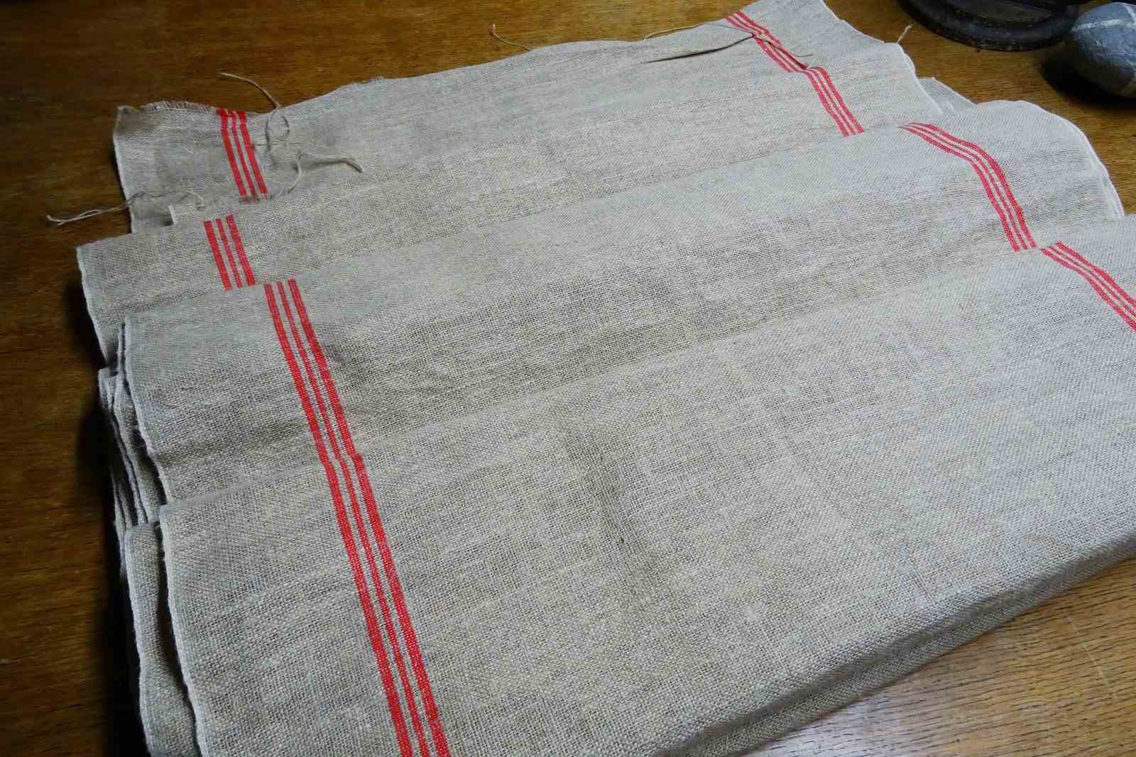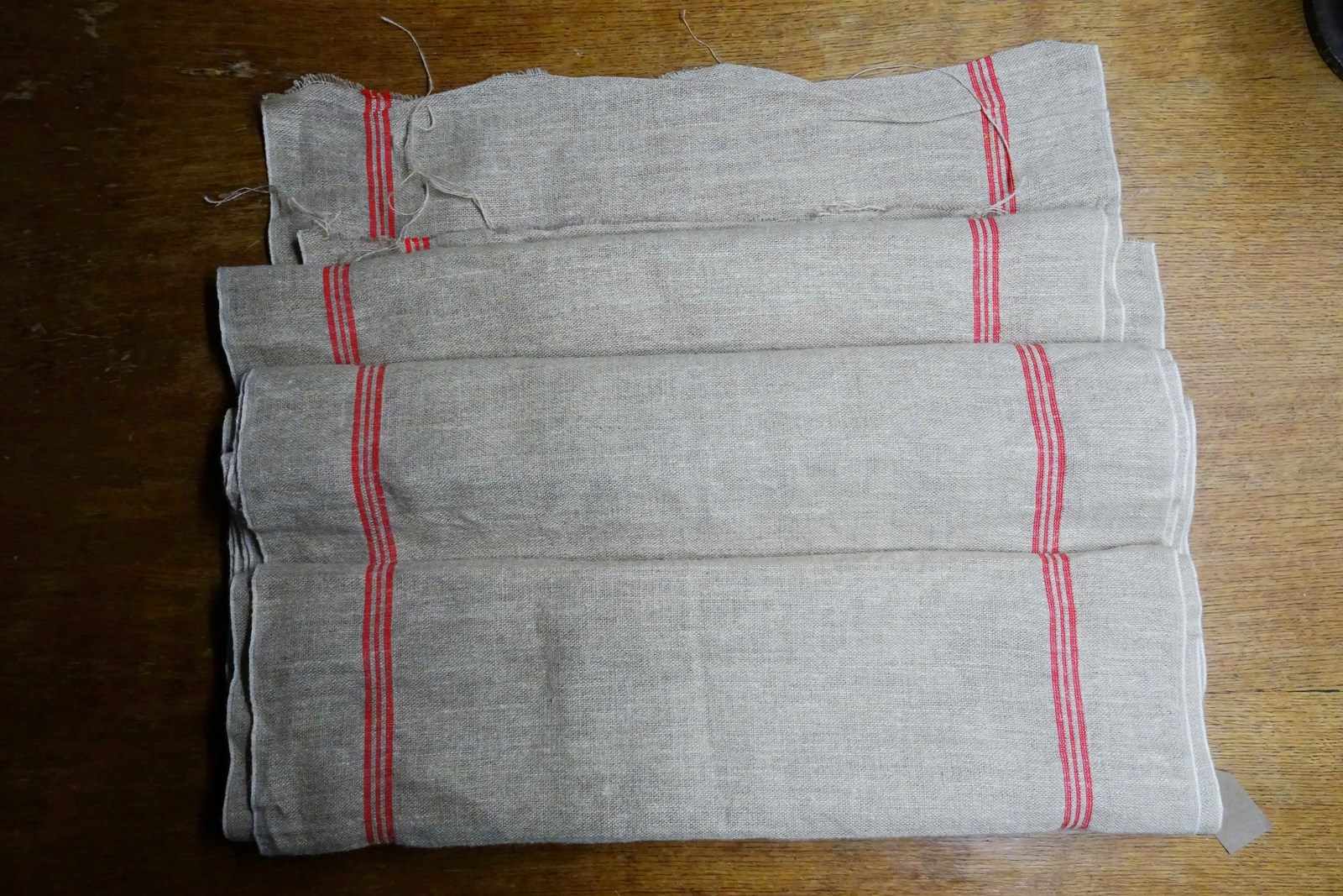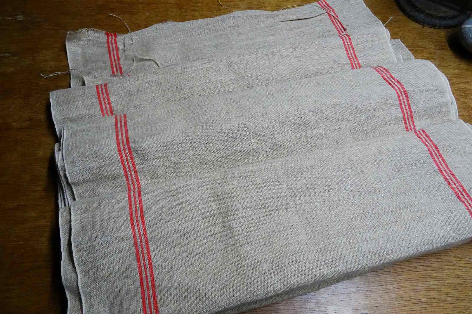 This is hemp (rather than linen) and it has such a lovely feel to it. A warm beigey-stone colour with traditional woven warp stripes in a bright red (some of my photos are a bit dark). This piece has never been laundered. It is clean and ready for use but with washing it will tighten up and lighten in colour a little too.
