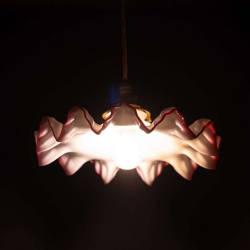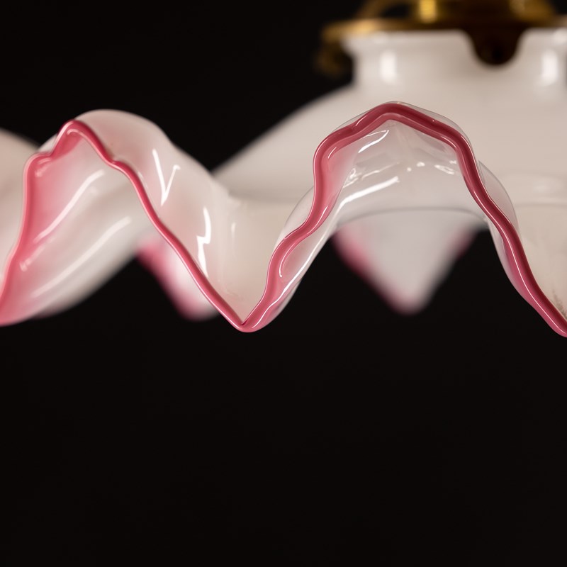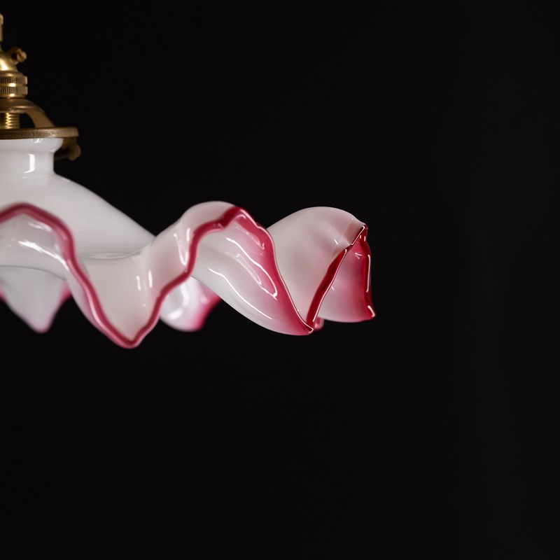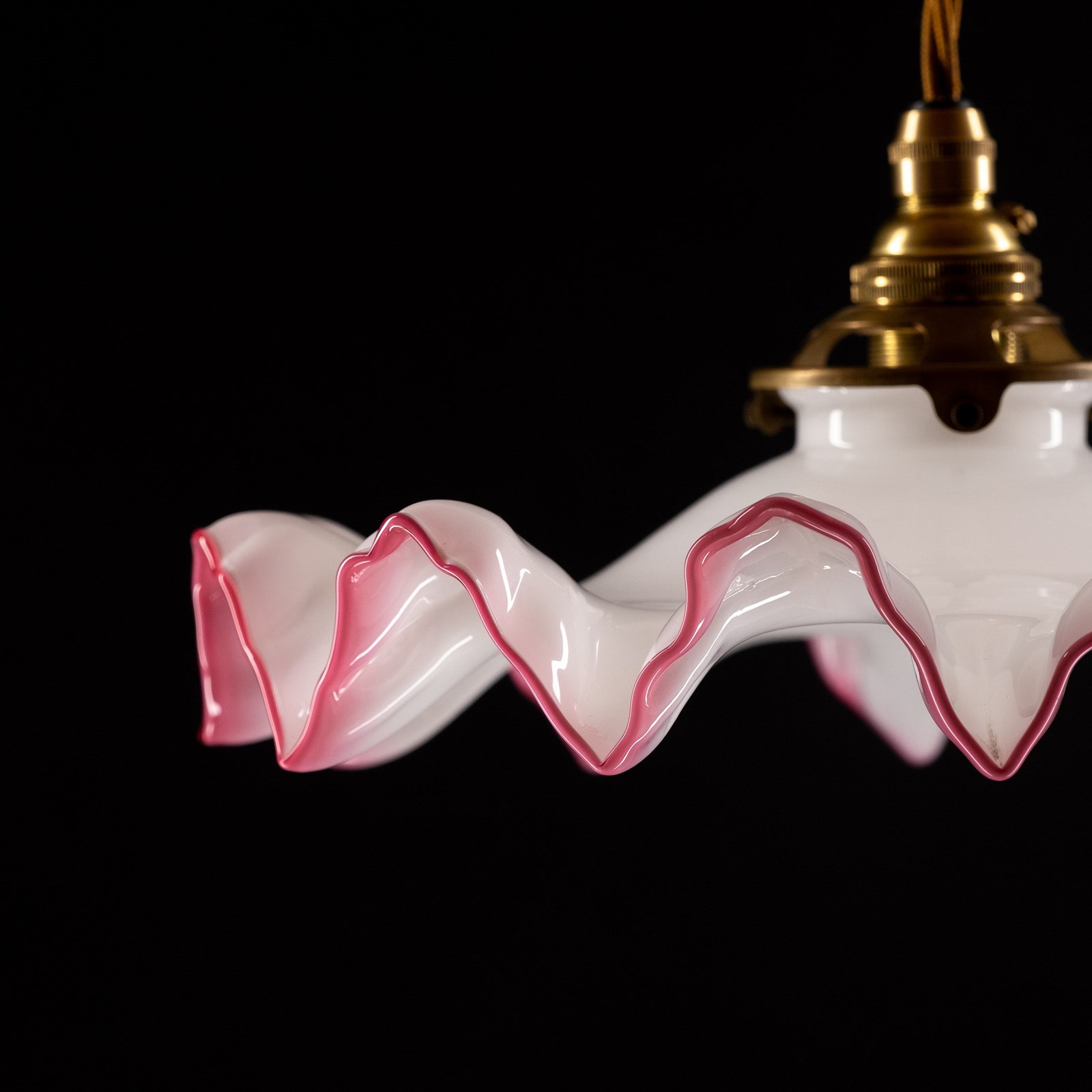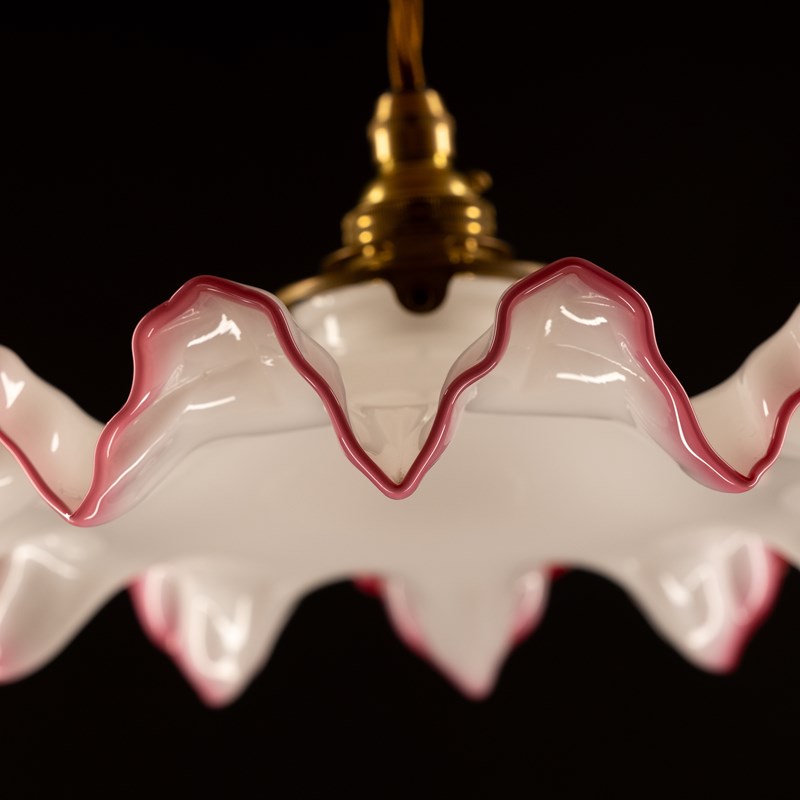 A lovely high gloss white fluted shade with dark pink shaded rim. A fab piece; stylish and pretty.