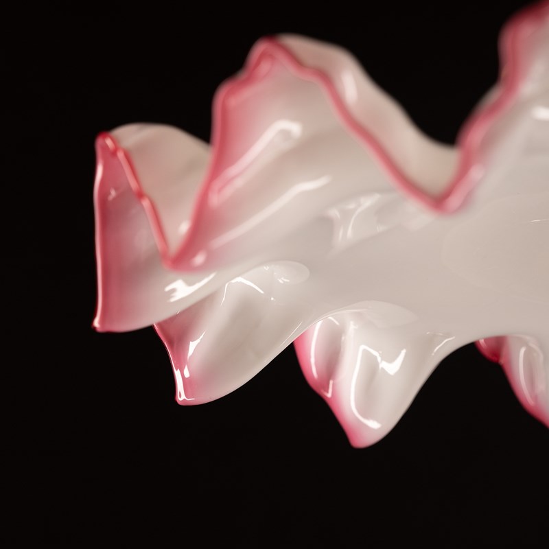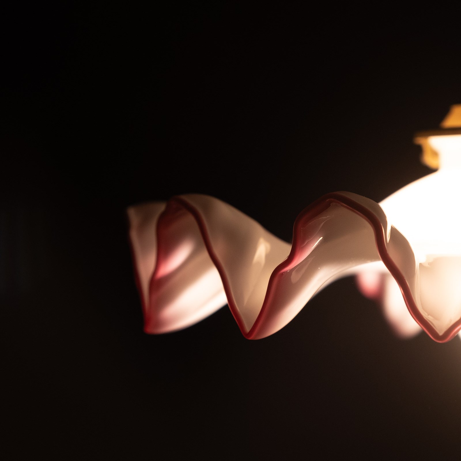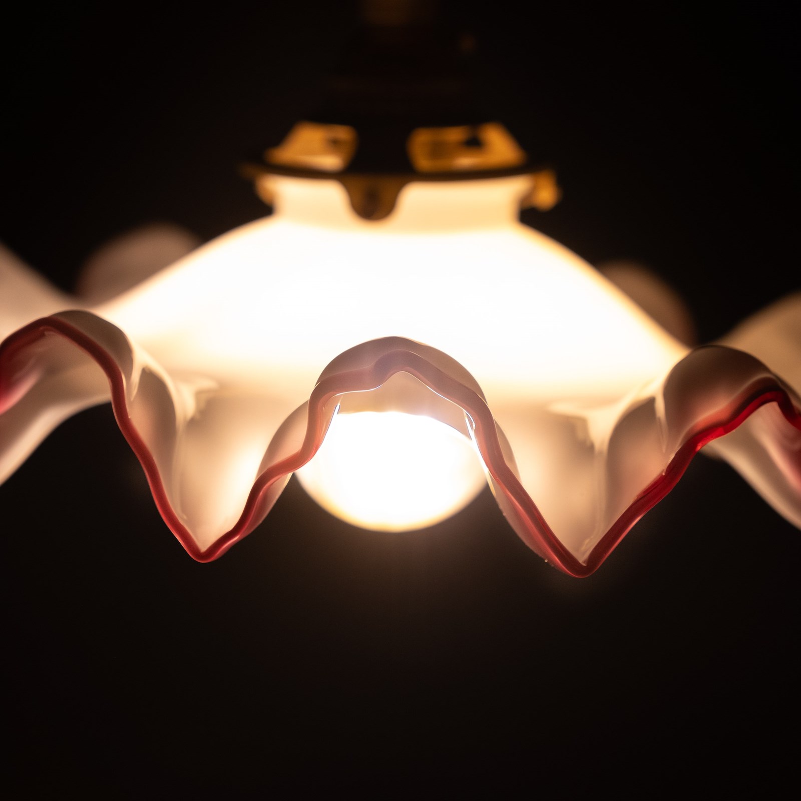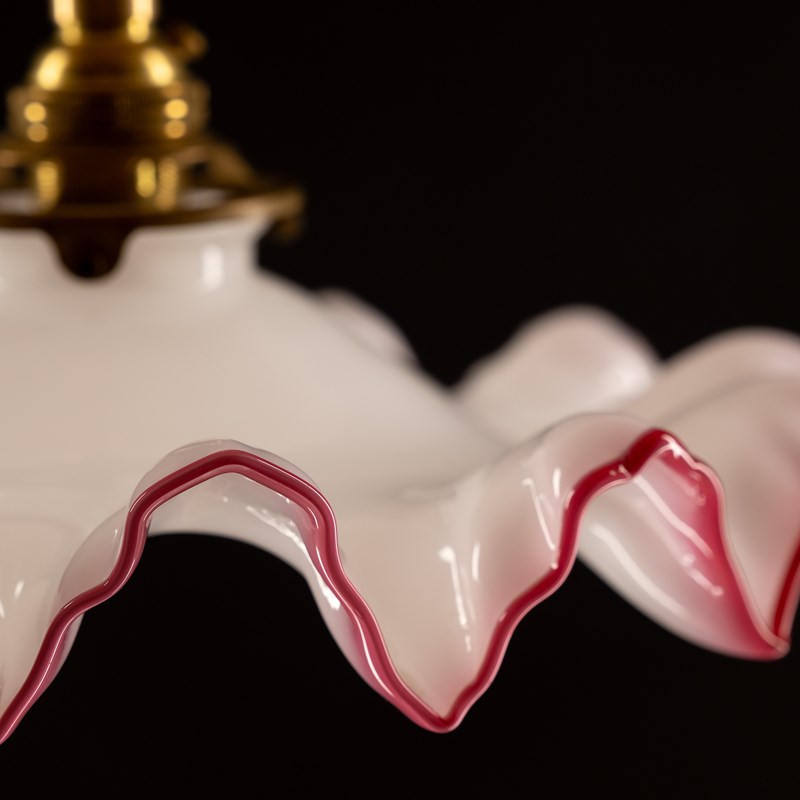 A lovely high gloss white fluted shade with dark pink shaded rim. A fab piece; stylish and pretty.