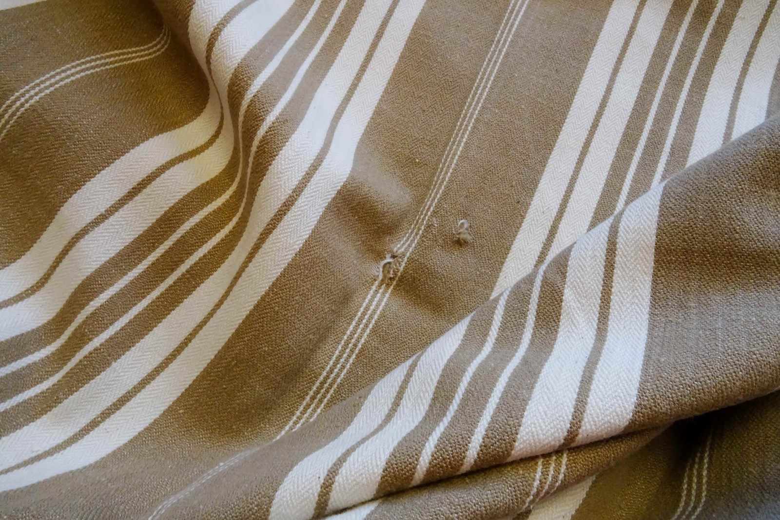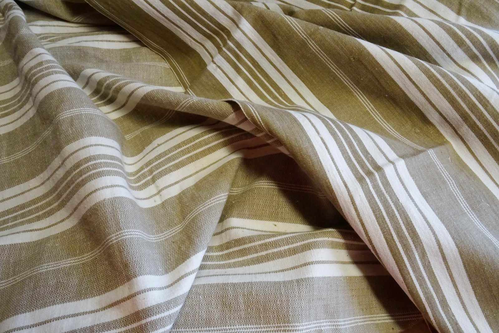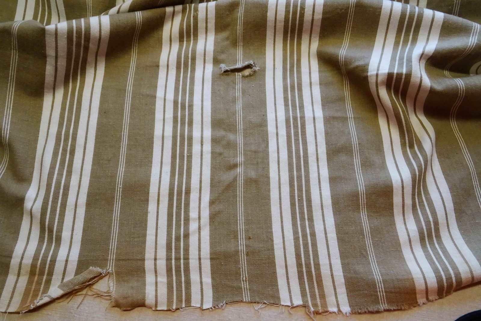 A piece of vintage French herringbone weave striped mattress ticking dating to the early 1900s. Colour is a sandy/beige/khaki and soft creamy white stripe.