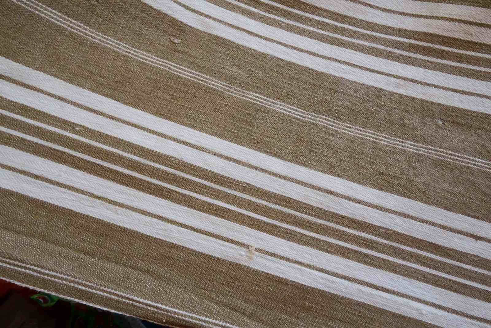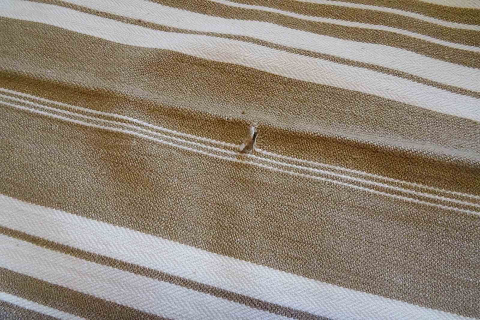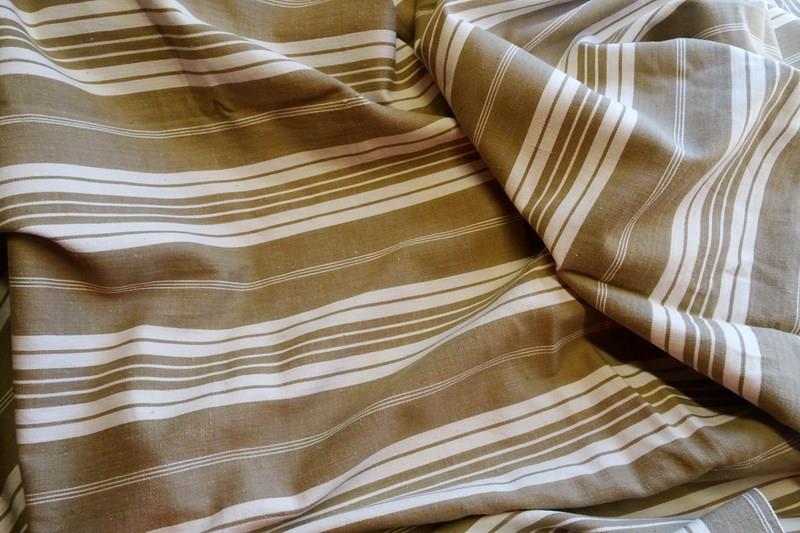 A piece of vintage French herringbone weave striped mattress ticking dating to the early 1900s. Colour is a sandy/beige/khaki and soft creamy white stripe.