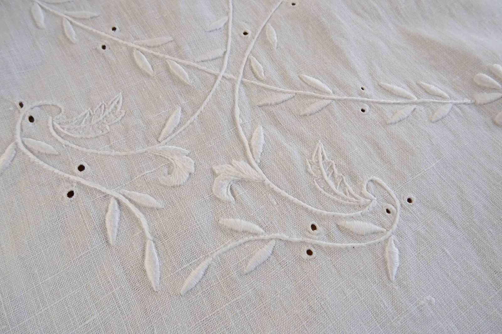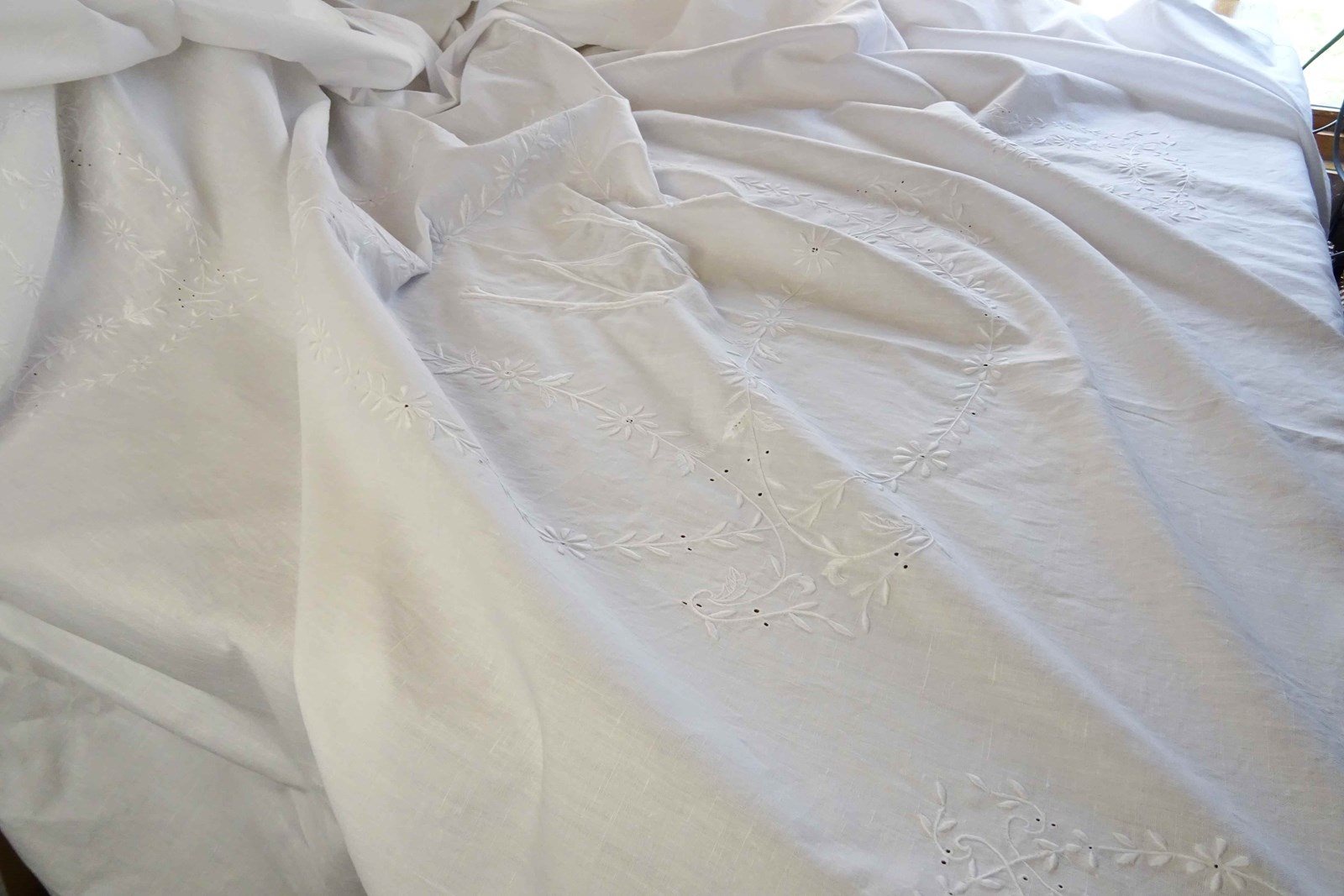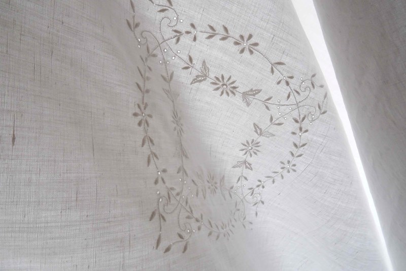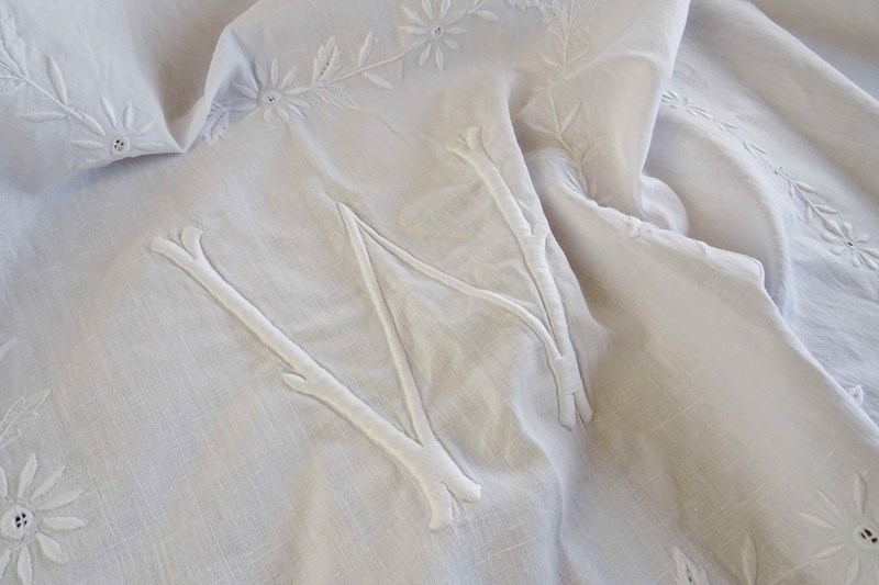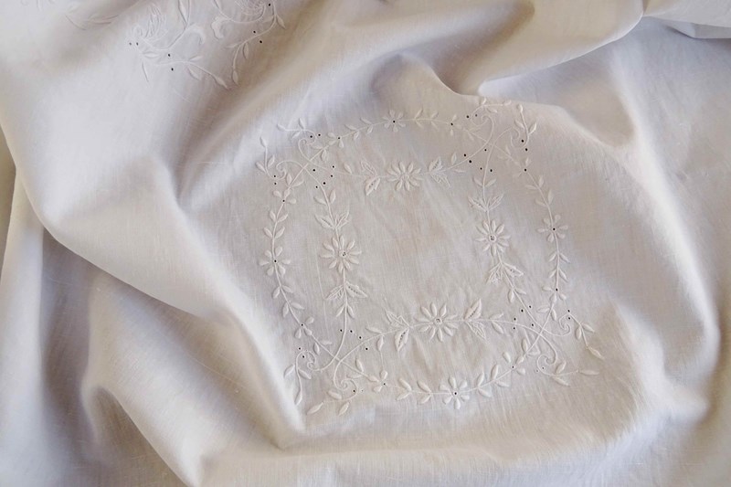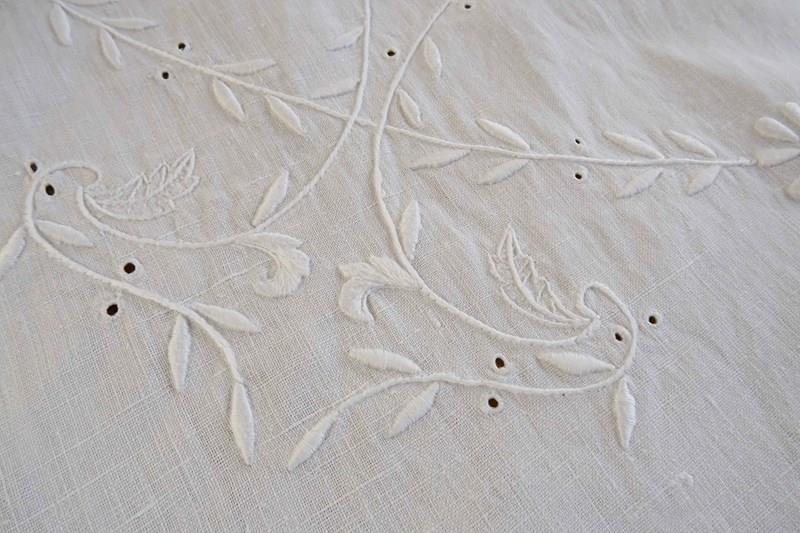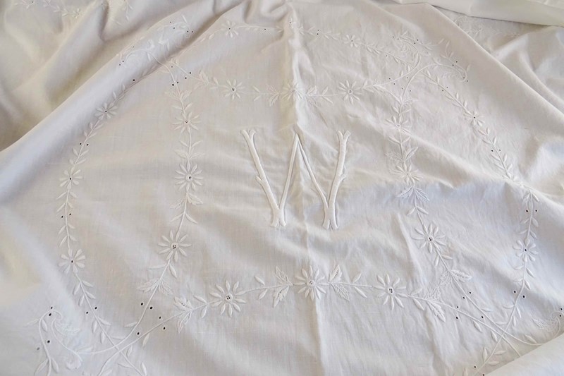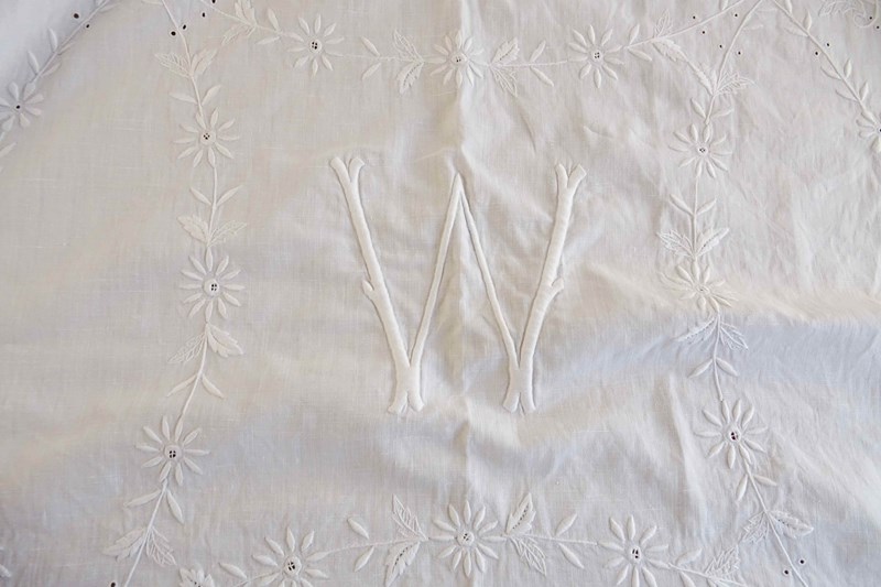 This is a stunning piece. A huge hand embroidered bedspread (or a fab tablecloth) with central monogram of a large W surrounded by such pretty floral designs, each with delicate tiny cutwork highlights. Or of course this would look amazing hung at a window with that monogram in the centre, the linen will filter the light beautifully, really showcasing the decoration.