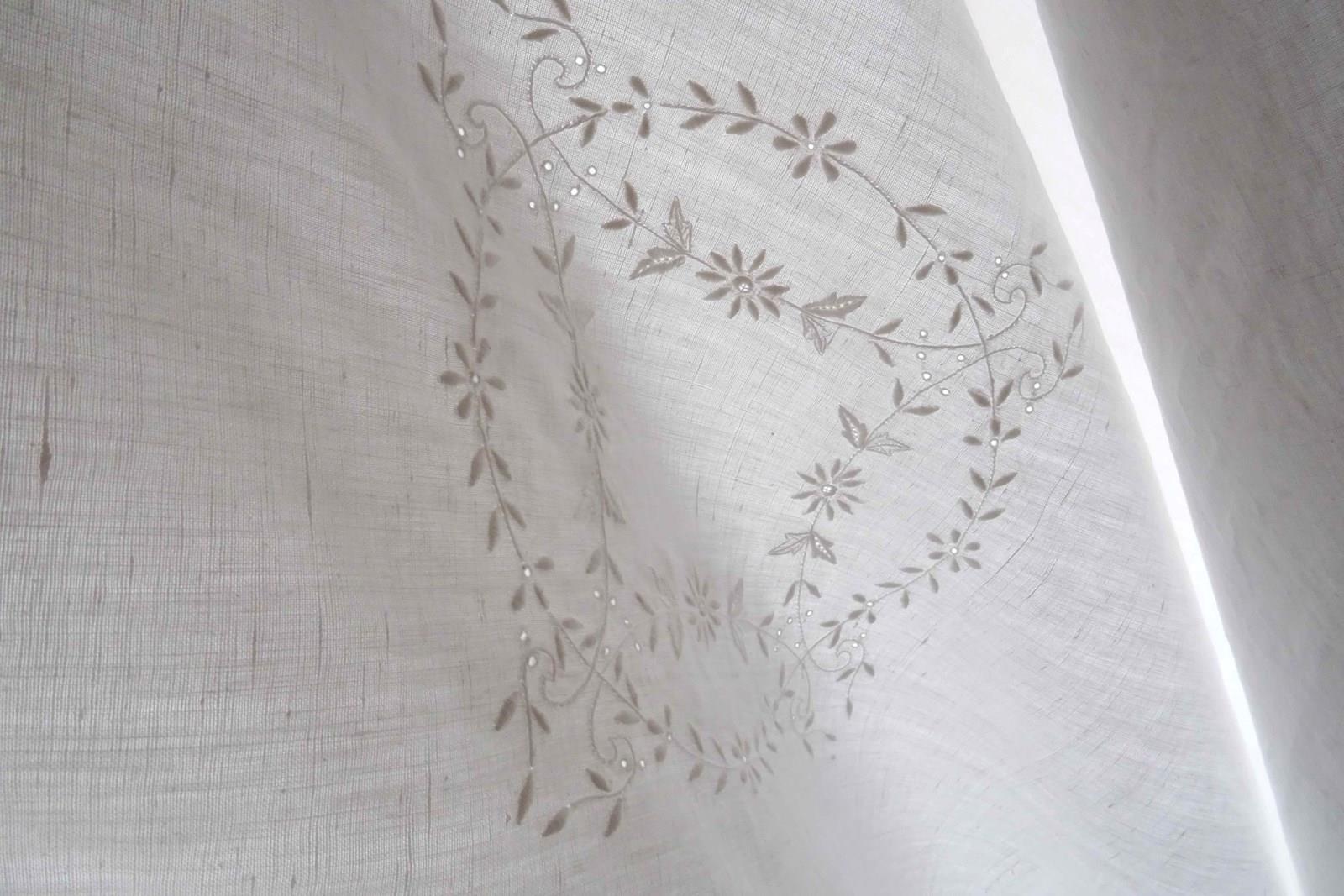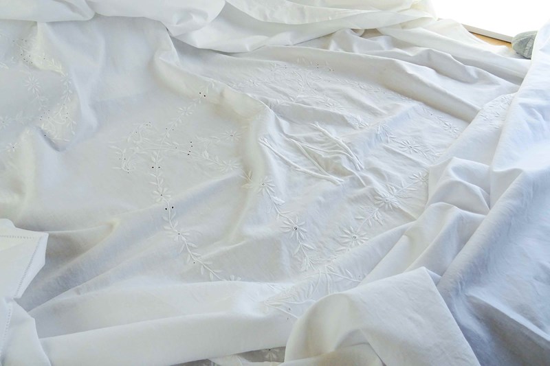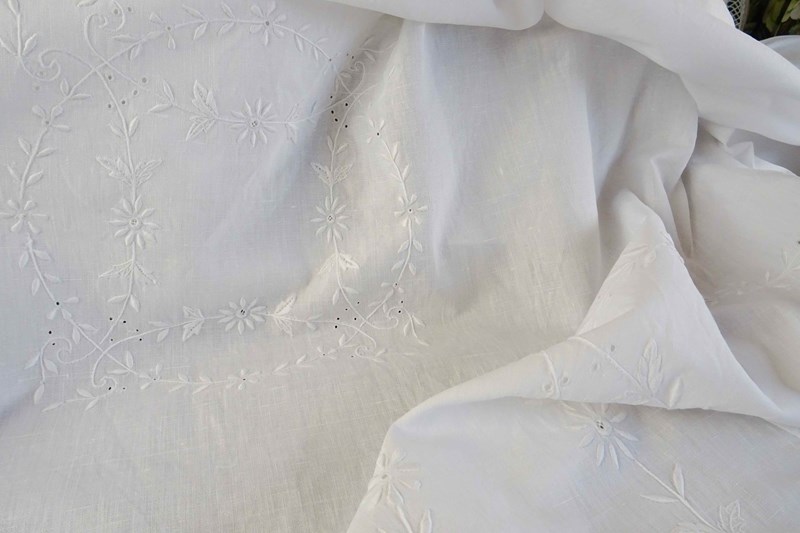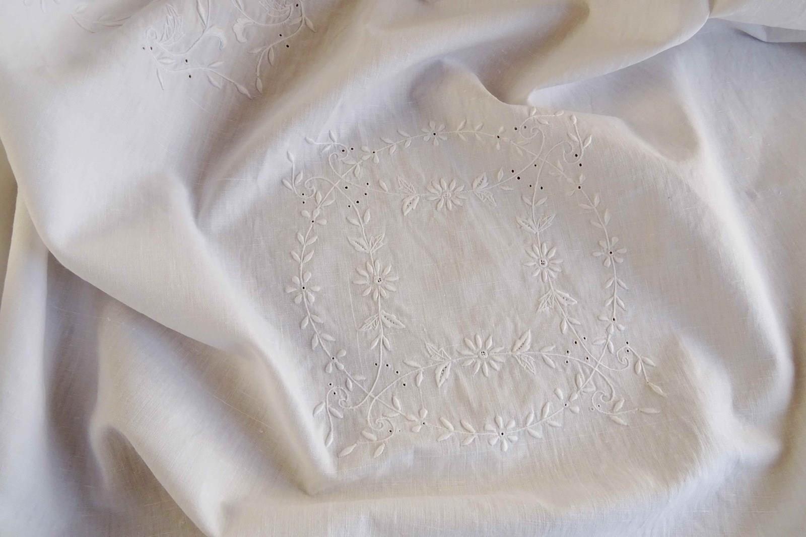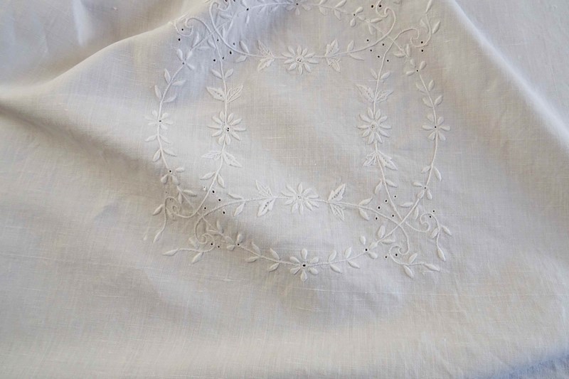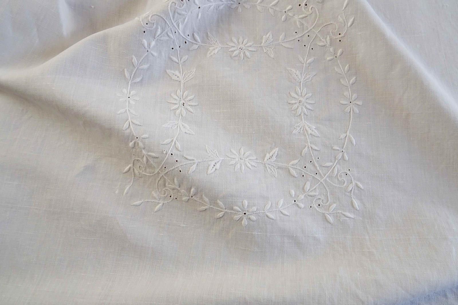 This is a stunning piece. A huge hand embroidered bedspread (or a fab tablecloth) with central monogram of a large W surrounded by such pretty floral designs, each with delicate tiny cutwork highlights. Or of course this would look amazing hung at a window with that monogram in the centre, the linen will filter the light beautifully, really showcasing the decoration.