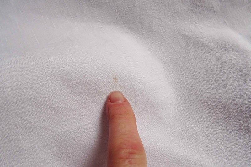 Freshly laundered and ready for use. One tiny dot mark but I think that's all and one very tiny nick at the side. Generally all over excellent!