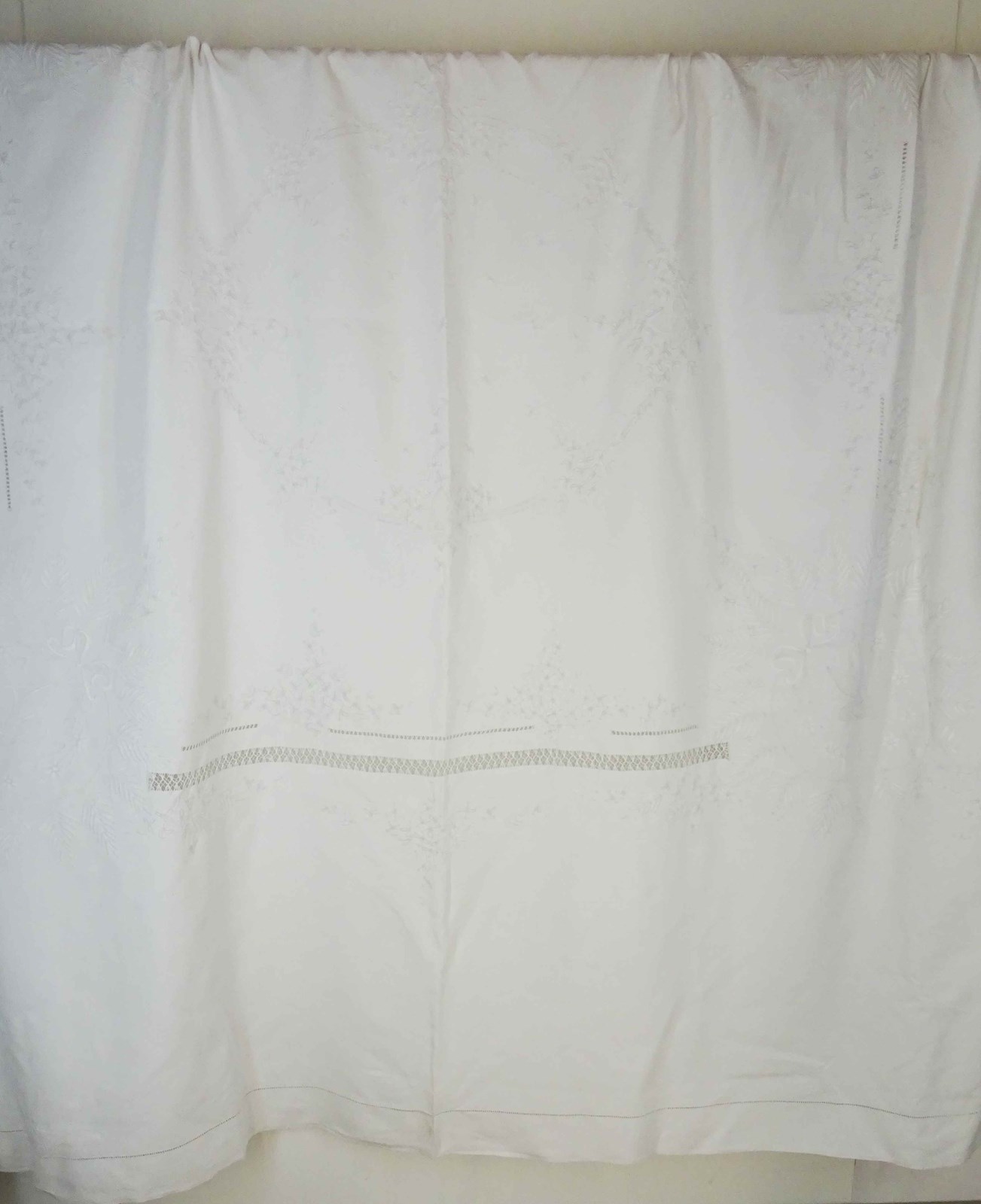 A glorious early 1900s French fine white linen bedspread encrusted with elegant embroidered decoration. Wouldn't this make a stunning tablecloth for a wedding feast? Or a wonderful curtain, it's fabulous.