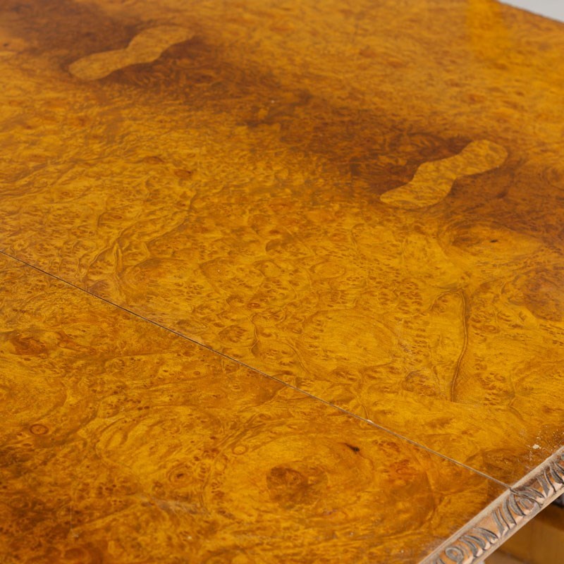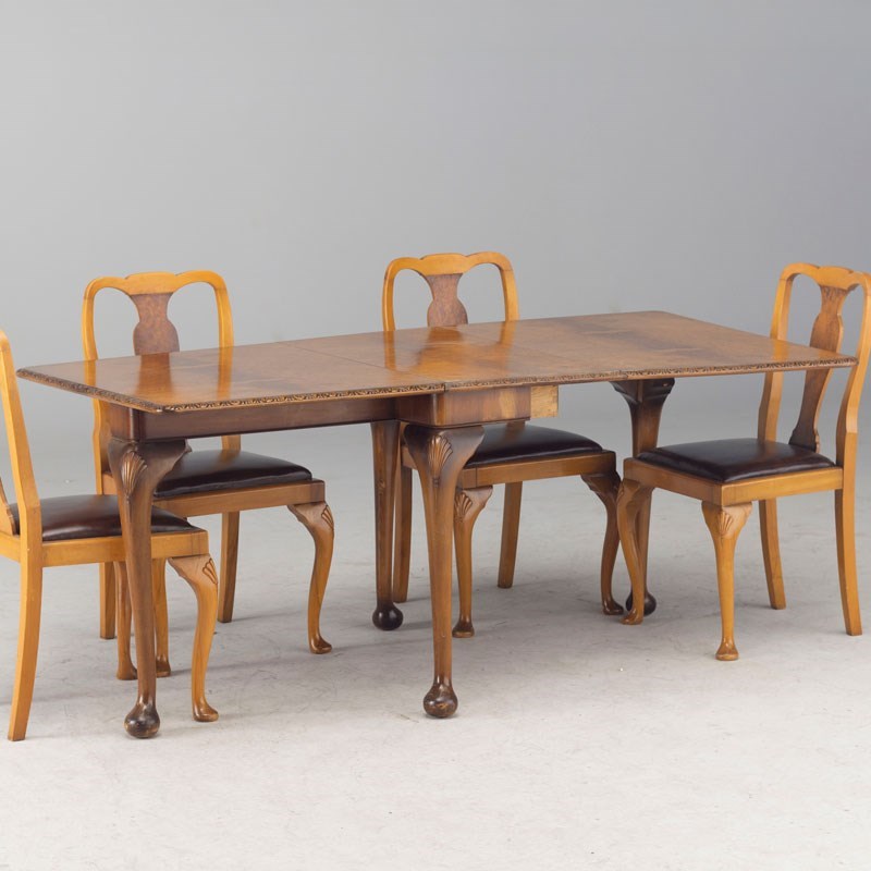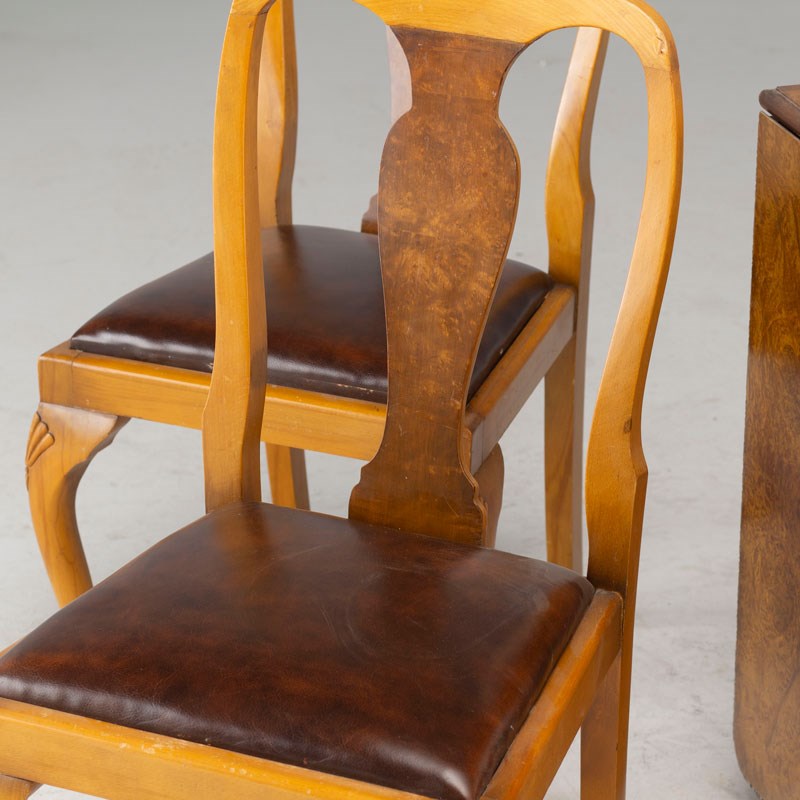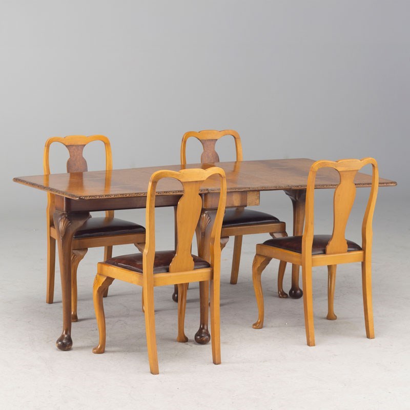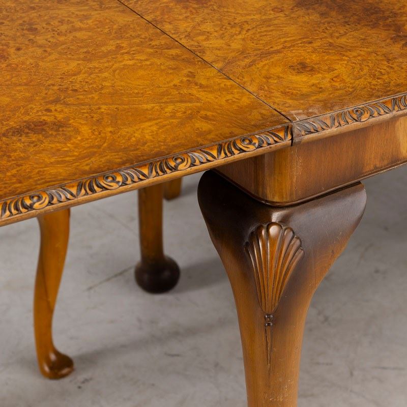 Burr walniut folding gate leaf dining table with 4 upholstered dining chairs.