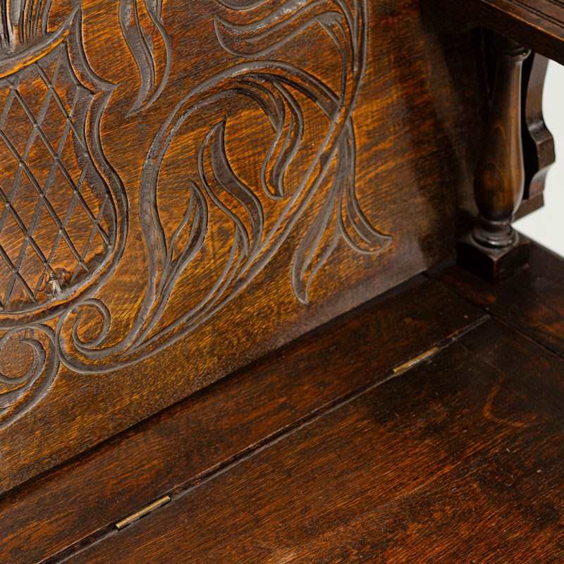 Fabulous carved oak Monk's bench. This adaptable piece of furniture works as an occasional bench as well as a side table. There is also storage space under the hinged seat.