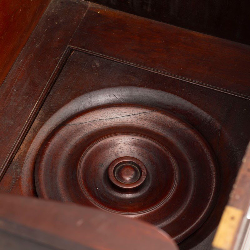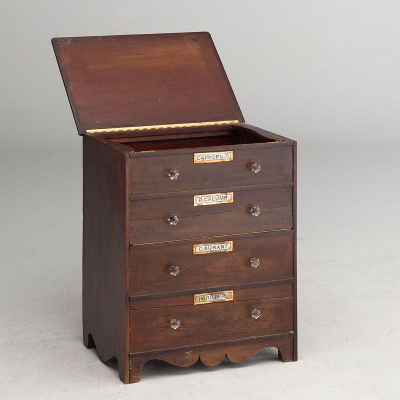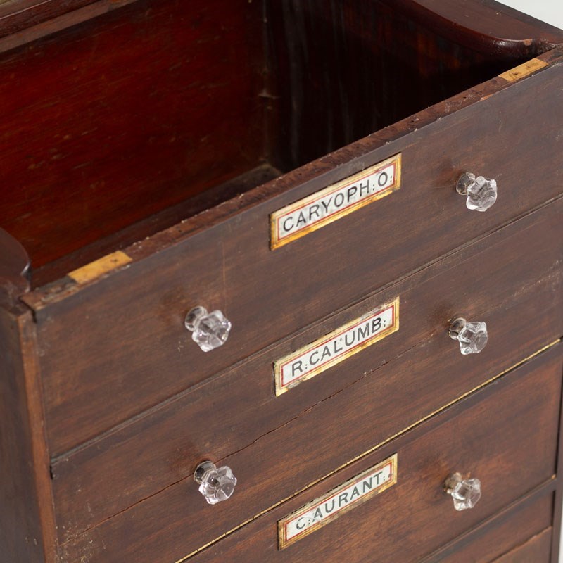 The front panel formed of 4 faux apothecary drawers with glass latin pharmaceutical name plaques and glass knobs.