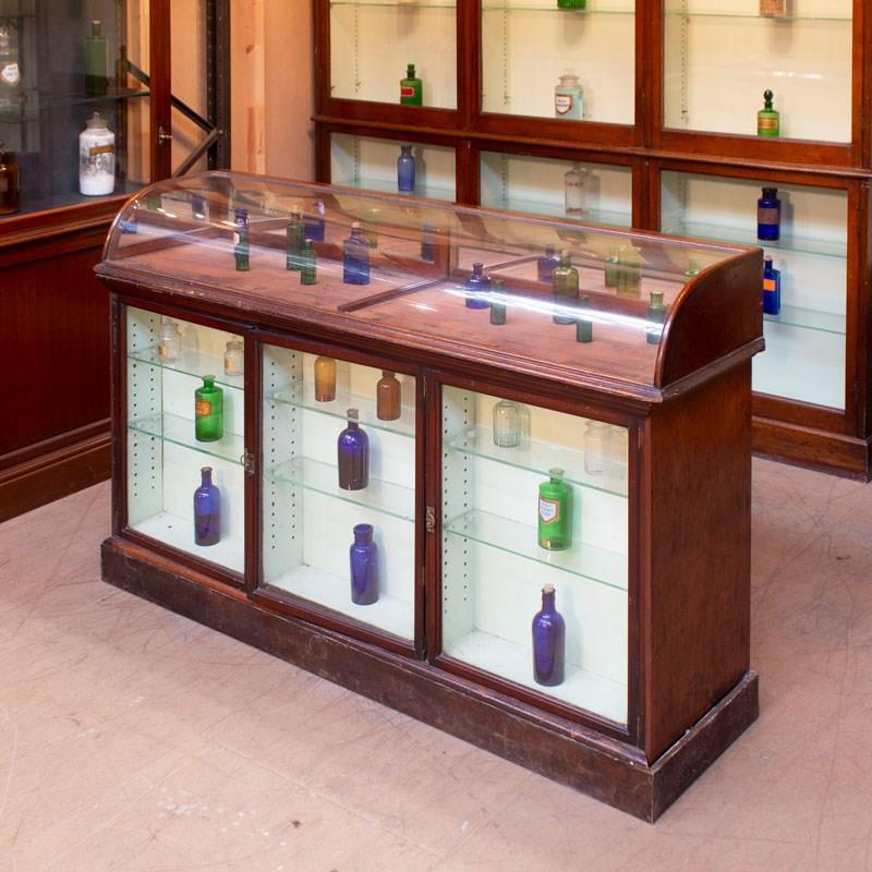High quality Jeweller's counter in Mahogany with bowed top and glazed doors to the front.