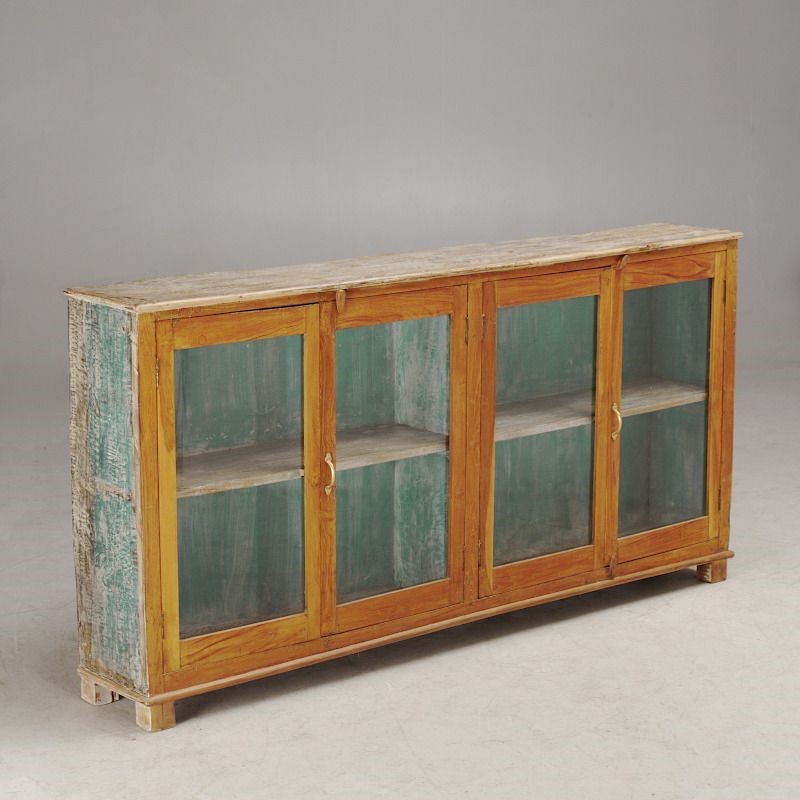 Wooden haberdashery display cabinet with an unusual steel back. Lovely vintage green patina Circa 1930