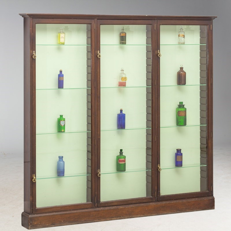 Large Edwardian jeweller's cabinet with three front doors in mahogany.