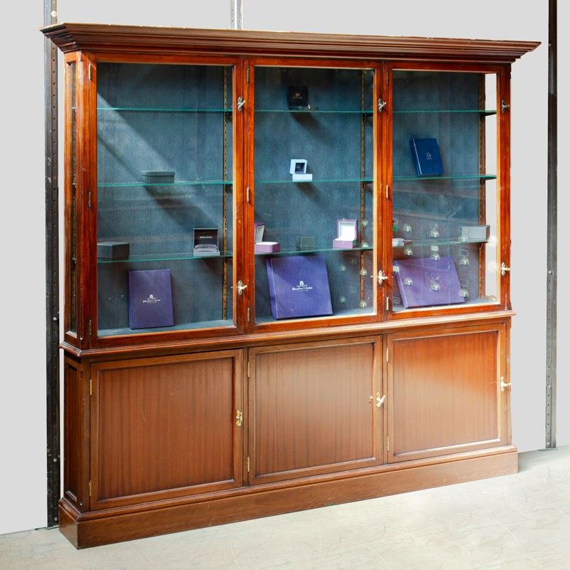Mahogany shop cabinet dating to the early 1900's with brass hardware and glass shelves.