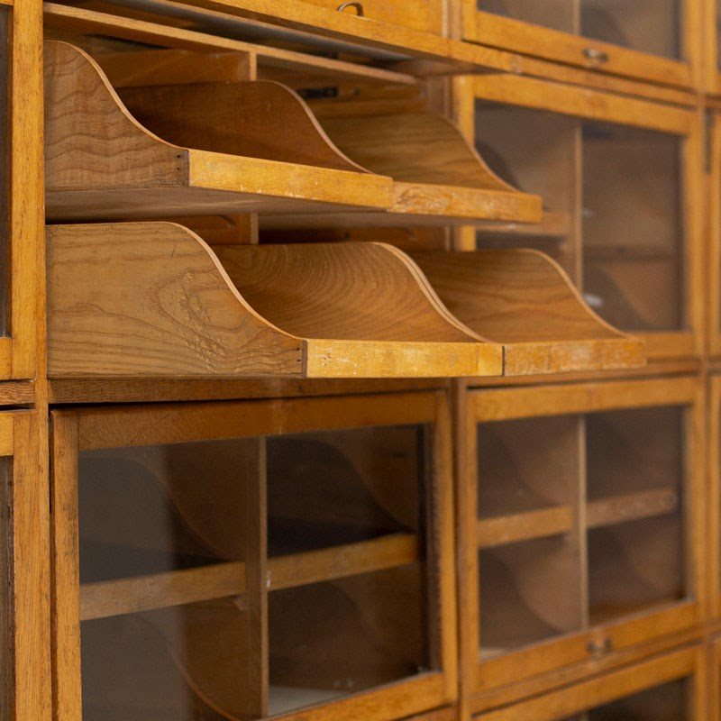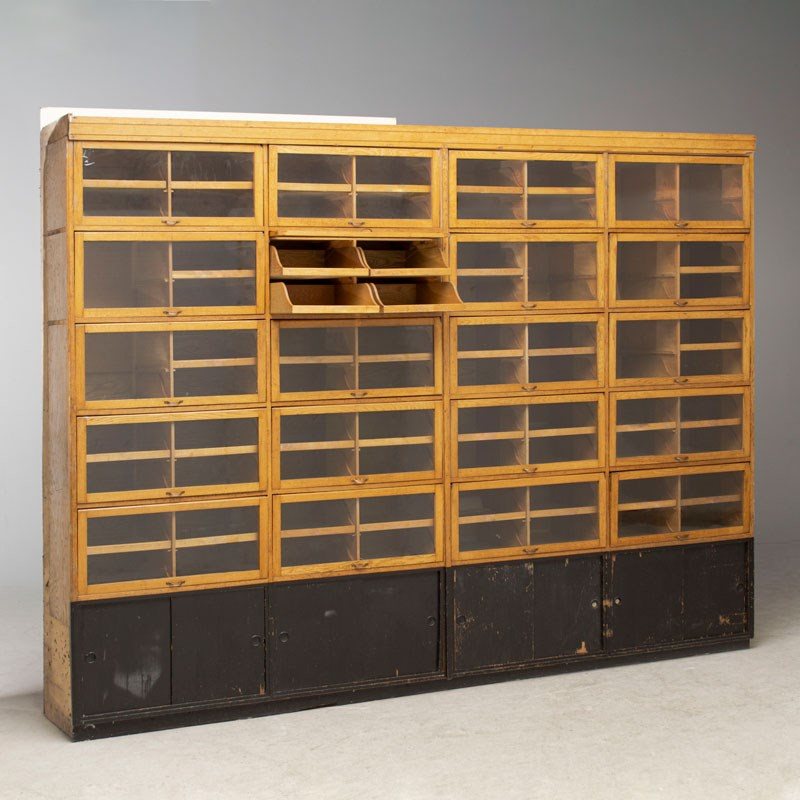 Antique draper's wall cabinet dating to the 1940's, originally from Bailey's department store in Bqarnsley.