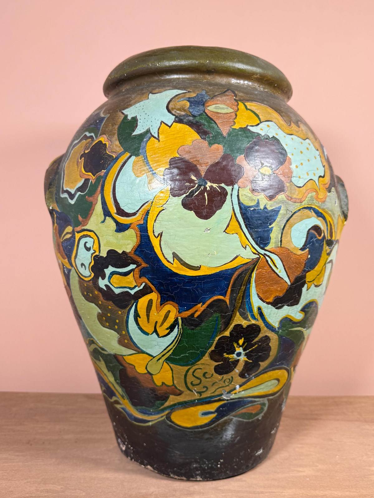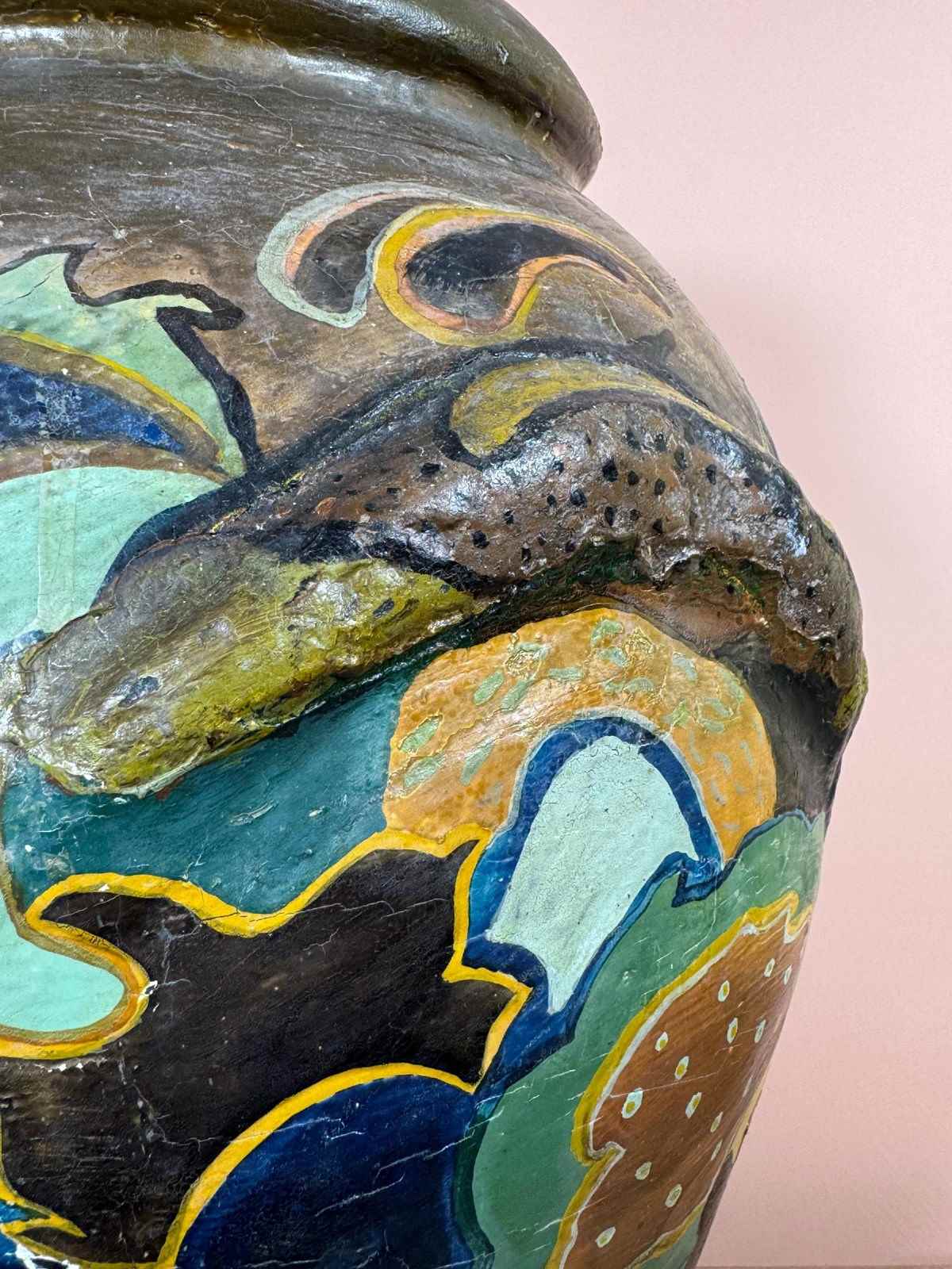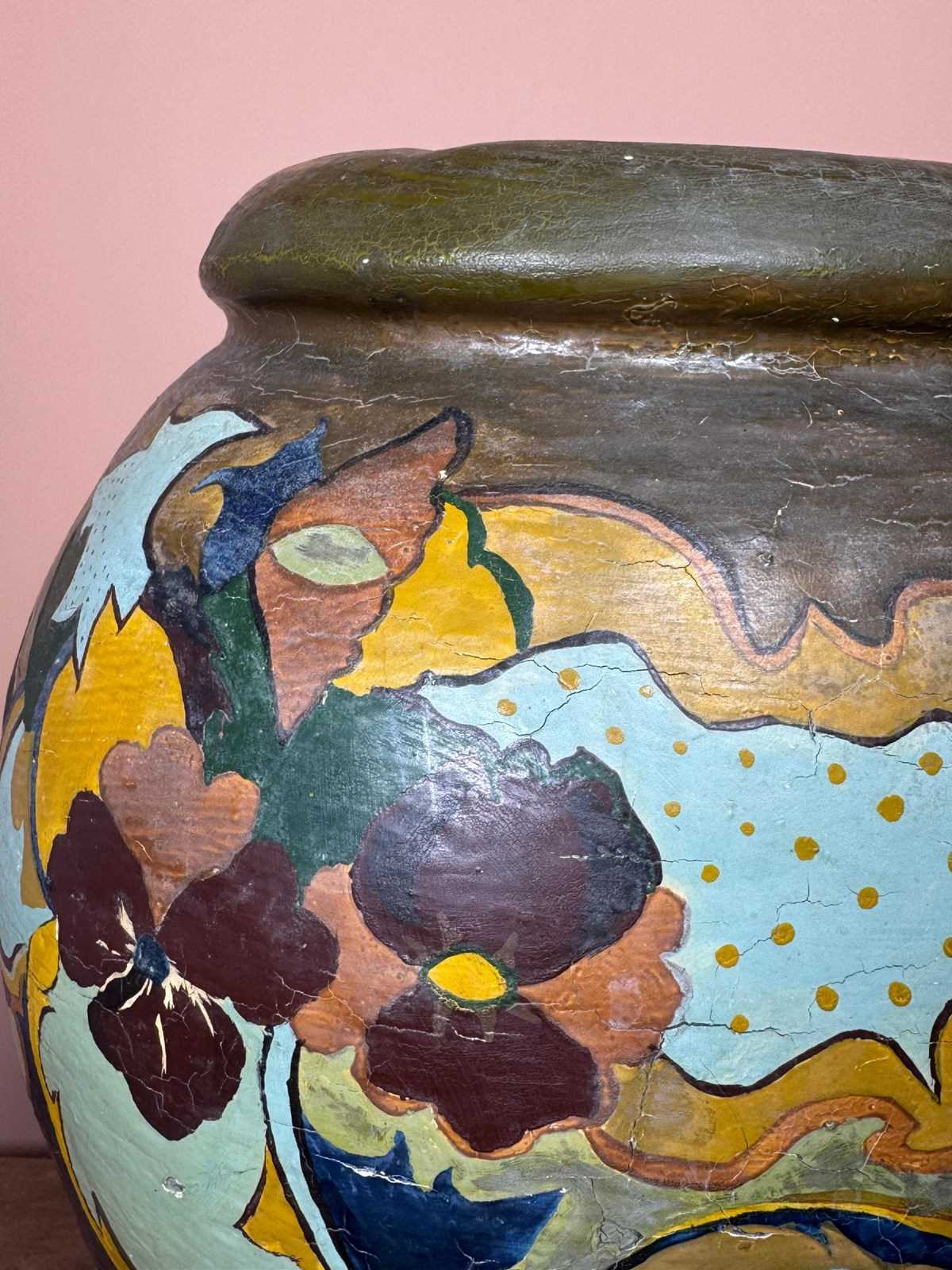 Large terracotta pot, decorated in the Gouda style, drainage hole in bottom.