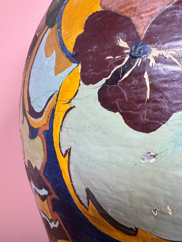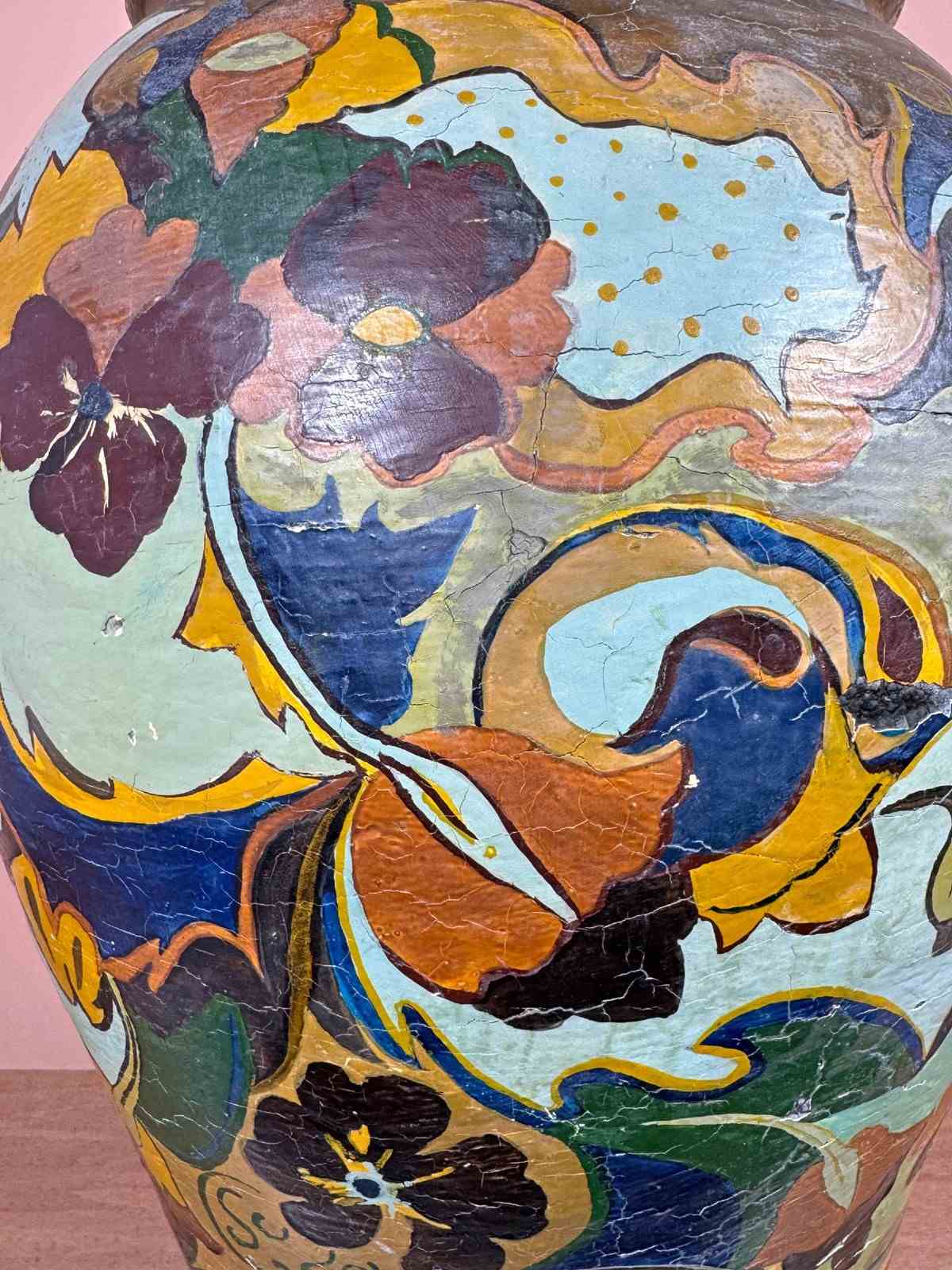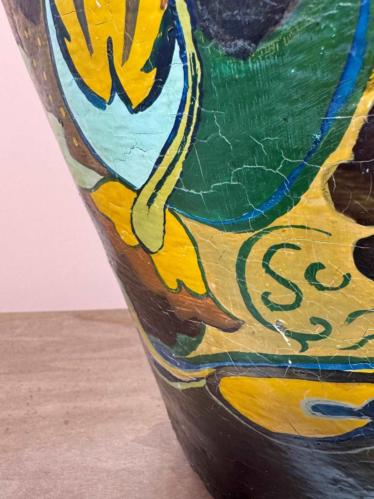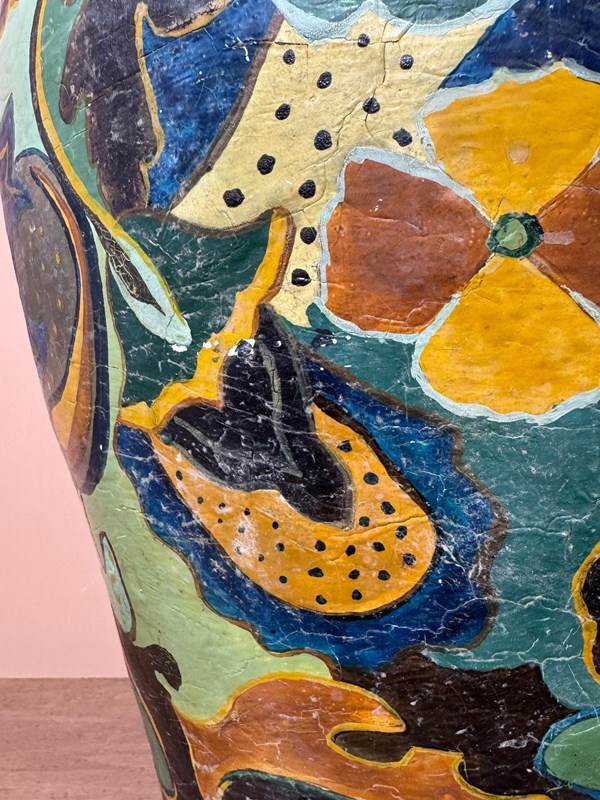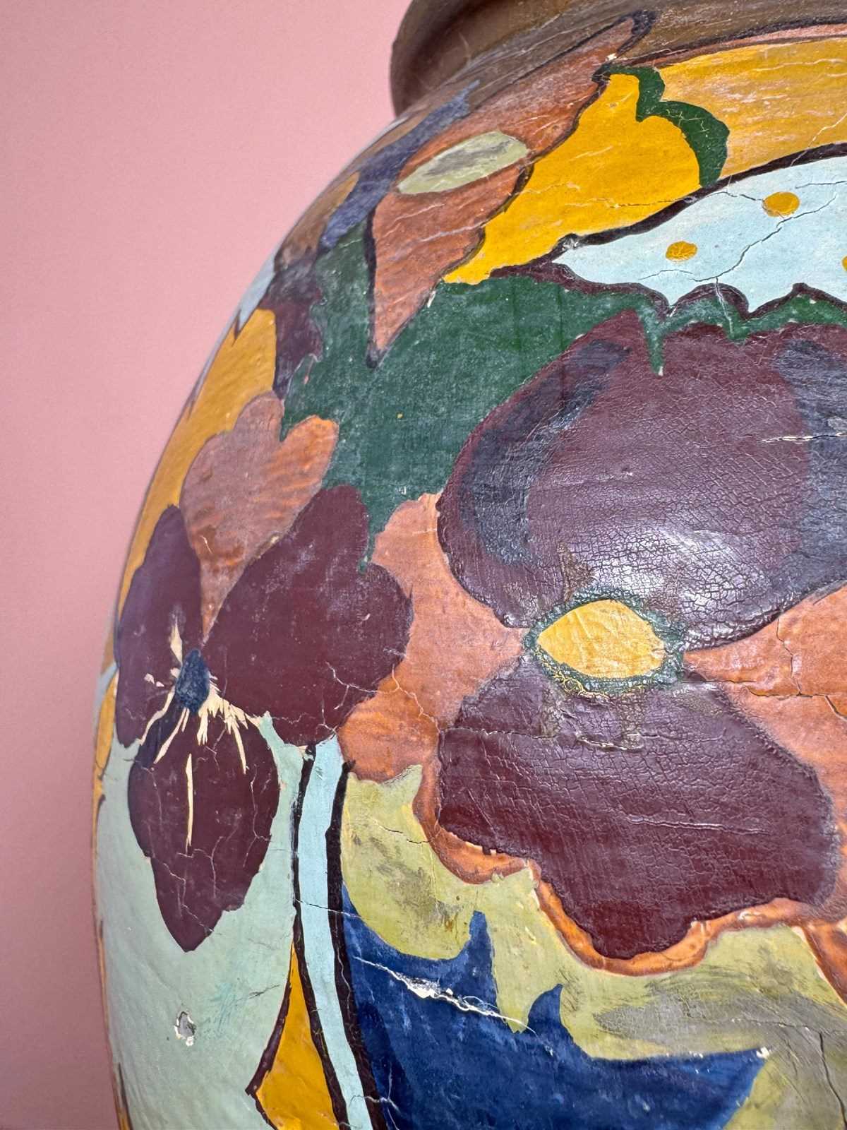 Large terracotta pot, decorated in the Gouda style, drainage hole in bottom.