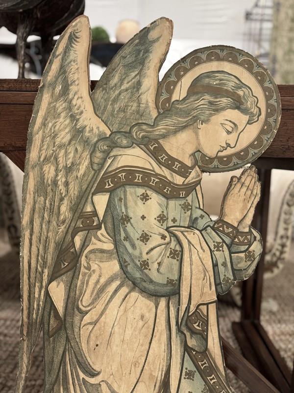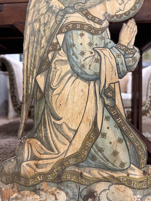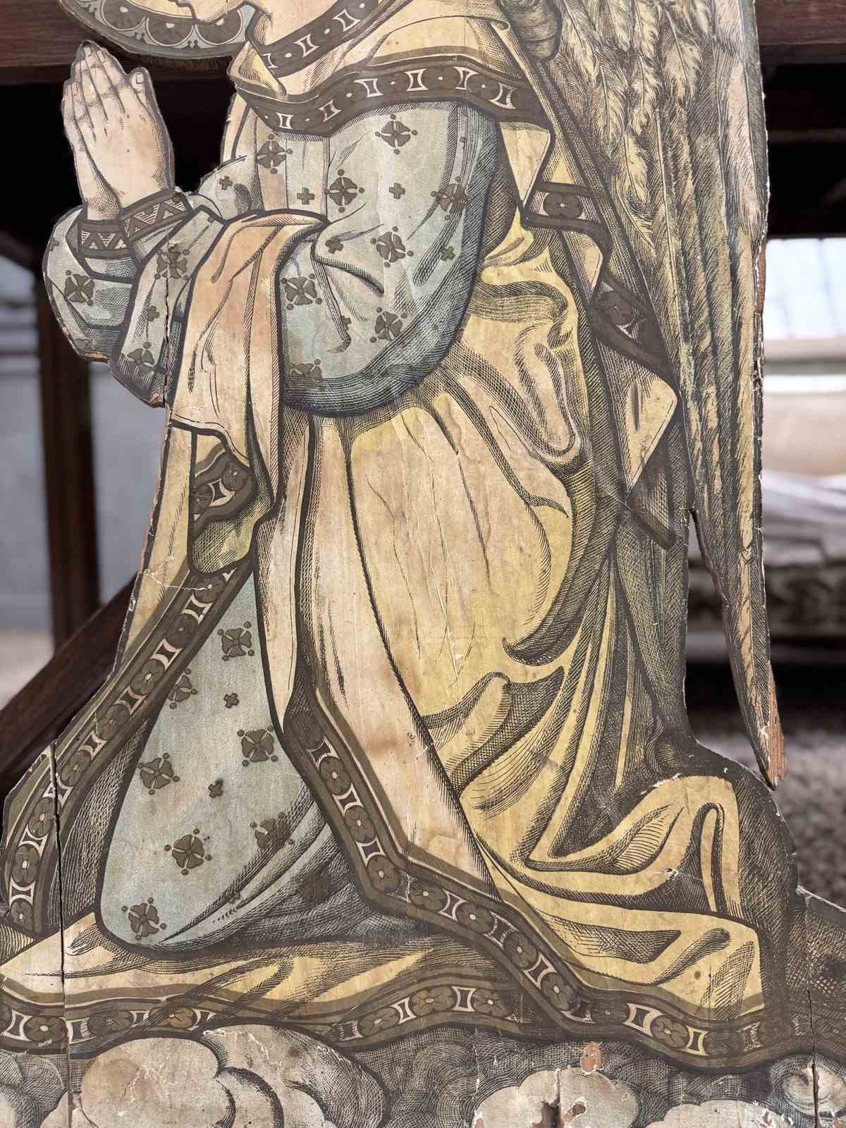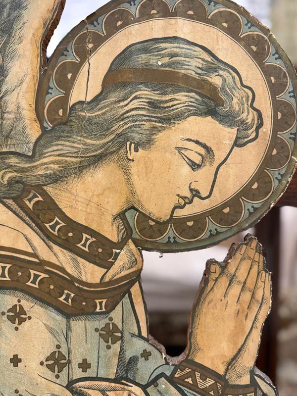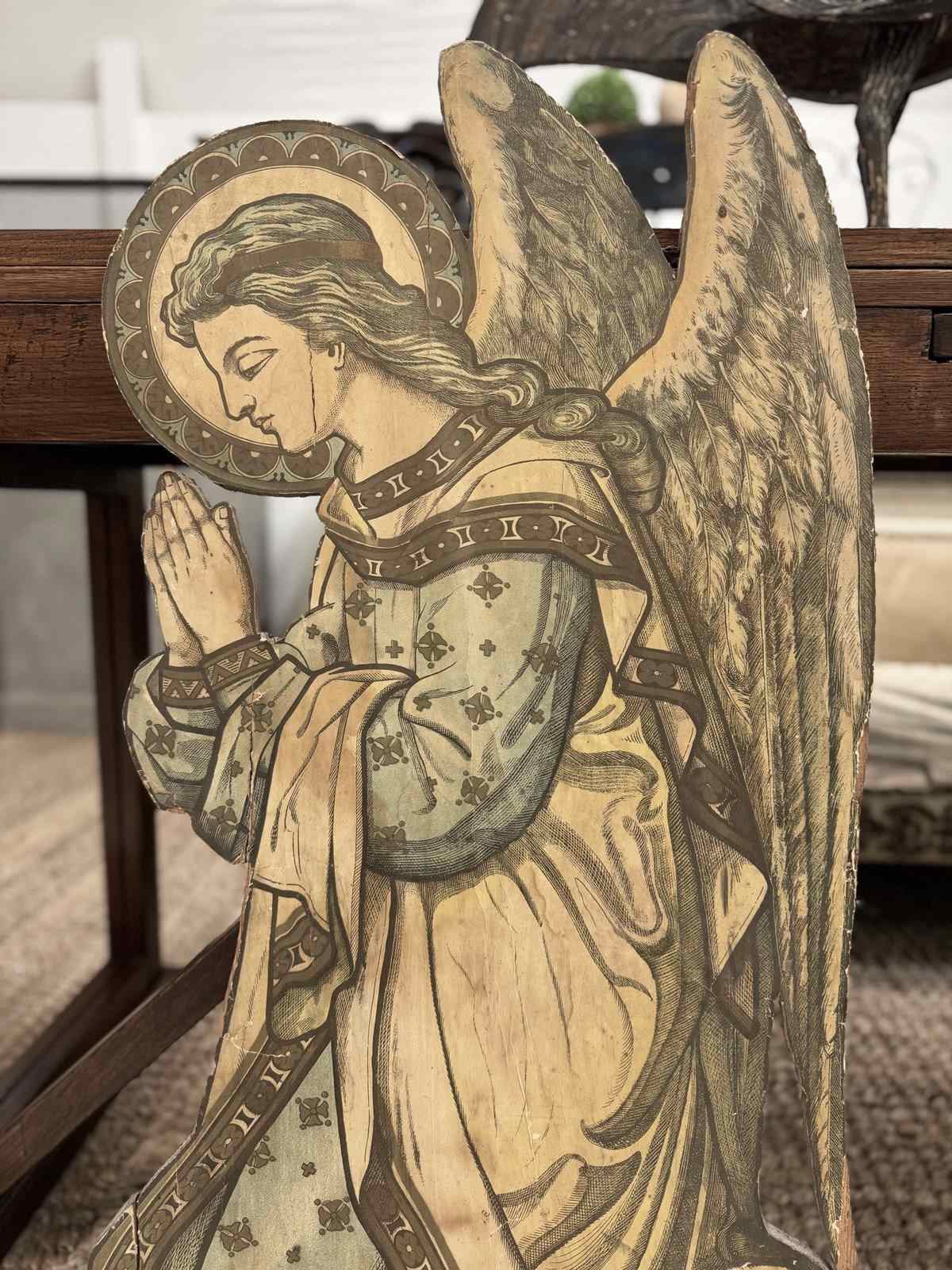 A charming pair of early 20th century French antique wood panels with the front overlaid with paper pictures depicting winged and haloed Angels, long wavy hair and bellowing robes, with beautiful faces and hands clasped knelt in prayer, seated on clouds.