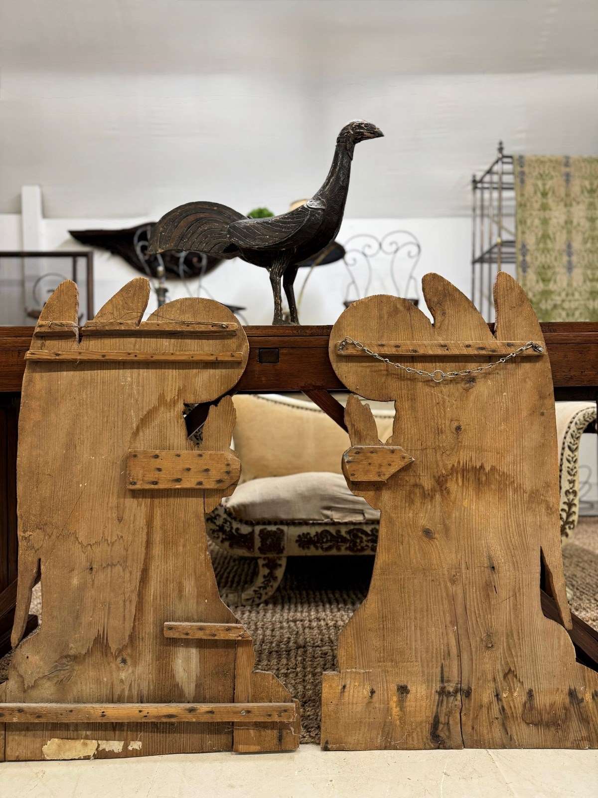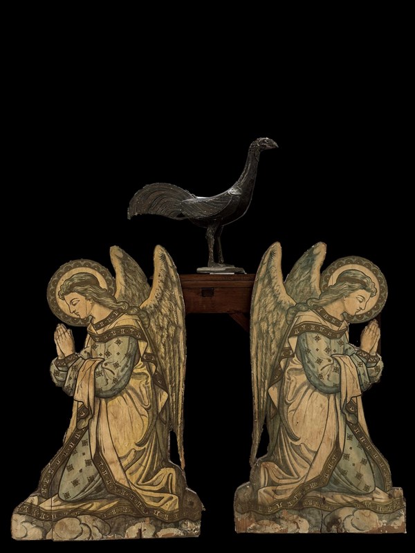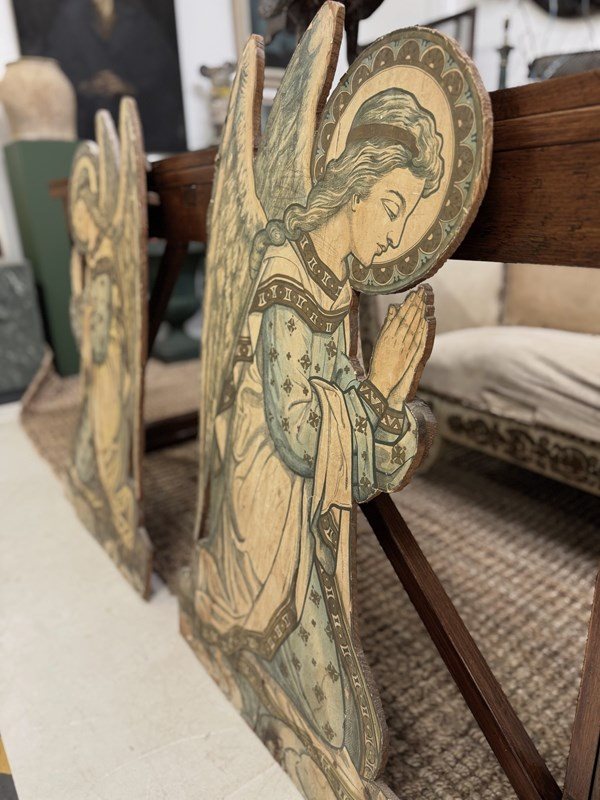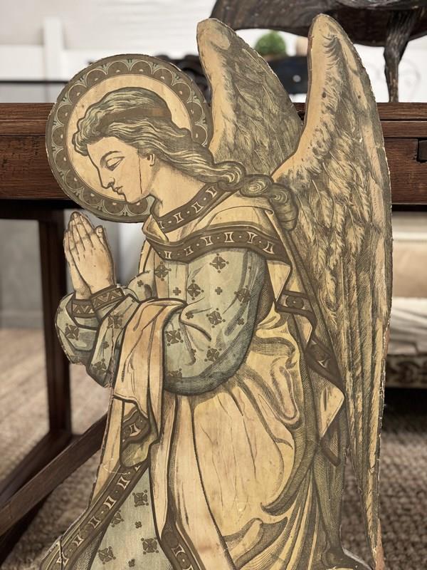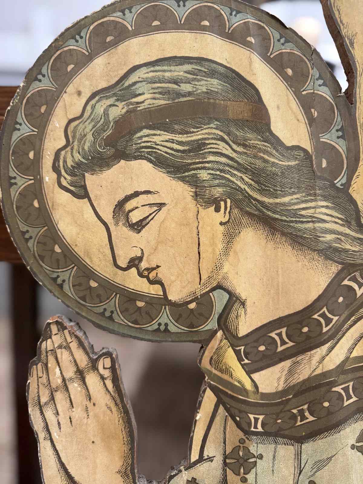 A charming pair of early 20th century French antique wood panels with the front overlaid with paper pictures depicting winged and haloed Angels, long wavy hair and bellowing robes, with beautiful faces and hands clasped knelt in prayer, seated on clouds.