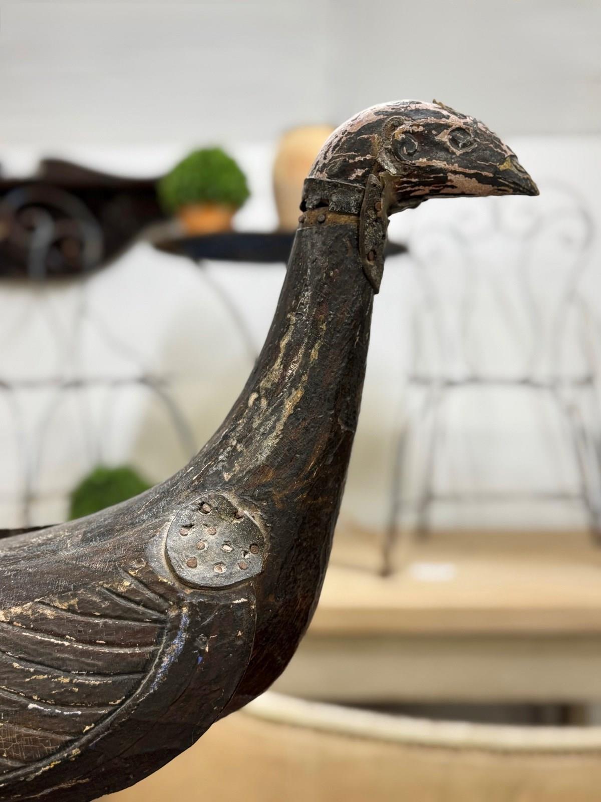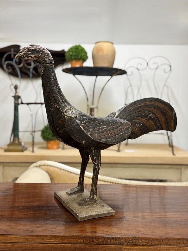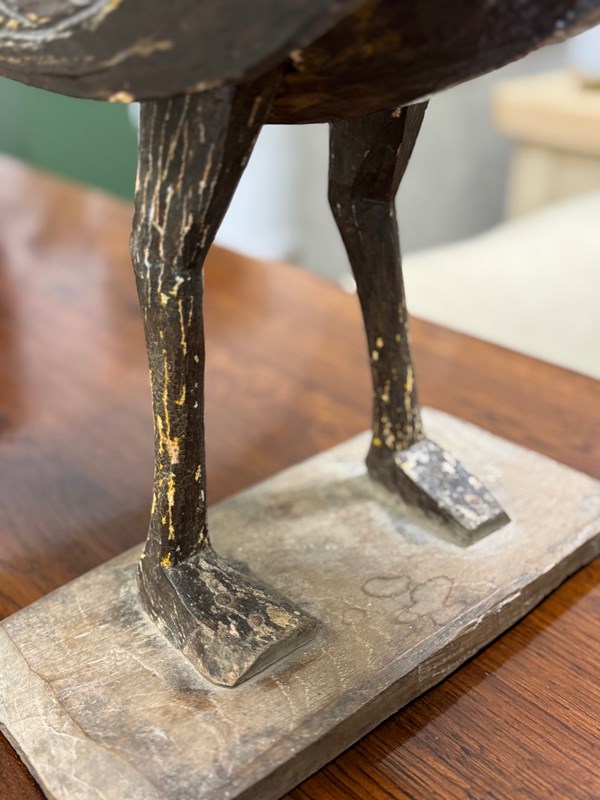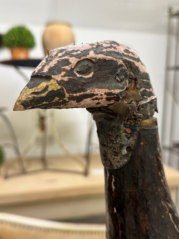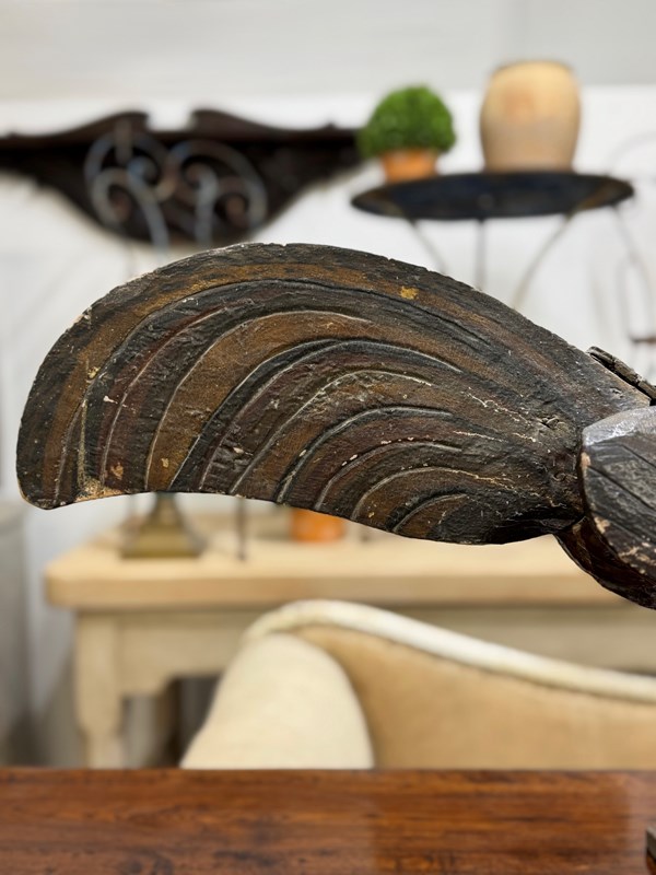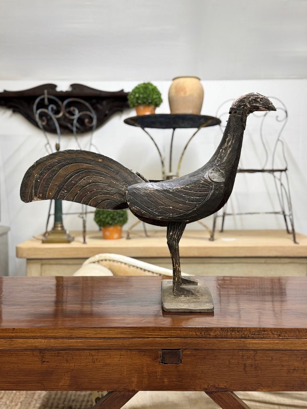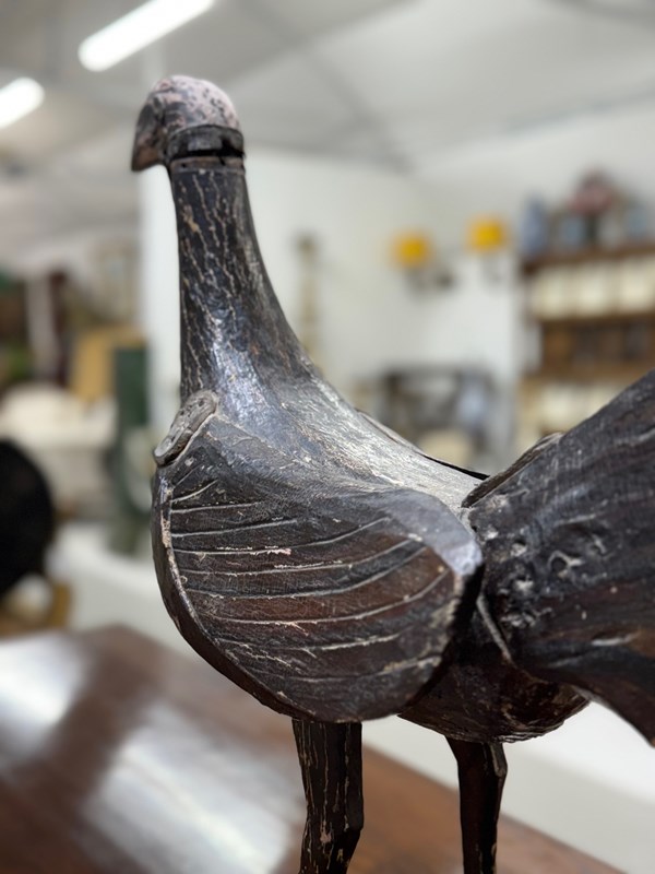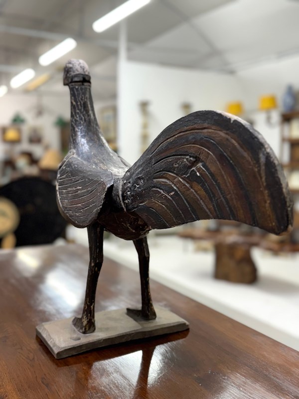 An antique carved wood stylised Bird sculpture, standing on original base.