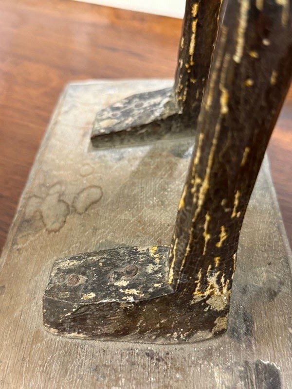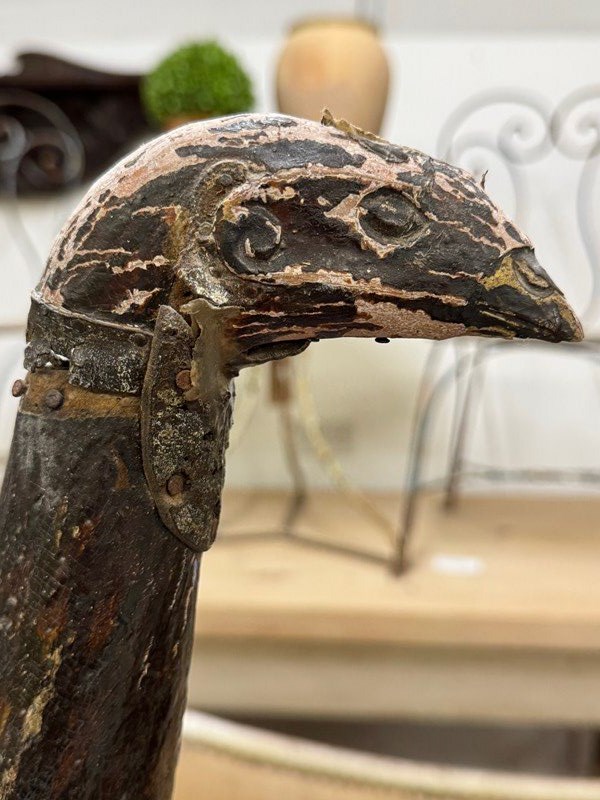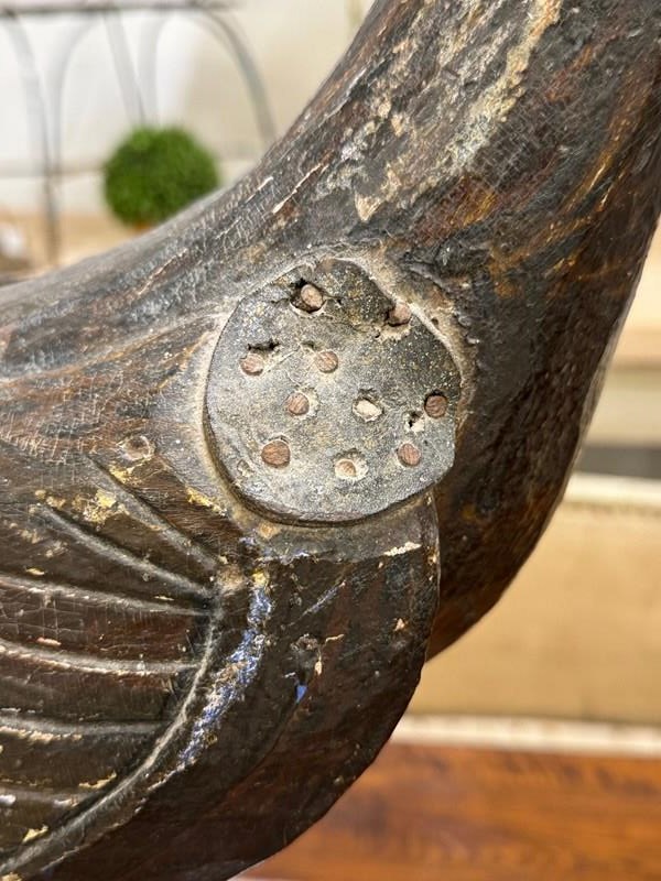 The very old metal plates you can see on the body, tail and neck area are not, I think repairs, but were part of the original construction. Everything was clearly hand made, carved and worked. Even the nails that hold the feet onto the wood base.