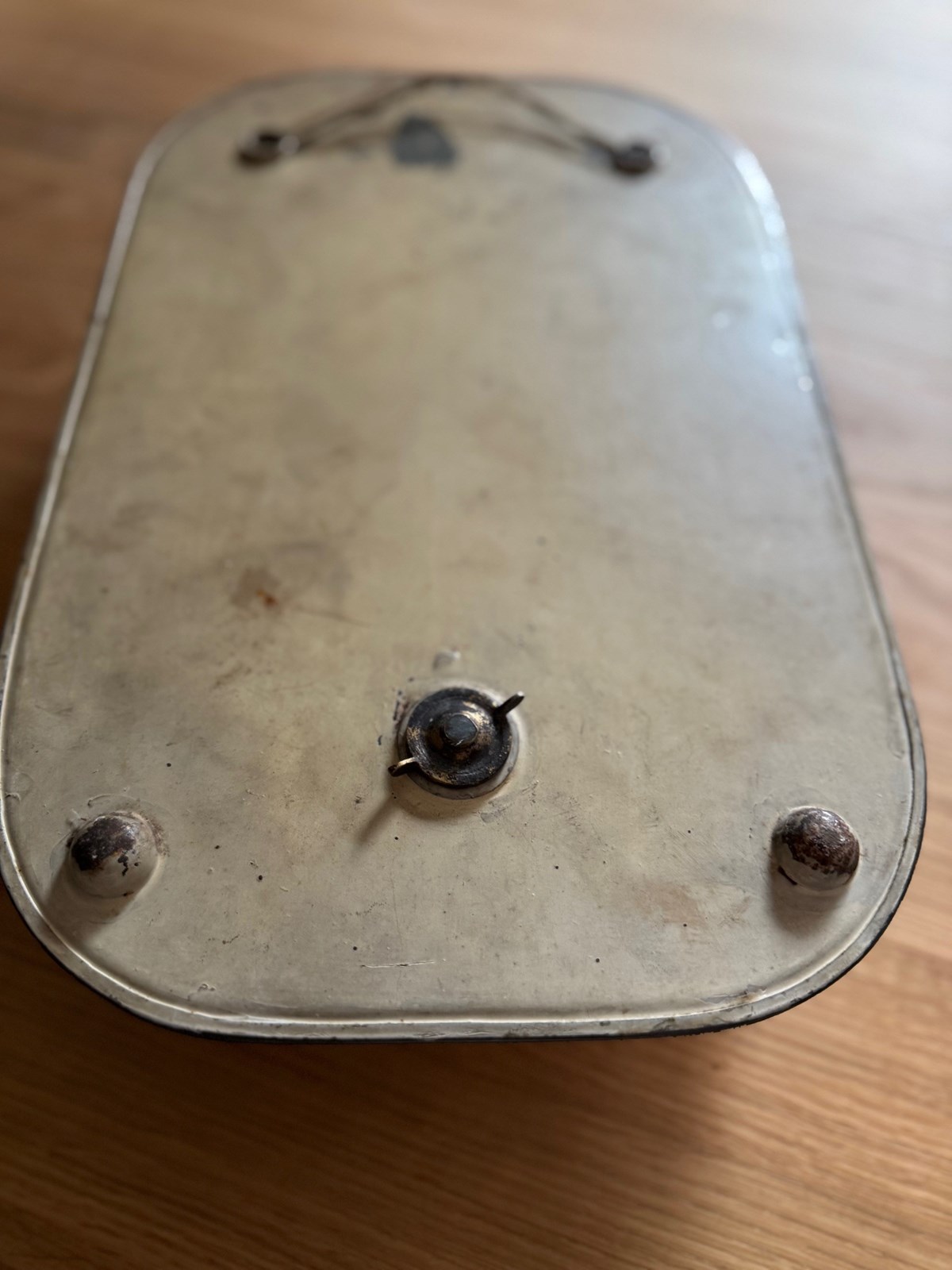 The edge is bordered with a repeating row of small convex bullseyes around the perimeter of the whole frame. To the bottom is the original metal candle holder.
